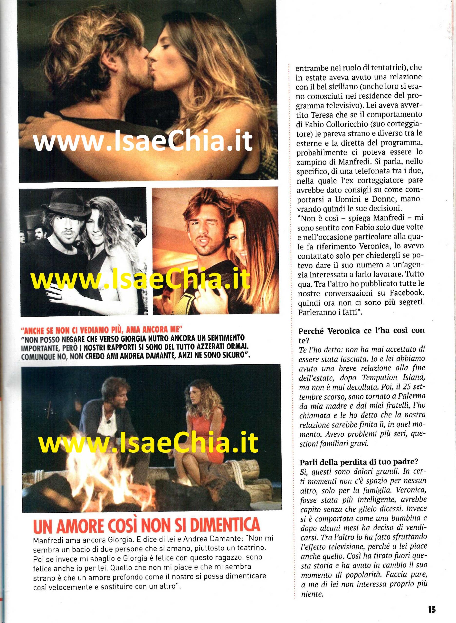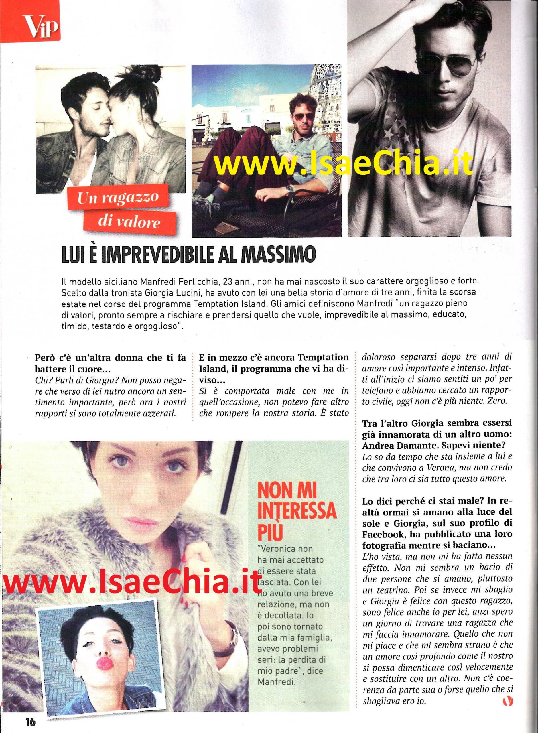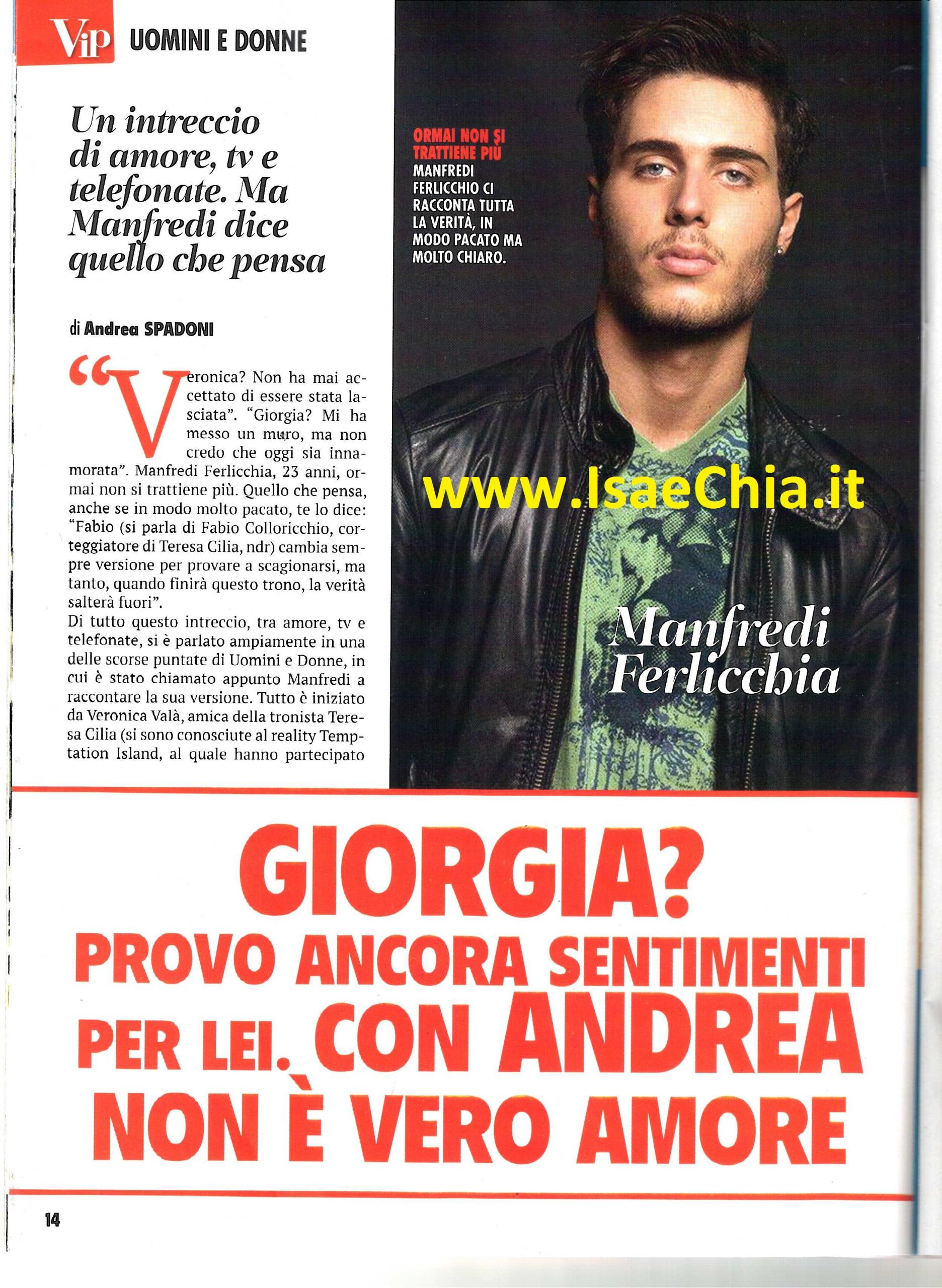 Dopo Temptation Island, in cui aveva messo alla prova il suo amore con Giorgia Lucini, Manfredi Ferlicchia ha avuto una frequentazione con la tentatrice Veronica Valà. Ma durante la sua ultima apparizione a Uomini e Donne, il corteggiatore siciliano ha testimoniato a difesa del corteggiatore Fabio Colloricchio, accusato dalla Valà di essersi accordato con Manfredi per fare delle serate e di essere lì per avere popolarità e non per vero interesse nei confronti della tronista Teresa Cilia. “Non è così” dice ora Manfredi. “Mi sono sentito con Fabio due volte e nell’occasione a cui si riferisce Veronica, l’ho fatto solo per chiedergli se potevo dare il suo numero a un’agenzia per farlo lavorare. Ho pubblicato tutte le nostre conversazioni su Facebook, quindi non ci sono segreti, ora parleranno i fatti. Veronica non ha mai accettato di esser stata lasciata: dopo un periodo di frequentazione, sono sceso a Palermo perché avevo problemi familiari gravi e le ho detto che non sarei tornato. In momenti di grande dolore, come quelli per la perdita di un padre, non c’è spazio per nessun altro, solo per la famiglia. Se fosse stata più intelligente, Veronica avrebbe capito senza che glielo dicessi, invece si è comportata come una bambina e ha deciso di vendicarsi, tra l’altro sfruttando l’effetto televisione, che a lei piace. Ha tirato fuori questa storia ed ha avuto la sua visibilità. Faccia pure, a me non interessa più niente”. Così, dopo questa dichiarazione, gli si chiede se il cuore ad oggi è di un’altra…E lui, a sorpresa, risponde: “Ti riferisci a Giorgia? Non posso negare che per lei provo ancora un sentimento importante, però ora i nostri rapporti si sono azzerati. Si è comportata male con me a Temptation Island, non potevo fare altro che rompere la nostra storia, e dopo tre anni è doloroso. Per un po’ ci siamo sentiti al telefono e avuto un rapporto civile; oggi è finita, zero. So che sta con Andrea Damante, anche lui ex tentatore del programma, e che convivono a Verona. Ma non credo che tra loro ci sia tutto questo amore. Ho visto la foto del loro bacio, ma non mi ha fatto nessun effetto: non mi sembra il bacio di due che si amano, ma piuttosto un teatrino. Poi se invece mi sbaglio e lei è felice con questo ragazzo, sono felice e spero di poter trovare anch’io una ragazza che mi faccia innamorare. Quello che non mi piace e mi sembra strano è che un amore così profondo si possa dimenticare in così poco e sostituire con un altro. Non c’è coerenza da parte sua. O forse, quello che si sbagliava ero io…”