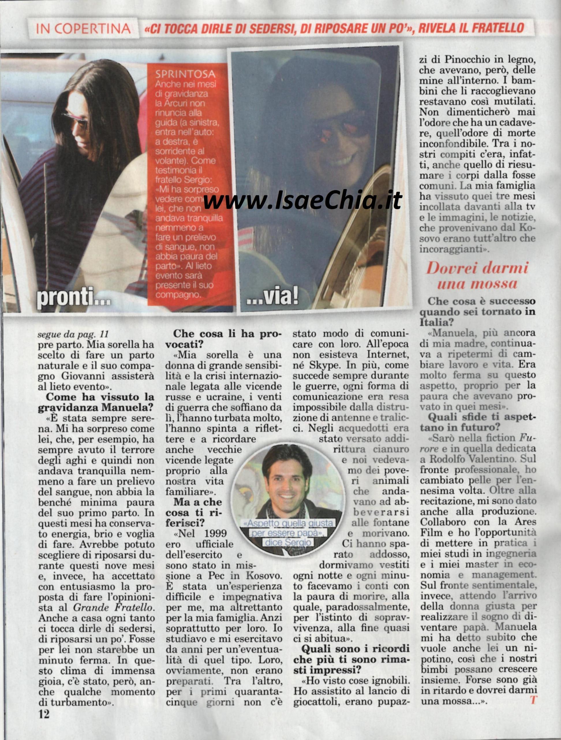 Il primo figlio di Manuela Arcuri è in arrivo e suo fratello, l’attore Sergio Arcuri, commenta: “Ormai manca meno di un mese: l’evento è atteso per l’inizio di maggio. Ora che Manuela mostra un bel pancione comincio a entrare nell’ottica che presto diventerò zio. Noi maschietti, ossia io e Giovanni, il compagno di Manuela, siamo i più agitati. Mia madre è spessissimo a Roma per stare accanto a Manuela e dire che lei non tollera i ritmi frenetici della Capitale! Ho consigliato mia sorella sulla scelta del nome: lei ha la sua lista di preferiti, ma sono certo che lo sceglierà al momento della nascita. Inoltre le ho consigliato un corso pre-parto: ha scelto di avere un parto naturale. Avrebbe potuto scegliere di riposarsi, invece ha lavorato e ha accettato di fare da opinionista al Grande fratello e ha combattuto la sua paura degli aghi per sottoporsi ai controlli. Tuttavia, le vicende legate alla guerra tra Russia e Ucraina l’hanno turbata molto e le hanno ricordato vecchie vicende legate alla nostra vita famigliare. Nel 1999 ero ufficiale dell’esercito e sono stato in missione in Kosovo. E’ stata un’esperienza difficile per me, ma soprattutto per la mia famiglia. Io studiavo e mi esercitavo da anni per un’eventualità come quella, loro, invece, non erano preparati. Per 45 non è stato possibile comunicare con loro e all’epoca internet non era diffuso. Nelle acque era stato versato del cianuro, ci hanno sparato addosso, dormivamo vestiti con la paura di morire. Ho visto cose ignobili, come il lancio di giocattoli con delle mine all’interno. I bambini che li prendevano restavano mutilati. Non dimenticherò mai quell’odore di morte: tra i nostri compiti c’era riesumare i corpi dalle fosse comuni. Manuela continuava a ripetermi di cambiare lavoro e cambiare vita, proprio per la paura che hanno provato in quei mesi”. Ed è così che è diventato attore: “Reciterò nella fiction Rodolfo Valentino, ma debutto anche come produttore: ho l’opportunità di mettere in pratica i miei studi in ingegneria e i miei master in economia e management. Sul fronte sentimentale, sto aspettando la donna giusta per realizzare il sogno di diventare papà e dare a Manuela anche un nipotino!”