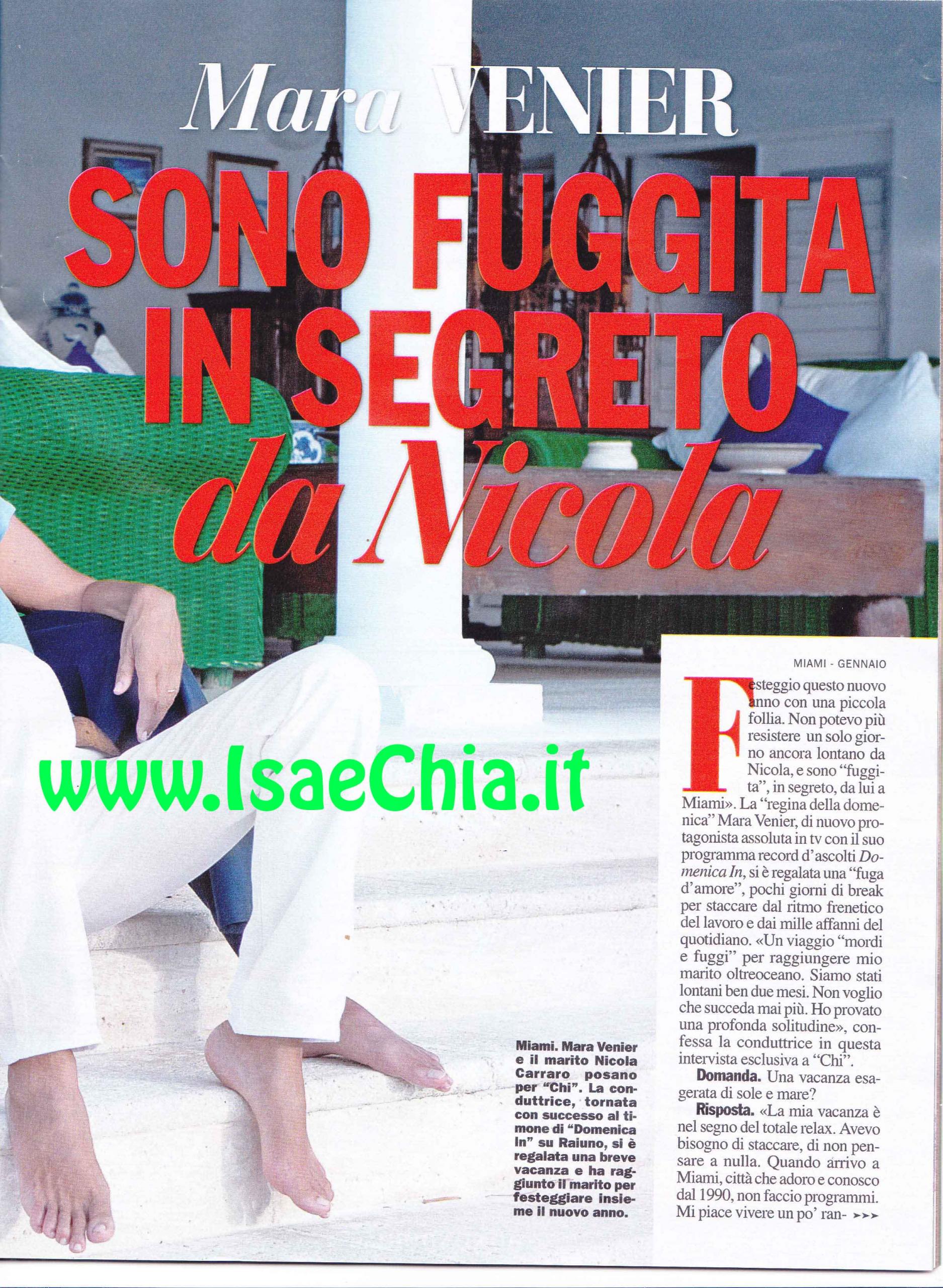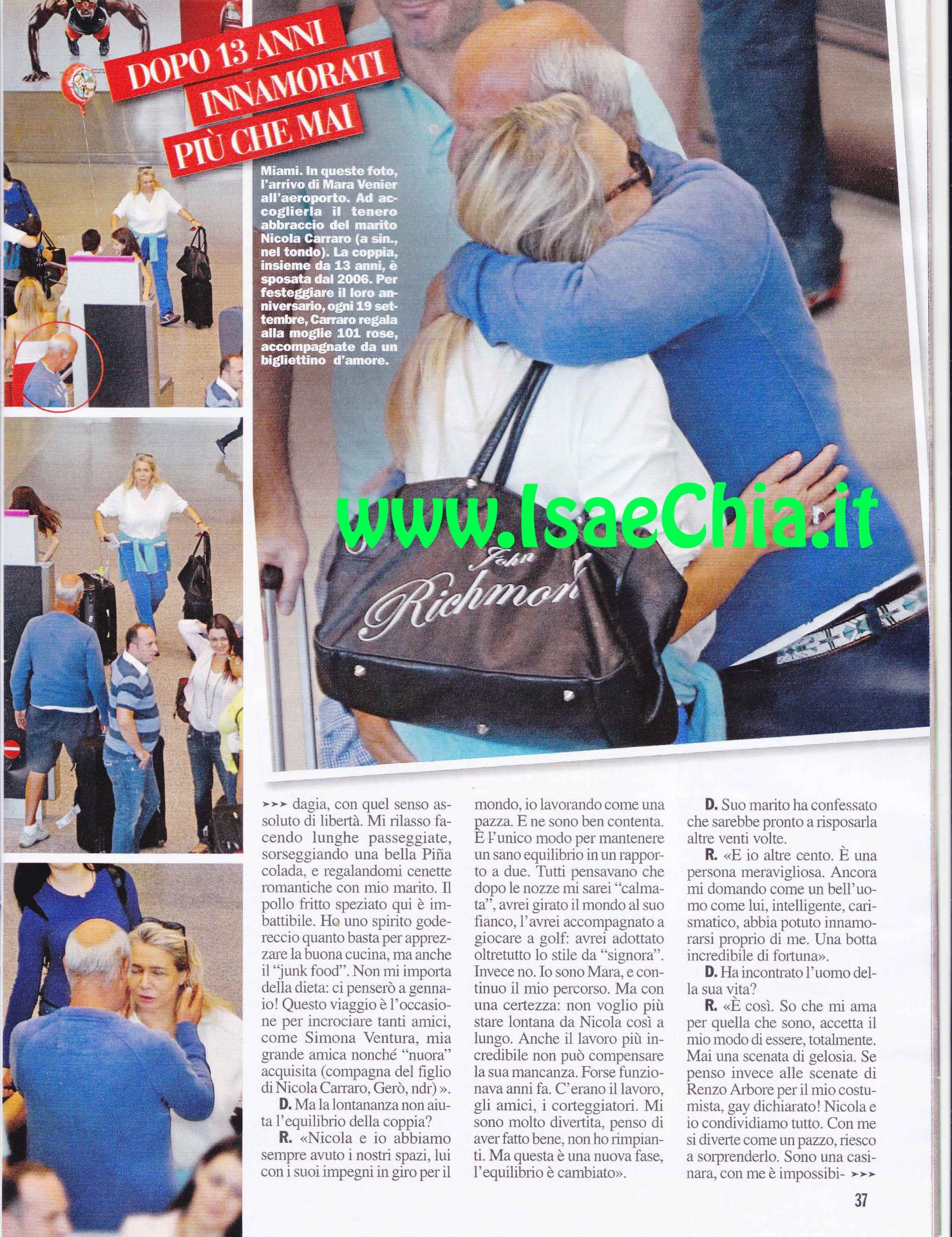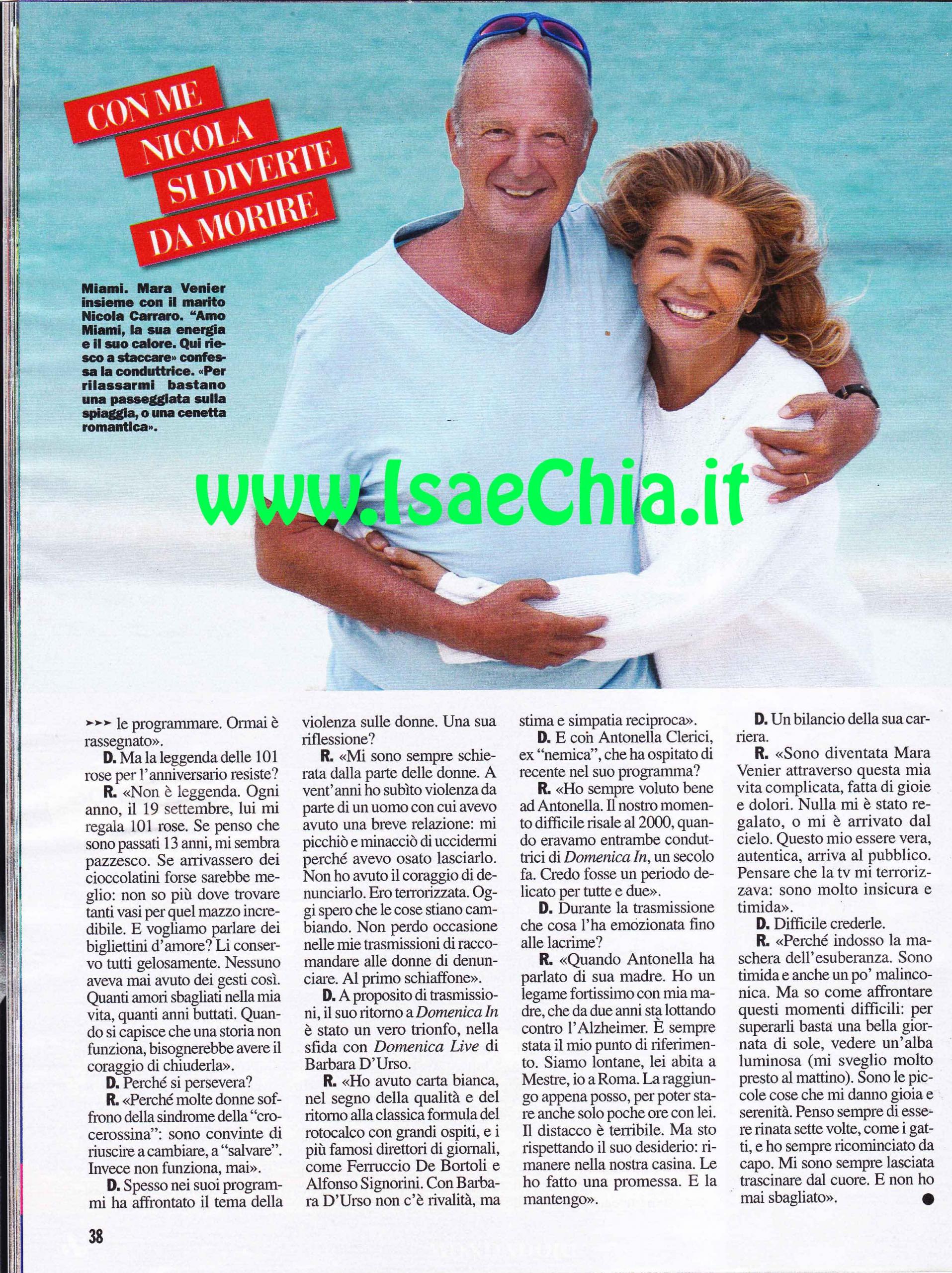 La conduttrice Mara Venier rivela la sua follia: “Non potevo più resistere un solo giorno ancora lontano da mio marito Nicola Carraro, così sono fuggita, in segreto, da lui a Miami. Siamo stati lontani ben due mesi e non voglio che accada più. Ho provato una profonda solitudine. E’ stata una vacanza di totale relax, avevo bisogno di staccare la spina. Quando arrivo a Miami, città che conosco dal 1990, non programmo niente. Mi rilasso facendo lunghe passeggiate e regalandomi delle cenette con mio marito: il pollo speziato qui è imbattibile. Non mi importa della dieta, ci penserò poi! Questo è il posto per incontrare degli amici, come Simona Ventura, che è la mia “nuora” acquisita in quanto compagna del figlio di mio marito. Io e Nicola abbiamo sempre avuto i nostri spazi: lui in giro per il mondo con gli amici e io qui a lavorare, ma ne sono contenta: è l’unico modo sano per mantenere in equilibrio un rapporto. Tutti pensavano che dopo il matrimonio l’avrei seguito per il mondo e adottato uno stile da signora, ma io sono Mara e continuo il mio percorso. Lo risposerei altre 100 volte: è una persona meravigliosa. Ancora mi domando come un uomo intelligente e carismatico come lui si sia innamorato di me. Una botta incredibile di fortuna. Mi accetta per quella che sono, mai una scenata di gelosia e condividiamo tutto. Ogni anno, per l’anniversario, mi regala 101 rose. Ma se arrivassero dei cioccolatini sarebbe meglio: non ho vasi dove metterle! Quanti amori sbagliati nella mia vita, quanti anni buttati! Quando si capisce che una storia non funziona, si dovrebbe avere il coraggio di chiuderla”. Infatti la signora di Domenica In confessa: “A vent’anni ho subito violenza da un uomo perché avevo osato lasciarlo. Non ho avuto il coraggio di denunciarlo, ero terrorizzata. Ora non perdo occasione per ricordare alle donne di farlo”. Della “concorrenza” con Domenica Live, dice: “Con Barbara D’Urso non c’è competizione, ma stima e simpatia reciproca”, mentre di Antonella Clerici spiega: “Le ho sempre voluto bene, ma il nostro periodo difficile risale al 2000: credo fosse un periodo delicato per entrambe. Mi ha emozionata quando ha parlato di sua madre. Mia madre lotta con l’Alzheimer da due anni ed è voluta rimanere nella sua casa di Mestre, quindi appena posso vado da lei, anche solo per qualche ora”. Infine, fa un bilancio della sua carriera: “Nulla mi è stato regalato, questo mio essere vera, autentica, arriva al pubblico. In realtà sono timida e malinconica, ma indosso la maschera dell’esuberanza. Sono le piccole cose che mi danno serenità, mi sono sempre lasciata trascinare dal cuore, e non ho mai sbagliato”.