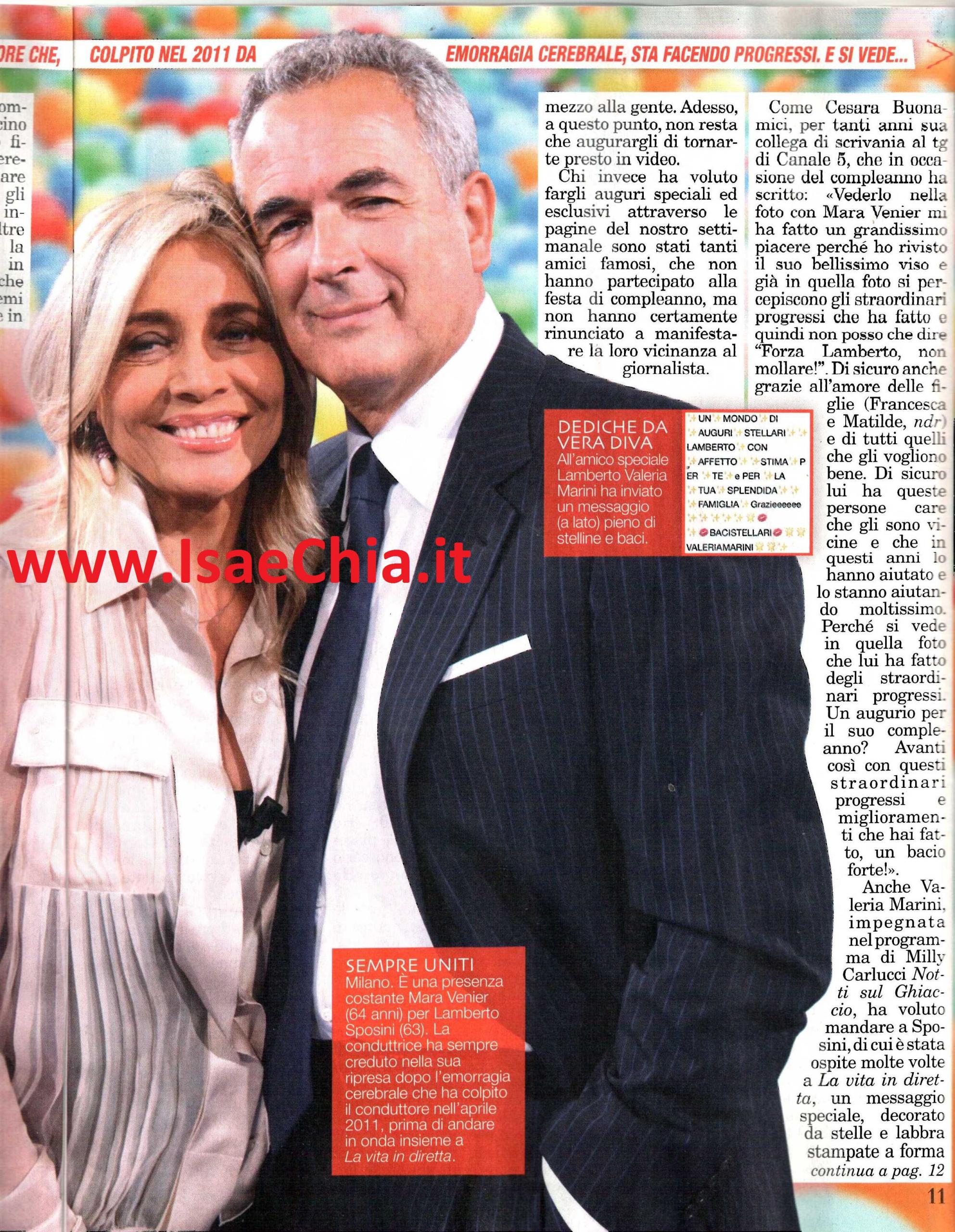 Il 29 aprile 2011 il giornalista e conduttore Lamberto Sposini è stato colpito da un’emorragia cerebrale poco prima di andare in diretta con La vita in diretta con la collega Mara Venier. Da quel duro colpo ricevuto, si può dire che oggi Lamberto stia molto meglio e lo conferma una foto pubblicata dalla Venier, che lo chiama “il mio amore” su Instagram: il 18 febbraio ha festeggiato con lei il suo 63° compleanno, con tanto di cappello a forma di torta e soprattutto con altre persone, il che testimonia che Lamberto è finalmente in grado di uscire in pubblico. Tanti sono stati gli auguri e i pensieri felici dei colleghi, prima tra tutte la giornalista Cesara Buonamici, che condivideva con lui lo studio del TG5: “Vederlo nella foto mi ha fatto un grandissimo piacere perché ho rivisto il suo bellissimo viso e si percepiscono i miglioramenti fatti. Non posso che dire ‘Forza Lamberto, non mollare’! Di sicuro anche grazie all’amore delle figlie Francesca e Matilde e di tutti quelli che gli vogliono bene. Di sicuro coloro che gli sono stati vicini in questi anni lo hanno aiutato e lo stanno aiutando. Un augurio per il suo compleanno? Avanti così con questi straordinari miglioramenti che stai facendo!“. Anche l’ex naufraga Valeria Marini, ora impegnata con il programma Notti sul ghiaccio di Milly Carlucci e che è stata spesso ospite de La vita in diretta, gli ha mandato un messaggio speciale: “Un mondo di auguri stellari, Lamberto. Con affetto e stima per te e la tua splendida famiglia“, mentre Carolyn Smith, che era con lui nella giuria di Ballando con le stelle, gli ha inviato un video in cui cantava Happy birthday in inglese. La showgirl Loredana Lecciso, invece, dice: “Ho conosciuto Lamberto quando ero ospite a La vita in diretta. Con Mara compone una coppia formidabile e colgo l’occasione del suo compleanno per fare i miei migliori auguri a lui ed esprimere un ‘grazie’ a Mara per come gli sta vicino in questo momento“. Per lui arrivano gli auguri di buon compleanno e pronta guarigione anche dall’ex fatina della tv ed ex naufraga dell’Isola dei famosi Maria Giovanna Elmi, della conduttrice Alda D’Eusanio, e anche da alcuni ex concorrenti di Ballando con le stelle, come Hoara Borselli, Manuela Aureli e Cecilia Capriotti: “Ho avuto il piacere di conoscerlo a Ballando” dice quest’ultima. “Ho apprezzato non solo la sua professionalità, ma anche la sua umanità: una persona gentile, con dei valori importanti. Gli auguro tanta felicità e spero di vederlo di nuovo sul piccolo schermo: abbiamo bisogno di persone così nella nostra tv“. L’ex Miss Italia Claudia Andreatti, invece, commenta: “E’ stata una gioia vederlo circondato dai sorrisi. E’ un grande gentleman. Lo conobbi a La vita in diretta e mi colpì per il suo à plomb e per il suo ‘essere sul pezzo’ senza ostentarlo. Dopo la sua tragedia è venuto fuori anche il suo lato dolce e gentile“. Infine, gli auguri anche da parte di due storici maestri di ballo di Ballando con le stelle, Samanta Togni e Simone Di Pasquale: “Sarebbe bello poterlo incontrare nuovamente” osserva quest’ultimo. Un auspicio che sottoscrivono proprio tutti!