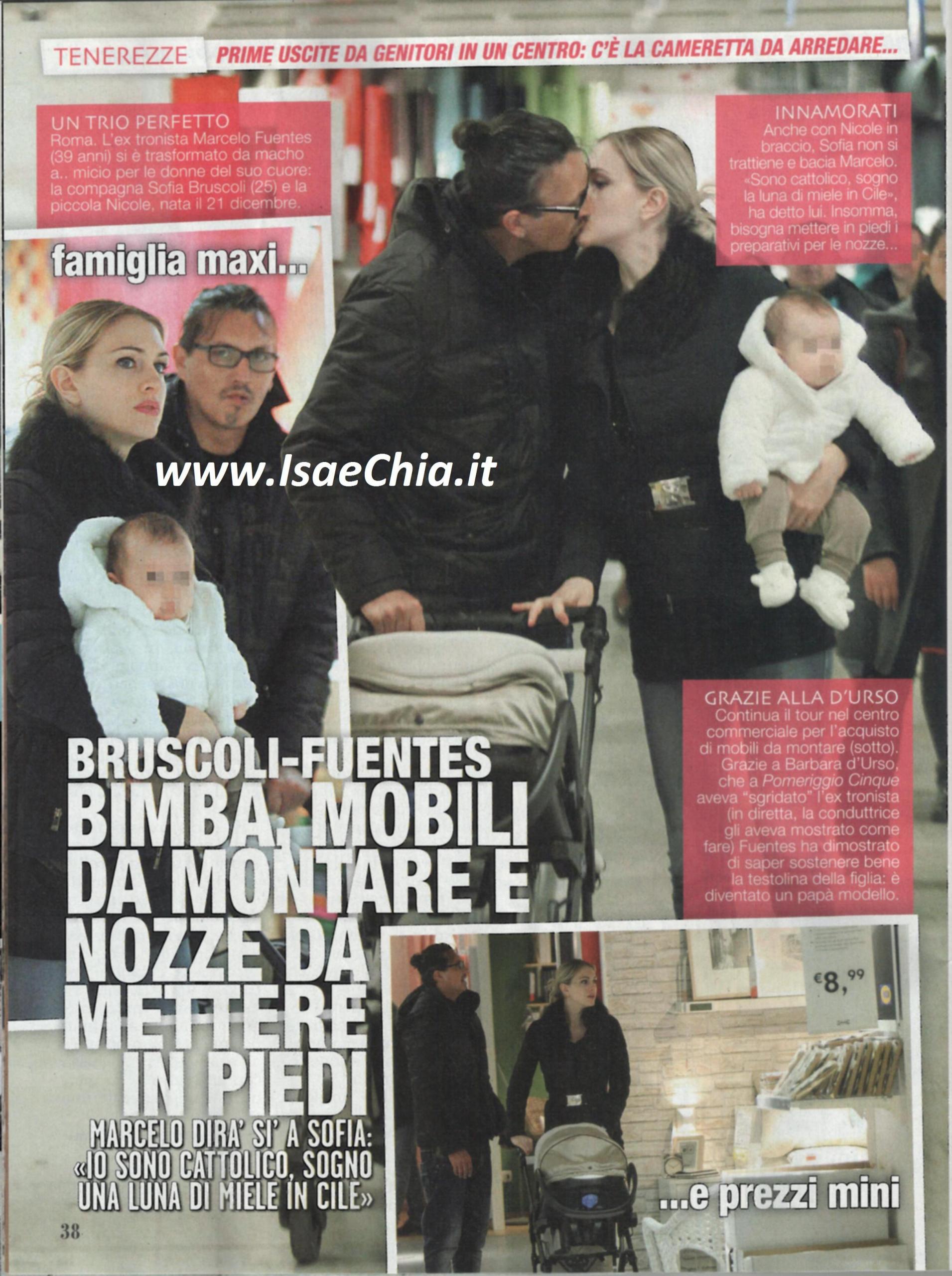 L’ex tronista Marcelo Fuentes si è trasformato da macho a micio per le donne del suo cuore: la bella Sofia Bruscoli e la piccola Nicole, nata il 21 dicembre. Eccoli nella loro prima uscita pubblica ufficiale, nel centro commerciale Ikea di Roma: la Miss ed ex protagonista di Ballando con le stelle non si trattiene nemmeno con Nicole in braccio e bacia Marcelo. L’ex tronista, a sua volta, ha dichiarato: “Sono cattolico e sogno la nostra luna di miele in Cile, mio paese d’origine”. Le nozze, quindi, si direbbero vicine. Nel frattempo, lui impara a fare il papà (dopo esser stato rimproverato in diretta tv da Barbara D’Urso per non aver saputo mantenere la testolina della figlia!) e il trio comincia a…metter su casa!