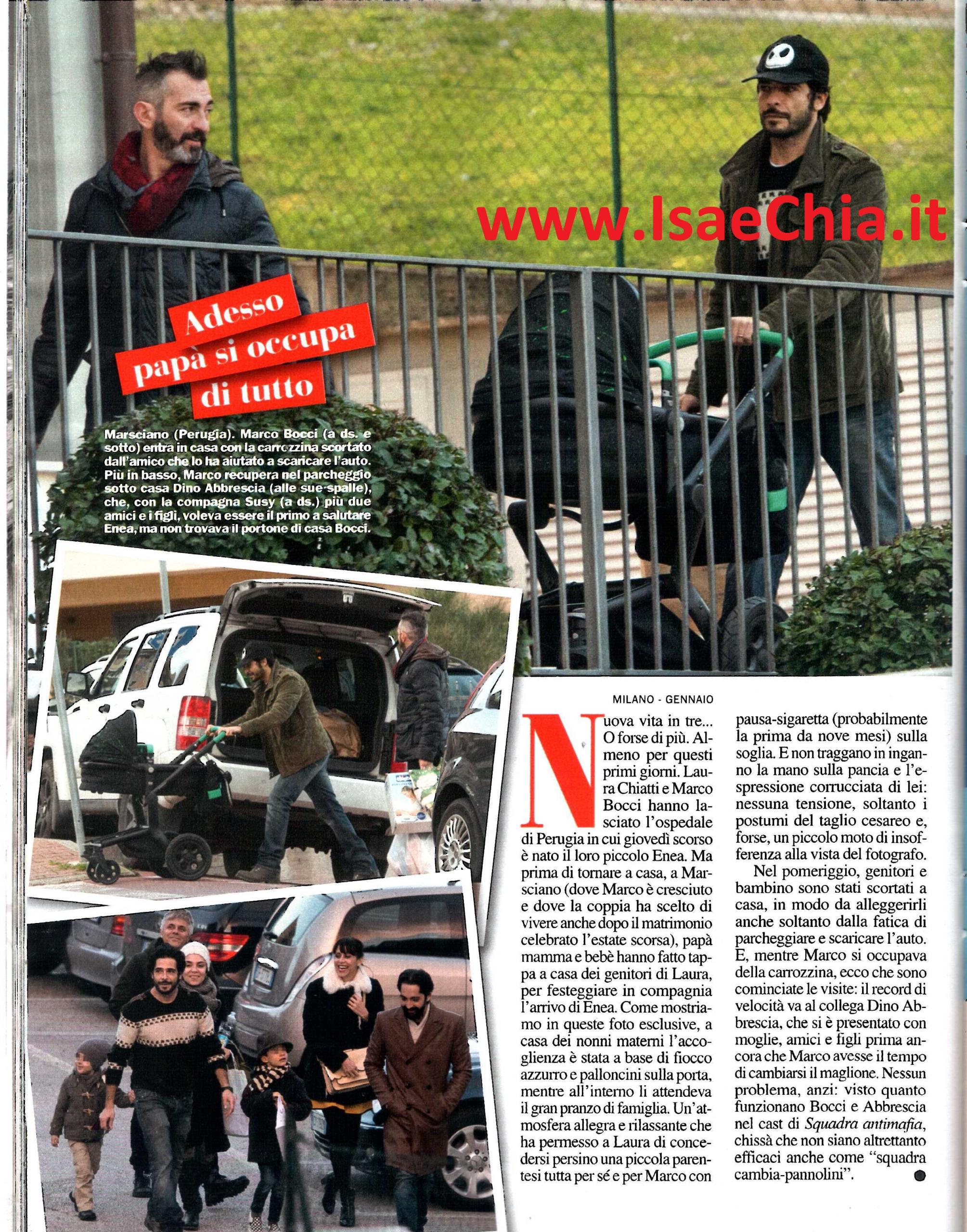 Solo poche settimane fa, il bell’attore Marco Bocci era stato beccato in “libera uscita” in giro per l’Italia per una serata in discoteca, dove le fan lo hanno praticamente accerchiato. Nel frattempo, la moglie Laura Chiatti, sposata lo scorso luglio, era a casa, con un pancione da nove mesi di gravidanza. Di lì a poco, Laura e Marco avrebbero dato il via ad una nuova fase della loro vita, che ora è una vita a tre: il 22 gennaio è nato il piccolo Enea. Il settimanale Chi ha fotografato gli attori umbri mentre lasciavano l’ospedale di Perugia: prima di tornare a casa a Marsciano, dove il protagonista di Squadra Antimafia è cresciuto, hanno fatto tappa a casa dei genitori di Laura per festeggiare l’arrivo del piccolo. A casa dei nonni, l’accoglienza è stata a base di fiocchi azzurri e palloncini, mentre all’interno li attendeva un gran pranzo di famiglia. Un’atmosfera tranquilla, che ha dato a Laura la possibilità di concedersi una pausa sigaretta con Marco (probabilmente la prima dopo nove mesi). Nel pomeriggio, genitori e bambino sono stati scortati a casa, per alleggerirli anche nella fatica di scaricare l’auto. E mentre Marco si occupava della carrozzina, sono arrivate le prime visite a tempo di record: il collega Dino Abbrescia si è presentato con moglie e figli prima che Marco potesse entrare in casa! Infine, è finalmente arrivato il primo scatto di Bocci in versione papà: l’attore ha presentato il primogenito a tutti su Twitter con un tenero scatto!