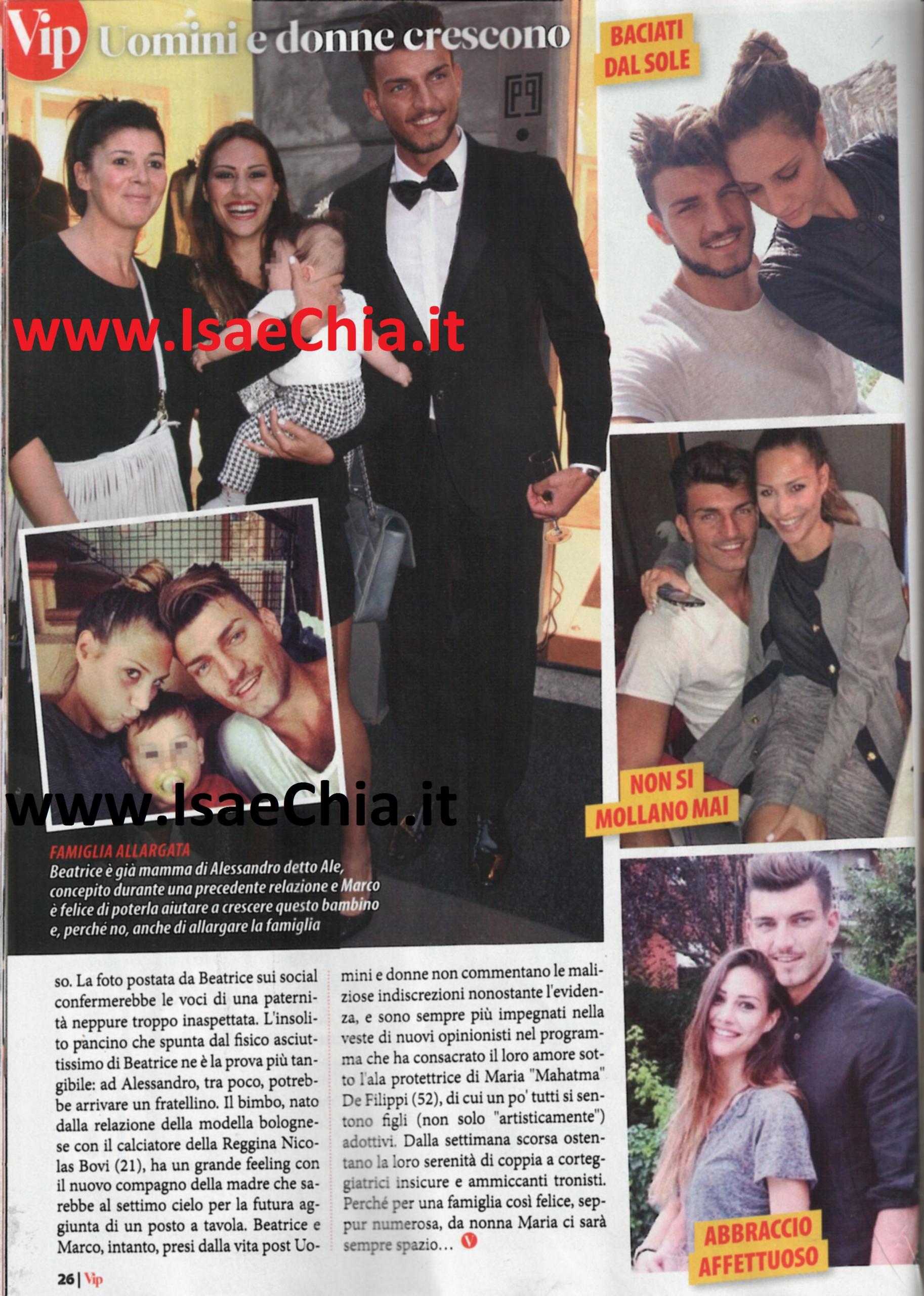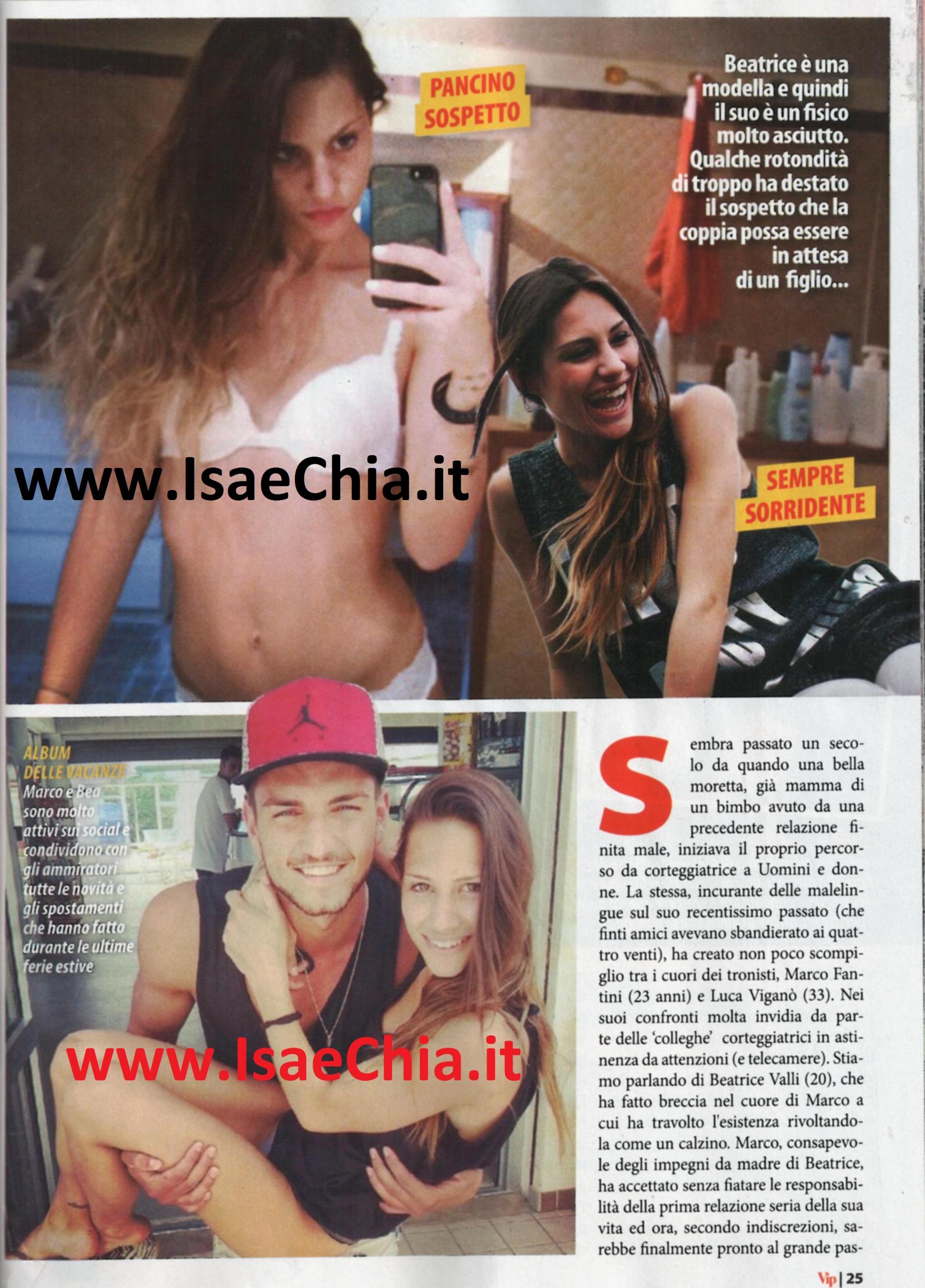 E’ passato qualche mese da quando Marco Fantini ha scelto tra le sue corteggiatrici Beatrice Valli, la bella ventenne che durante il suo percorso a Uomini e donne ha alimentato tante critiche per il fatto di essere una giovanissima madre e perché era contesa tra Marco e Luca Viganò. Marco, consapevole degli impegni di Beatrice, ha scelto di accettare le responsabilità della prima relazione seria della sua vita e pare sia anche pronto a fare qualcosa di più. Negli scorsi giorni, infatti, la coppia è tornata a Uomini e donne e si è mostrata raggiante e sempre più unita: lui le ha fatto un bellissimo omaggio floreale. Adesso, pare che ci sia un’altra indiscrezione: le voci di una paternità, forse neanche troppo inaspettata. La prova? Una foto di Beatrice con un pancino piuttosto insolito. Per Alessandro, quindi, potrebbe arrivare un fratellino e ne sarebbe contento anche il padre del piccolo, il calciatore della Reggina Nicolas Bovi, che ha un grande feeling con Marco. E quest’ultimo, dopo aver fatto un po’ di pratica con Ale, potrebbe voler provare con un figlio suo. Che i due seguano a ruota Eugenio Colombo e Francesca Del Taglia? La benedizione di Maria De Filippi è già arrivata…