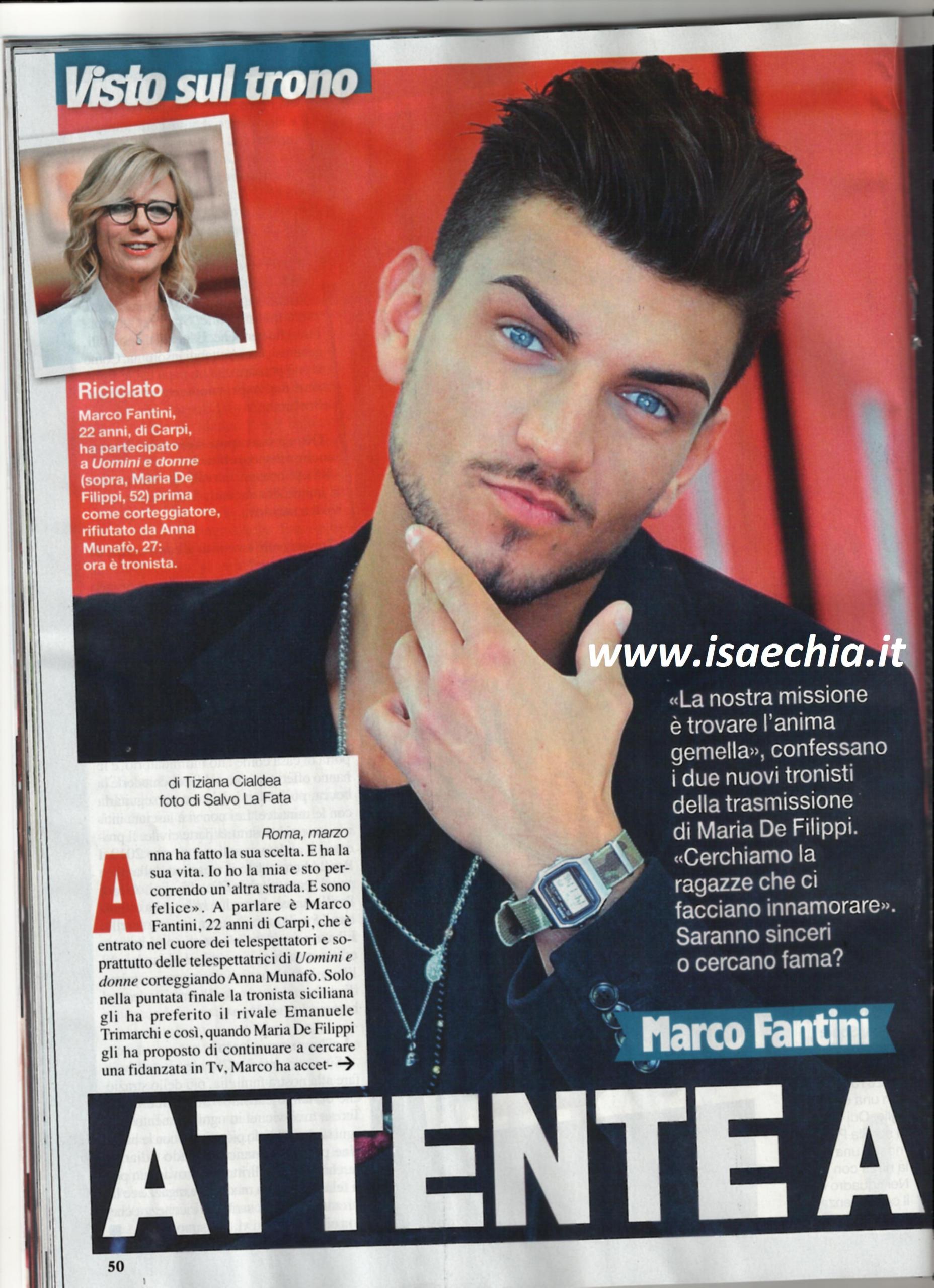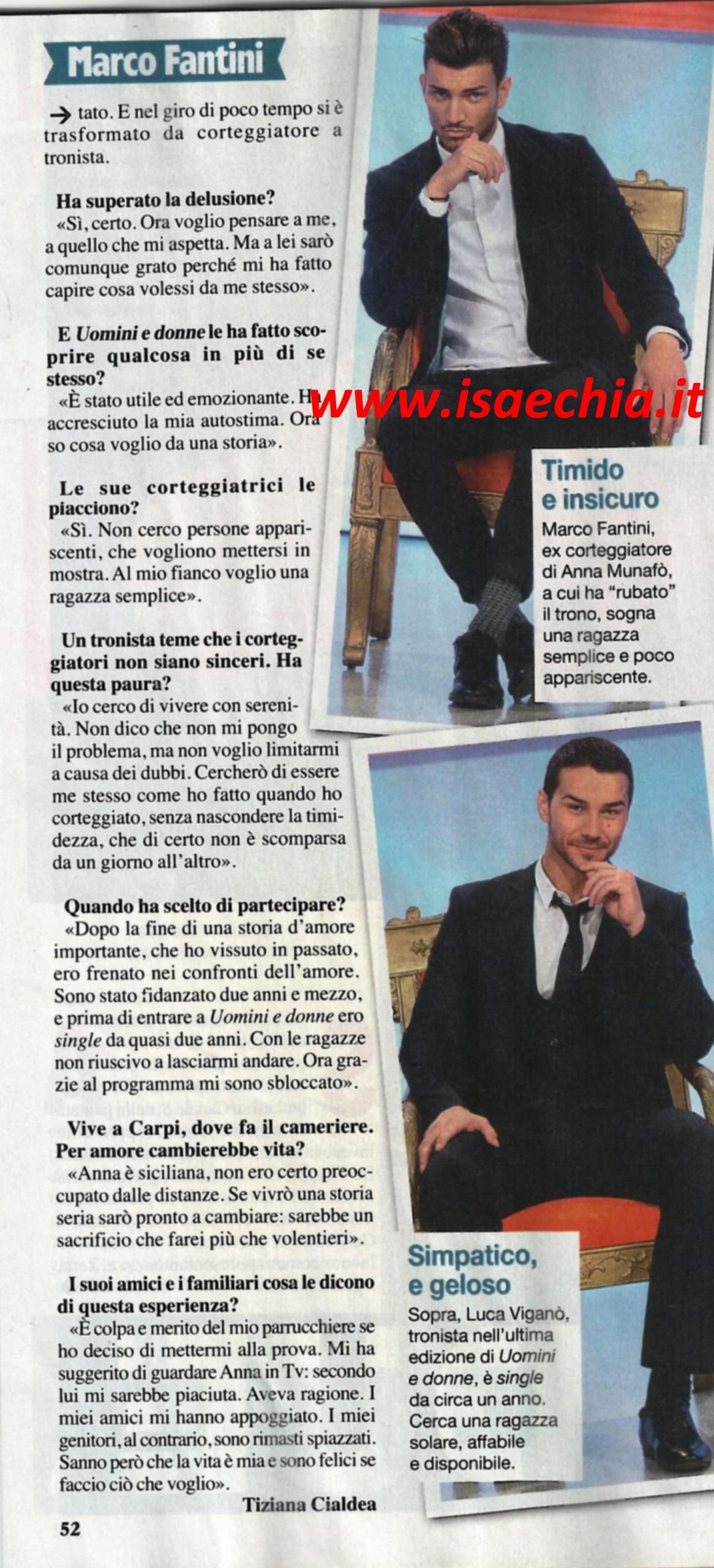 Da corteggiatore di Anna Munafò, Marco Fantini adesso è stato scelto da Maria De Filippi come nuovo tronista di Uomini e donne. Quando gli si chiede se ha superato la delusione, risponde: “Sì certo. Ora voglio pensare a me, a quello che mi aspetta. Ma a lei sarò sempre grato perché mi ha fatto capire cosa volessi da me stesso. Uomini e donne è stato utile ed emozionante: ha accresciuto la mia autostima e ora so che cosa voglio. Le mie corteggiatrici mi piacciono, cerco una donna non appariscente, una ragazza semplice. Non dico che non voglio pormi dubbi sulla loro sincerità, ma cercherò di essere me stesso, senza nascondere la mia timidezza, che non è scomparsa da un giorno all’altro. Avevo scelto di partecipare dopo la fine di una storia d’amore importante, durata due anni e mezzo, che mi aveva frenato nei confronti dell’amore. Con le ragazze non riuscivo a lasciarmi andare”. Quando gli si chiede se lascerebbe la sua città, Carpi, e cambierebbe vita per amore, risponde: “Anna era siciliana e non ero certo preoccupato per le distanze. Se vivrò una storia seria, sarò disposto a cambiare: sarebbe un sacrificio che farei volentieri. Il mio parrucchiere mi aveva suggerito di guardare Anna in tv, che secondo lui mi sarebbe piaciuta, e aveva ragione. I miei amici mi hanno appoggiato, mentre i miei genitori sono rimasti spiazzati. Sanno, però, che la vita è mia e faccio quello che voglio”.