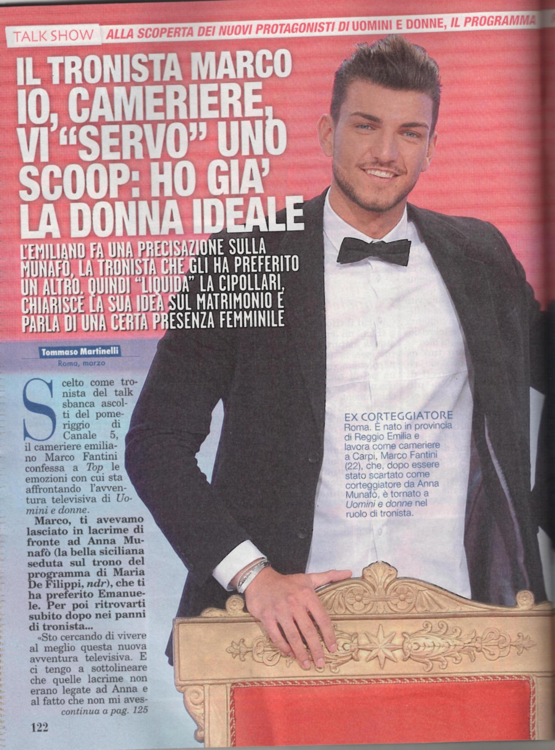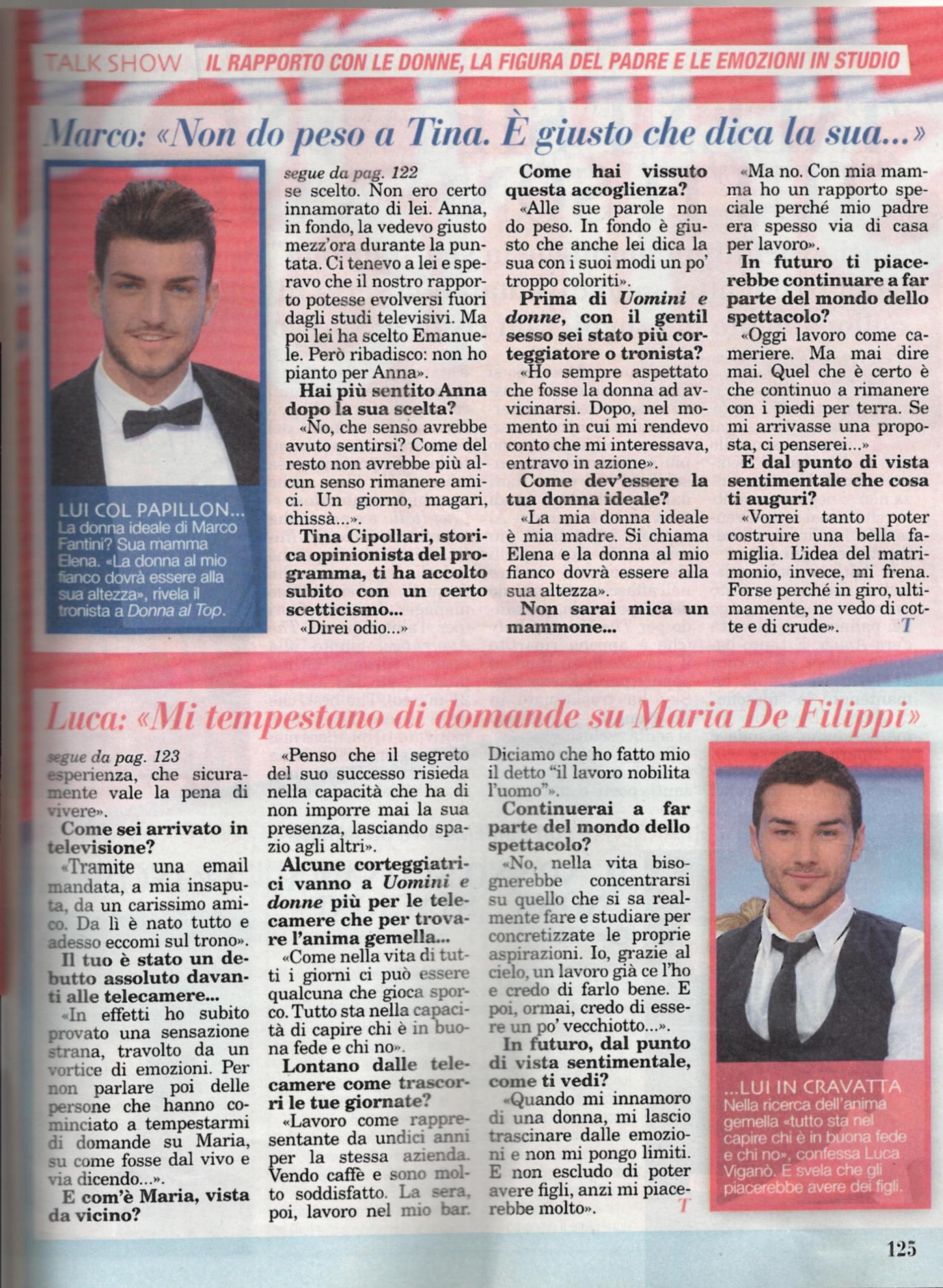 Marco Fantini e Luca Viganò sono i nuovi tronisti di Uomini e donne. Il primo, cameriere emiliano, ha deciso di ripartire dopo la delusione causatagli da Anna Munafò: “Tengo a precisare che quelle lacrime non erano legate a Anna e al fatto che non mi avesse scelto: non ero certo innamorato di lei. In fondo, la vedevo solo mezz’ora dopo la puntata. Ci tenevo a lei e speravo che i nostri rapporti potessero evolversi dopo il programma, ma lei ha scelto Emanuele Trimarchi. Non ci siamo più sentiti: che senso avrebbe rimanere amici? Alle parole di Tina Cipollari, che mi ha accolto con odio, non do peso: è giusto che dica la sua, anche se con modi troppo coloriti. In passato, ho sempre aspettato che le donne si avvicinasse e quando capivo che le interessavo, entravo in azione. La mia donna ideale è mia madre Elena: la donna al mio fianco dovrà essere alla sua altezza. Con lei ho un rapporto speciale perché mio padre era spesso via di casa per lavoro. Oggi lavoro come cameriere e rimango coi piedi per terra, ma se dovesse arrivare qualche proposta ci penserei!”.