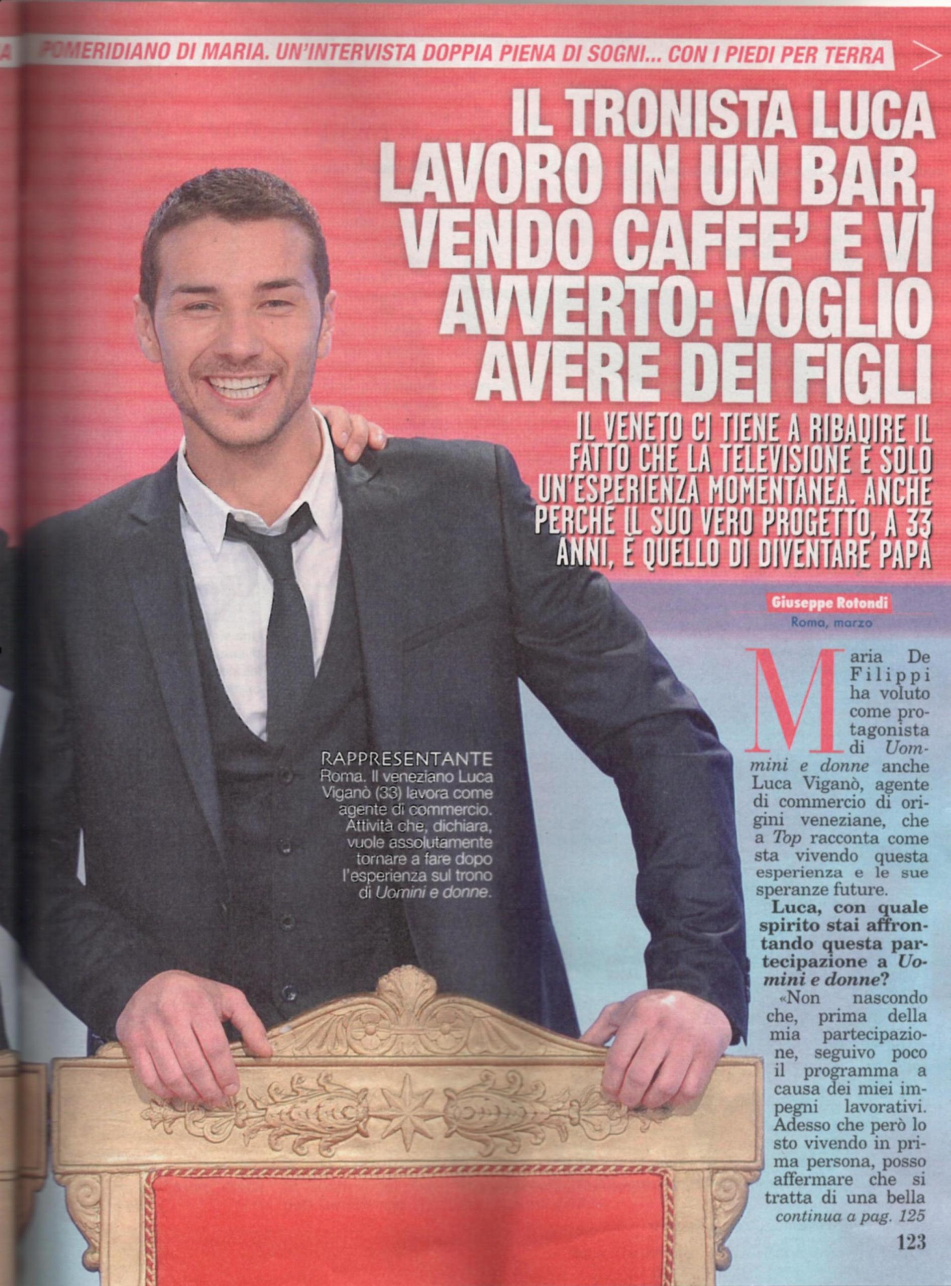 Luca, invece, racconta: “Prima della mia partecipazione non seguivo molto il programma per impegni lavorativi; sono arrivato in trasmissione grazie a un’e-mail mandata da un mio amico a mia insaputa. Tutti mi hanno chiesto come fosse Maria De Filippi: credo che il successo sia dovuto al non imporre la sua presenza, lasciando spazio agli altri. Lavoro come rappresentante di caffè da 11 anni e di sera lavoro nel mio bar, sono soddisfatto. Non cerco lavoro in tv, credo che bisogni concentrarsi su quello che si sa fare e il mio lavoro credo di saperlo fare bene. Tra le corteggiatrici può esserci qualcuna che gioca sporco, ma tutto sta nel capire chi è in buona fede e chi no. Quando mi innamoro, mi lascio andare alle emozioni e non mi pongo limiti. Non escludo di poter avere dei figli: mi piacerebbe molto!”