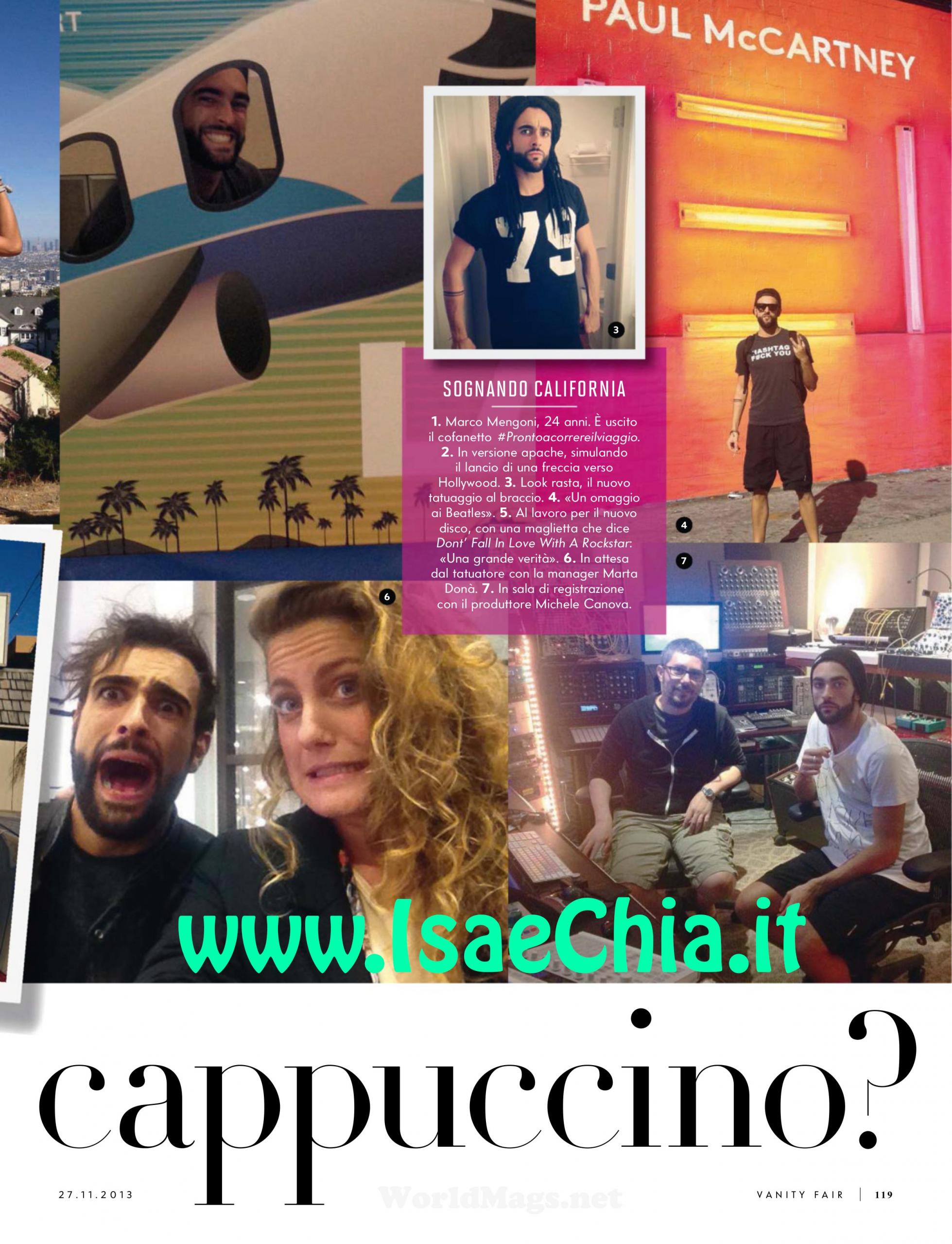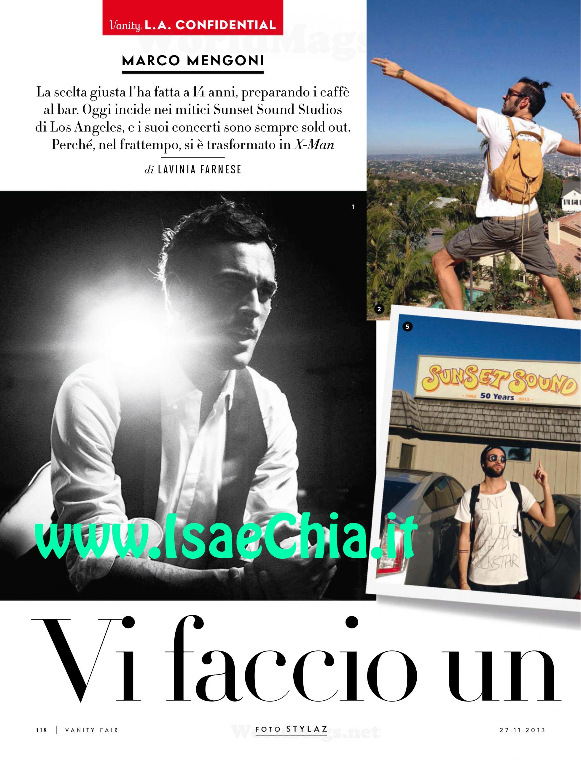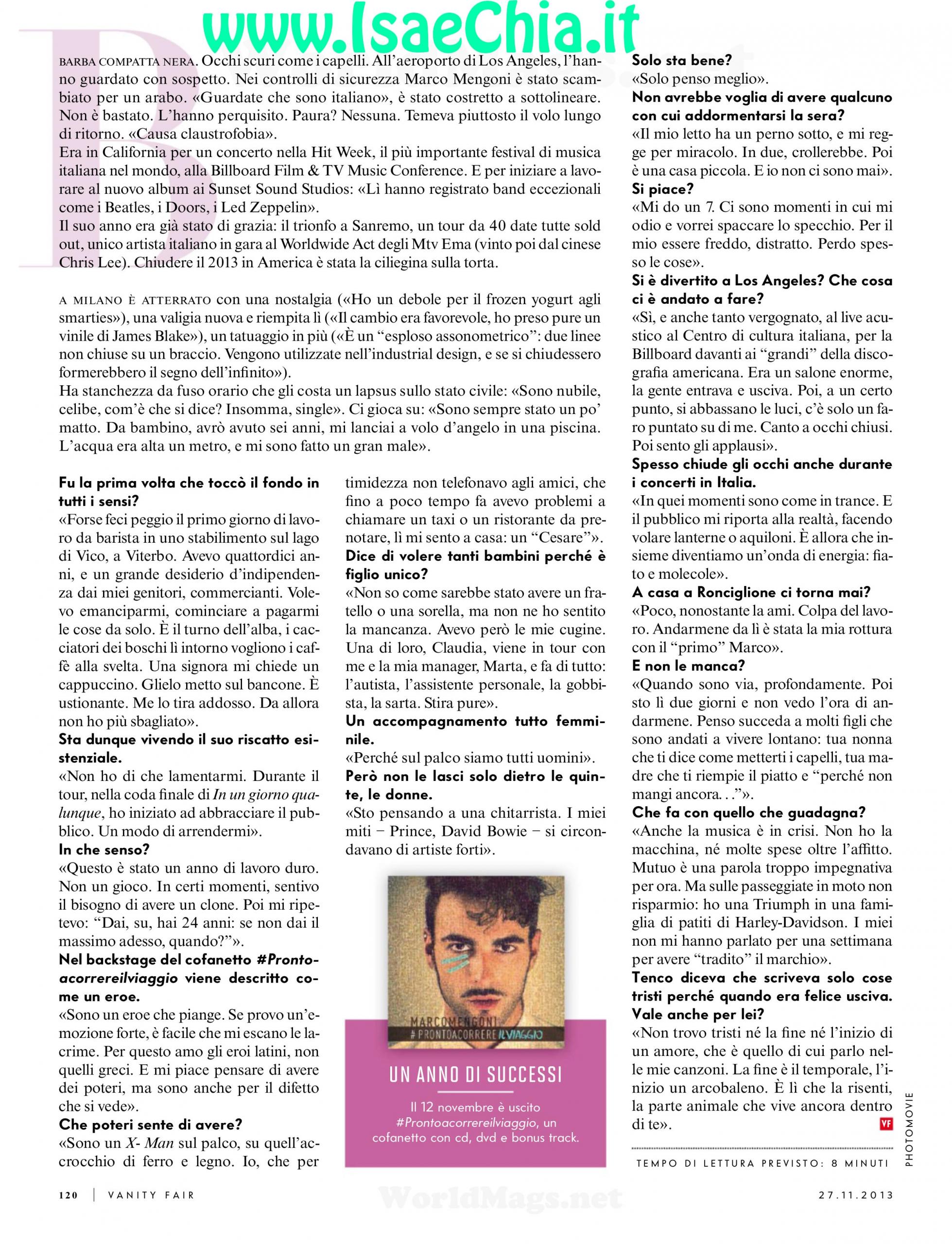 Il vincitore di X Factor e dell’ultimo festival di Sanremo Marco Mengoni è stato il California in occasione della Hit Week, il più importante festival di musica italiana al mondo ed è stato fermato all’aeroporto: “Mi hanno scambiato per un arabo. Ho dovuto spiegare che ero italiano! Non ho avuto paura, piuttosto, ne avevo del lungo viaggio, causa claustrofobia”. Marco rivela che è tornato in Italia con nostalgia: “Adoro il frozen yogurt agli smarties, il cambio era favorevole e ho un tatuaggio in più: due linee che se si chiudessero, sarebbero il segno dell’infinito. Sono sempre stato folle: a 6 anni mi lanciai in una piscina nell’acqua alta un metro e mi feci un gran male. A 14 volevo rendermi indipendente dai miei e andai a lavorare come barista. Servii ad una signora un cappuccino ustionante e lei me lo tirò addosso: lì ho toccato il fondo!”. Invece, ora la vita è diversa per lui: “E’ stato un anno di lavoro duro, a volte sentivo l’esigenza di un clone. Sono un eroe che piange: se provo un’emozione forte, è facile che mi escano le lacrime. Sul palco sono un X-man, io che per timidezza non telefonavo agli amici e non chiamavo i taxi”. Quando gli si chiede se vuole tanti bambini perché è figlio unico, racconta: “Non ho sentito la mancanza dei fratelli, sono cresciuto coi cugini; mia cugina Claudia viene con me in tour ed è la mia manager”, mentre quando gli si chiede se è single, risponde: “Da solo penso meglio. Il mio letto ha un perno sotto, mi regge per miracolo. In due, crollerebbe. Poi è una casa piccola, e io non ci sono mai. Mi do un 7: ci sono momenti in cui mi odio e vorrei spaccare lo specchio, per il mio essere freddo e distratto: perdo spesso le cose”. Marco racconta così l’esperienza negli USA: “Canto per la Billboard davanti ai discografici americani, un salone enorme. Poi si abbassano le luci, solo un faro su di me. Chiudo gli occhi, canto e poi sento gli applausi. In quei momenti sono come in trance, è il pubblico che mi riporta alla realtà”. Quando gli si chiede se gli manca Ronciglione, la città natale, dice: “Non ci torno spesso: quando sono via, mi manca profondamente. Quando sono lì, non vedo l’ora di andarmene. Cosa faccio con quello che guadagno? Non ho la macchina, né molte spese oltre l’affitto. Mutuo è una parola ancora troppo impegnativa. Ho una Triumph e non mi risparmio le passeggiate in moto”.