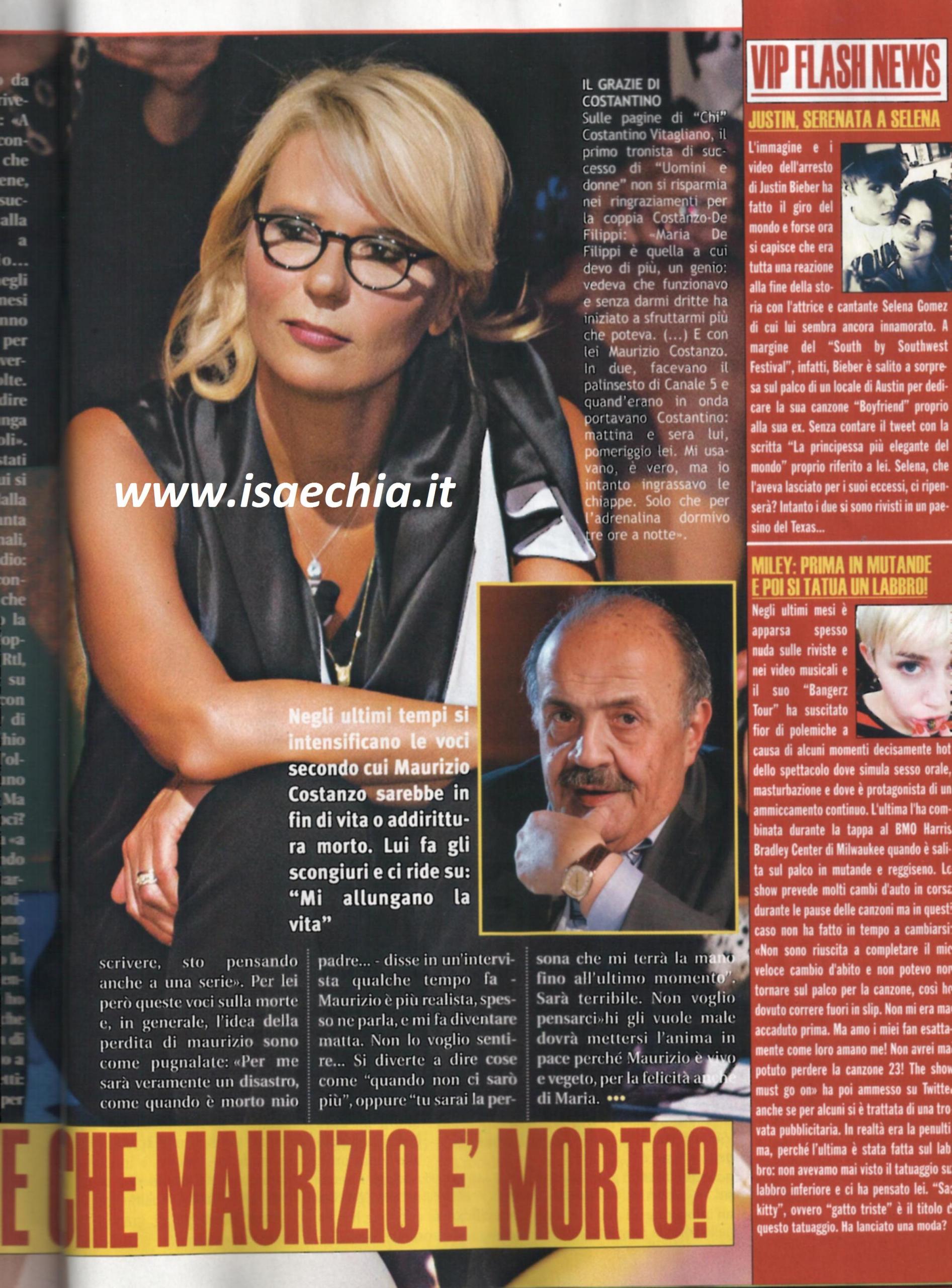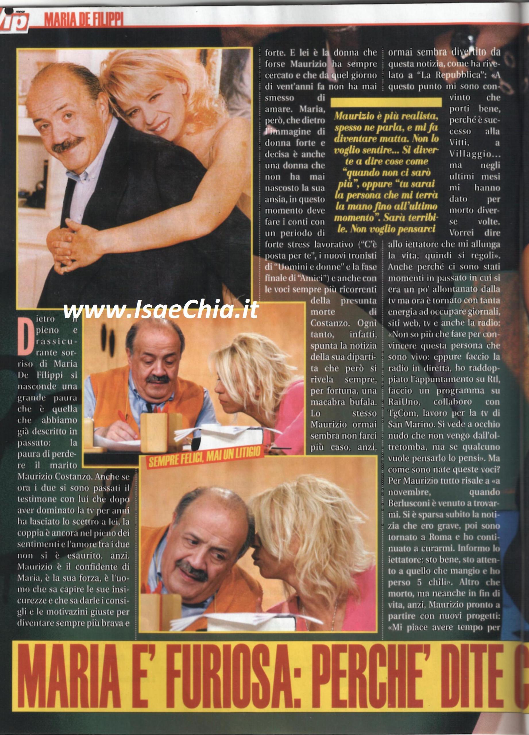 Dietro un aspetto sicuro di sé, Maria De Filippi nasconde grandi paure, una delle quali è quella di perdere suo marito Maurizio Costanzo: lui è il suo confidente e l’uomo che le ha insegnato tanto anche in tv. Di recente, il giornalista ha avuto degli improvvisi problemi di salute che lo hanno costretto al ricovero e sul web tornano, ad intervalli, le tristi notizie della sua dipartita, che però si rivelano sempre, per fortuna, delle maxi-bufale. “A questo punto sono convinto che porti bene, perché è successo a Monica Vitti, a Paolo Villaggio...Negli ultimi anni mi hanno dato per morto diverse volte. Vorrei dire al mio iettatore che così mi allunga la vita, quindi si regoli” ha scherzato lui con La Repubblica. “Eppure non so più che fare per dimostrare che sono vivo: sono in diretta in radio, ho un programma su RaiUno, collaboro con TGCom e lavoro per la tv di San Marino. La notizia si è diffusa quando non sono stato bene e Silvio Berlusconi è venuto a trovarmi. Informo lo iettatore: sto bene, mangio bene e sono dimagrito 5 chili. Mi piace aver tempo per scrivere, sto pensando ad una serie”. Per Maria, invece, la sola idea che suo marito possa morire non è per niente divertente: “Per me sarà un disastro, come quando è morto mio padre. Maurizio, più realista, spesso ne parla… e mi fa diventare matta. Non voglio sentirlo. Si diverte a dire “Quando non ci sarò più…” oppure “Tu mi terrai la mano fino all’ultimo momento”, ma io non voglio pensarci”.