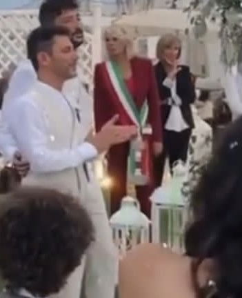 La conduttrice ha unito in matrimonio il suo collaboratore che ha sposato il compagno in una romantica cerimonia in riva al mare con un ex volto di Amici a cantare per loro