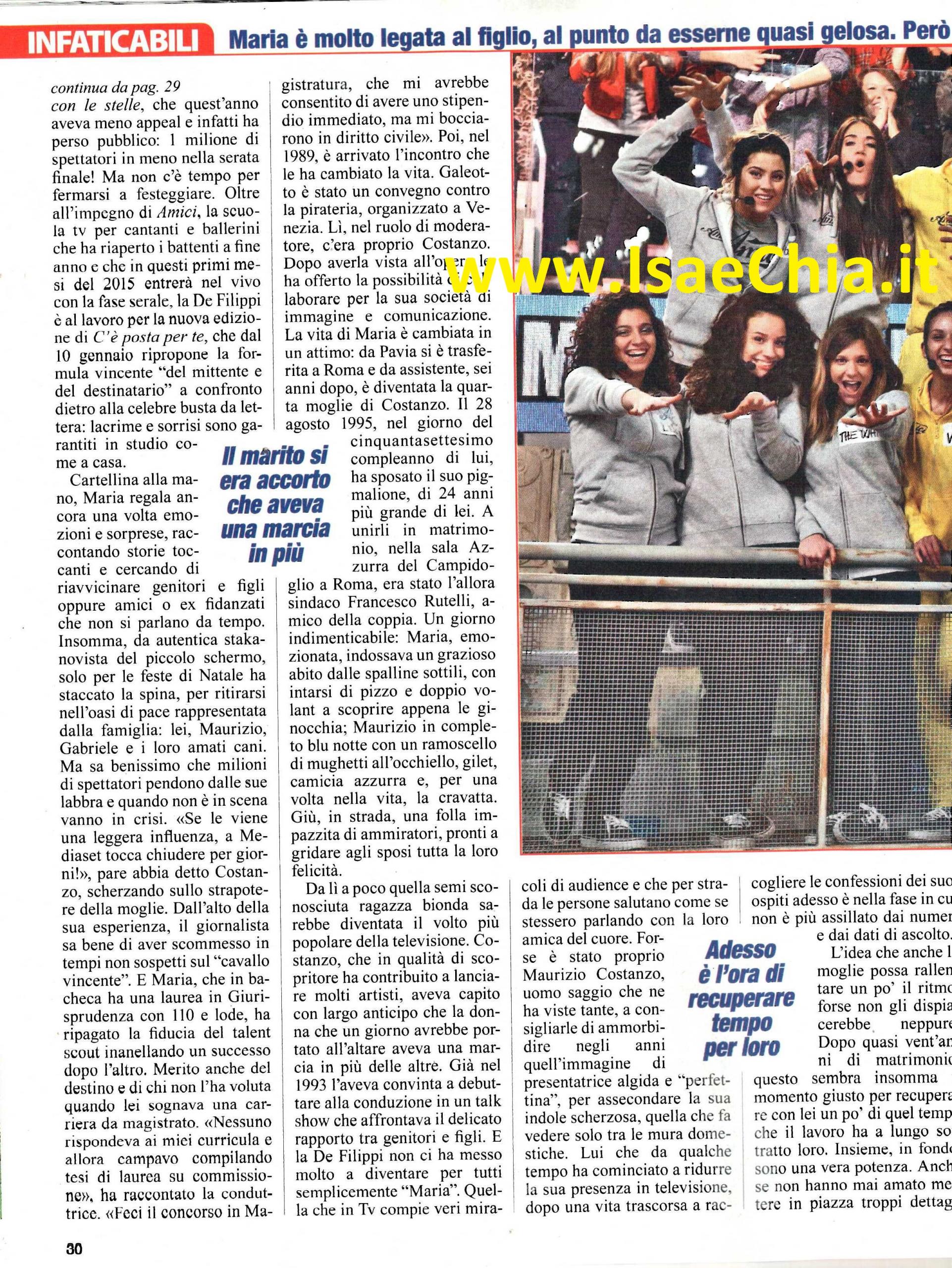 Il 2015 non sarà un anno come tutti gli altri, per Maria De Filippi. La conduttrice, infatti, festeggerà i vent’anni di matrimonio con Maurizio Costanzo, e per celebrarli al meglio, la coppia starebbe preparando una grande sorpresa. “Il 28 agosto festeggeremo vent’anni insieme e confesso che saremmo pronti a rifare tutto, a risposarci anche domani” ha recentemente dichiarato il giornalista. Un gesto romantico, che farebbe felice anche Gabriele, il ragazzo che, adottato nel 2004, li ha resi ancora più uniti e felici. Quando parla di Gabriele, Maria si illumina. “E’ l’uomo della mia vita” ha detto infatti lei, che però non ci sta a passare per la classica suocera ingombrante, come l’hanno descritta sul Web: “Non è vero. Lui non è neanche fidanzato! Le due storie importanti che ha avuto finora sono state con due ragazze che ho conosciuto e che mi piacevano anche molto” ha precisato lei. Ogni estate e ogni Natale, infatti, per Maria e Gabriele è un’occasione per stare insieme, in barca o in montagna, ascoltando la musica, scherzando come fossero due coetanei. Dei momenti di armonia e serenità che permettono alla conduttrice di non farsi schiacciare dai suoi mille impegni di lavoro. A breve, infatti, Maria tornerà con C’è posta per te, punta di diamante di Canale 5. In più, c’è l’impegno giornaliero di Uomini e donne, e Amici, la scuola alla ricerca di talenti che ha già aperto i battenti e che si prepara alla “fase serale”. Senza contare che ha appena finito con Tu sì que vales, il programma di intrattenimento che ha prodotto con la sua società e si è rivelato un vero trionfo. La squadra vincente che l’ha vista affiancata a Rudy Zerbi e Gerry Scotti, infatti, è stata arricchita dalla presenza quasi fissa di una rediviva Mara Venier, che ha sbaragliato la concorrenza di Ballando con le stelle. E dire che Maria pensava a tutt’altra carriera, ma è stato il destino a volerla in tv! Laureata con 110 e lode in Giurisprudenza, sognava la carriera di magistrato: “Nessuno rispondeva quando mandavo i curricula, così ho iniziato a scrivere tesi su commissione. Feci il concorso in Magistratura, ma mi bocciarono in diritto civile” ha rivelato lei. Poi, nel 1989, l’incontro galeotto con Maurizio, che, dopo averla vista all’opera, le diede la possibilità di collaborare con la sua società di immagine e comunicazione. Da lì, la vita di Maria è cambiata: si è trasferita da Pavia a Milano e dopo sei anni ha sposato Maurizio, di 24 anni più grande, che aveva già tre matrimoni alle spalle. Costanzo aveva capito in anticipo che la donna che aveva incontrato aveva una marcia in più: nel 1993 debuttò alla conduzione del talk show che affrontava i problemi dei rapporti tra genitori e figli e poi i problemi di coppia, quello che poi è evoluto in Uomini e Donne e C’è posta per te. Ora, dopo vent’anni, forse Costanzo vorrebbe che lei rallentasse un po’ i ritmi: “Il segreto del nostro rapporto è che ci lasciamo i nostri spazi vitali. Per esempio, non lavoriamo insieme e questa è una gran fortuna. Altrimenti, uno cercherebbe di comandare l’altro e ci scapperebbe da ridere! In realtà Maria è un po’ un orso, non portata alla socializzazione…Ma anche in questo siamo simili! Siamo una famiglia silenziosa. Quando ci sono meno parole, c’è più intesa“.