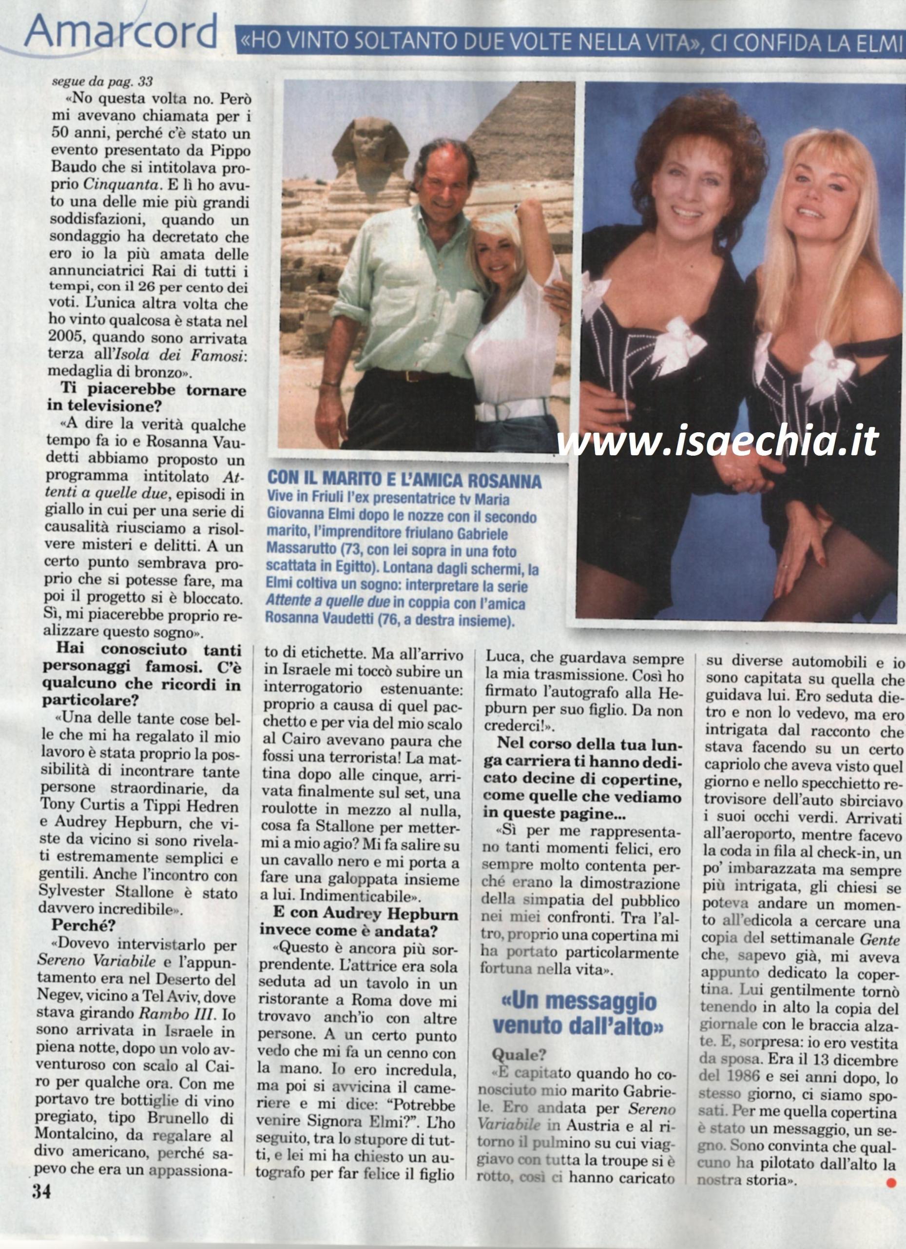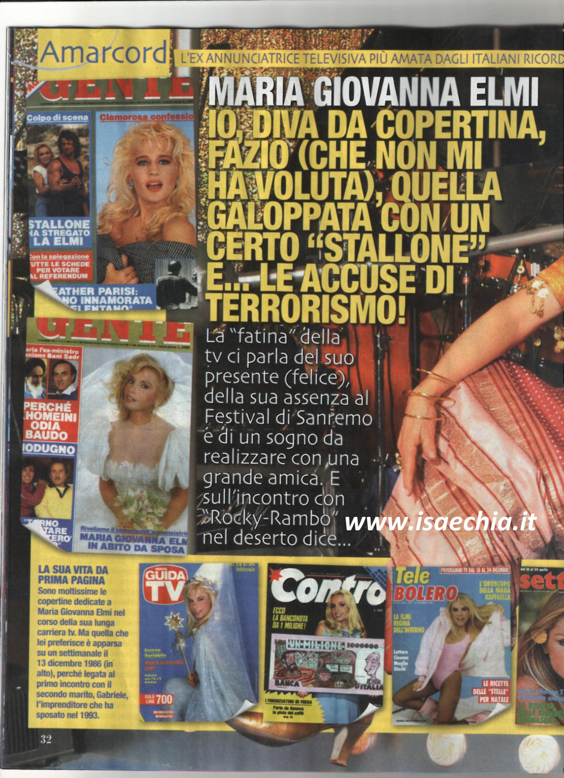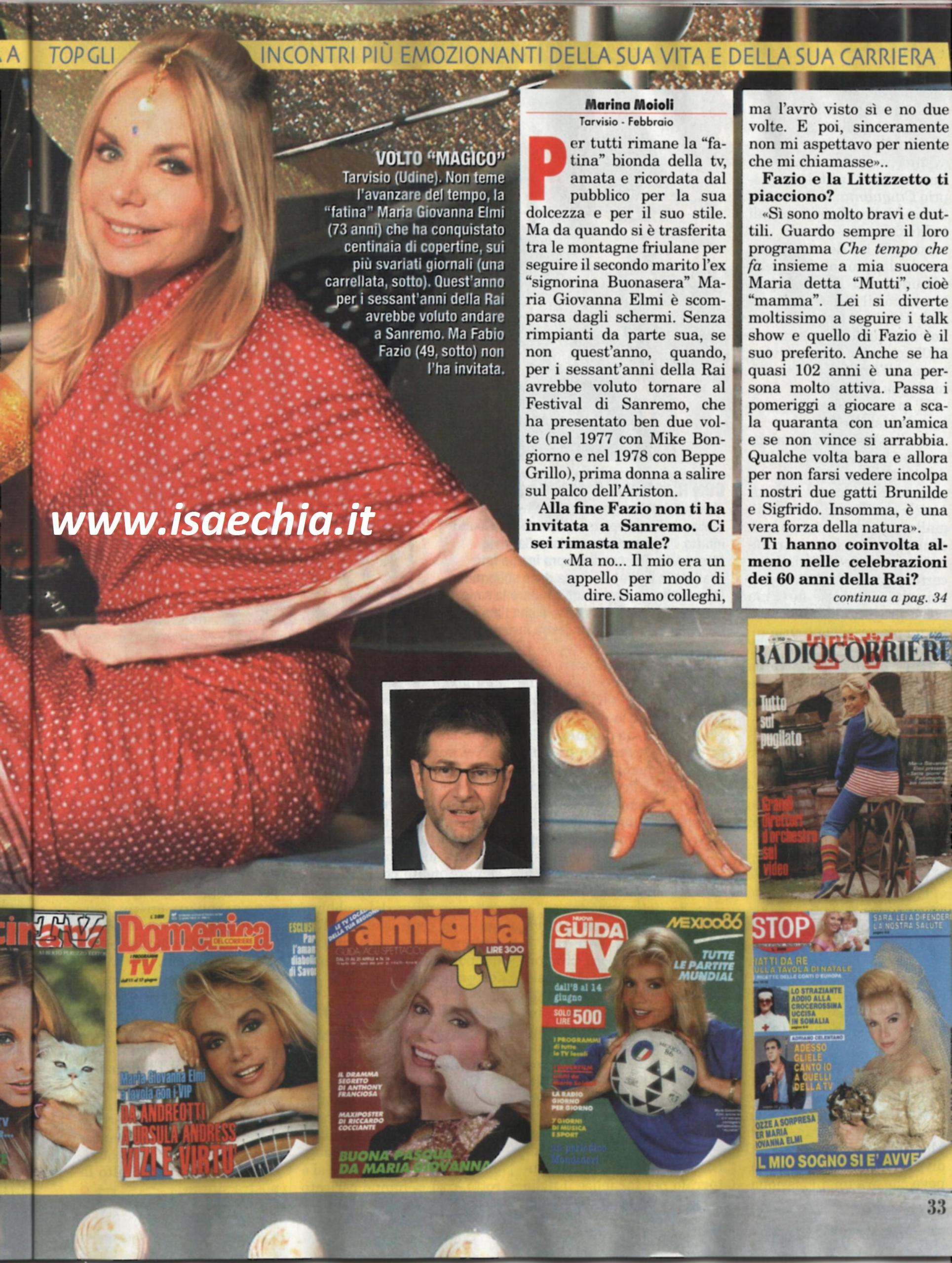 La “fatina” bionda della tv Maria Giovanna Elmi aveva espresso il desiderio di essere ospite al Festival di Sanremo: “Era solo per dire, io e Fabio Fazio ci saremo visti sì e no due volte. Non mi aspettavo per niente che mi chiamasse. Guardo sempre lui e Luciana Littizzetto a Che tempo che fa con mia suocera, detta “Mutti”, che ha 102 anni. Non sono stata coinvolta per la festa per i 60 anni della Rai, ma mi avevano chiamato per i 50, per l’evento chiamato proprio Cinquanta, organizzato da Pippo Baudo. Lì ho avuto grandi soddisfazioni perché sono stata eletta la più amata delle annunciatrici Rai di tutti i tempi. L’unica altra volta che ho vinto qualcosa è stato all’Isola dei famosi, dove ho vinto la medaglia di bronzo. Qualche tempo fa, io e Rosanna Vaudetti avevamo ideato un programma, Attenti a quelle due, degli episodi in giallo in cui, per una serie di casualità, riuscivamo a risolvere dei delitti. Sembrava che il progetto si potesse fare, ma poi si è bloccato tutto. Mi piacerebbe realizzarlo! Una delle cose che mi ha regalato il mio lavoro è stato poter conoscere tante persone famose: ho incontrato Sylvester Stallone nel deserto, vicino Tel Aviv. Dopo un viaggio burrascoso, durante il quale mi avevano fermata ai controlli come se fossi una terrorista perché avevo delle bottiglie di vino, Stallone cosa fa per mettermi a mio agio? Mi fa salire su un cavallo nero e mi porta a fare una galoppata insieme a lui. Audrey Hepburn è stata ancora più sorprendente. Eravamo nello stesso ristorante; ad un certo punto mi ha fatto cenno di andare verso di lei e mi ha chiesto un autografo per suo figlio, che guardava sempre la mia trasmissione!”. Infine, parlando di tutte le copertine di giornali di cui è stata protagonista, racconta: “Una di quelle mi ha cambiato la vita. Ero andata per Sereno variabile in Austria. Al ritorno si è rotto il pullmino e ci hanno caricato su diverse auto; quella su cui sono capitata era guidata dal mio attuale marito Gabriele. Arrivati all’aeroporto, gli chiesi il favore di prendermi il giornale Gente, che mi aveva dedicato la copertina. Lui è tornato col giornale, e, sorpresa: ero vestita da sposa. Era il 13 dicembre 1986 e sei anni dopo, lo stesso giorno, ci siamo sposati. Per me quella copertina è stata un messaggio: qualcuno dall’alto ha pilotato la nostra storia”.