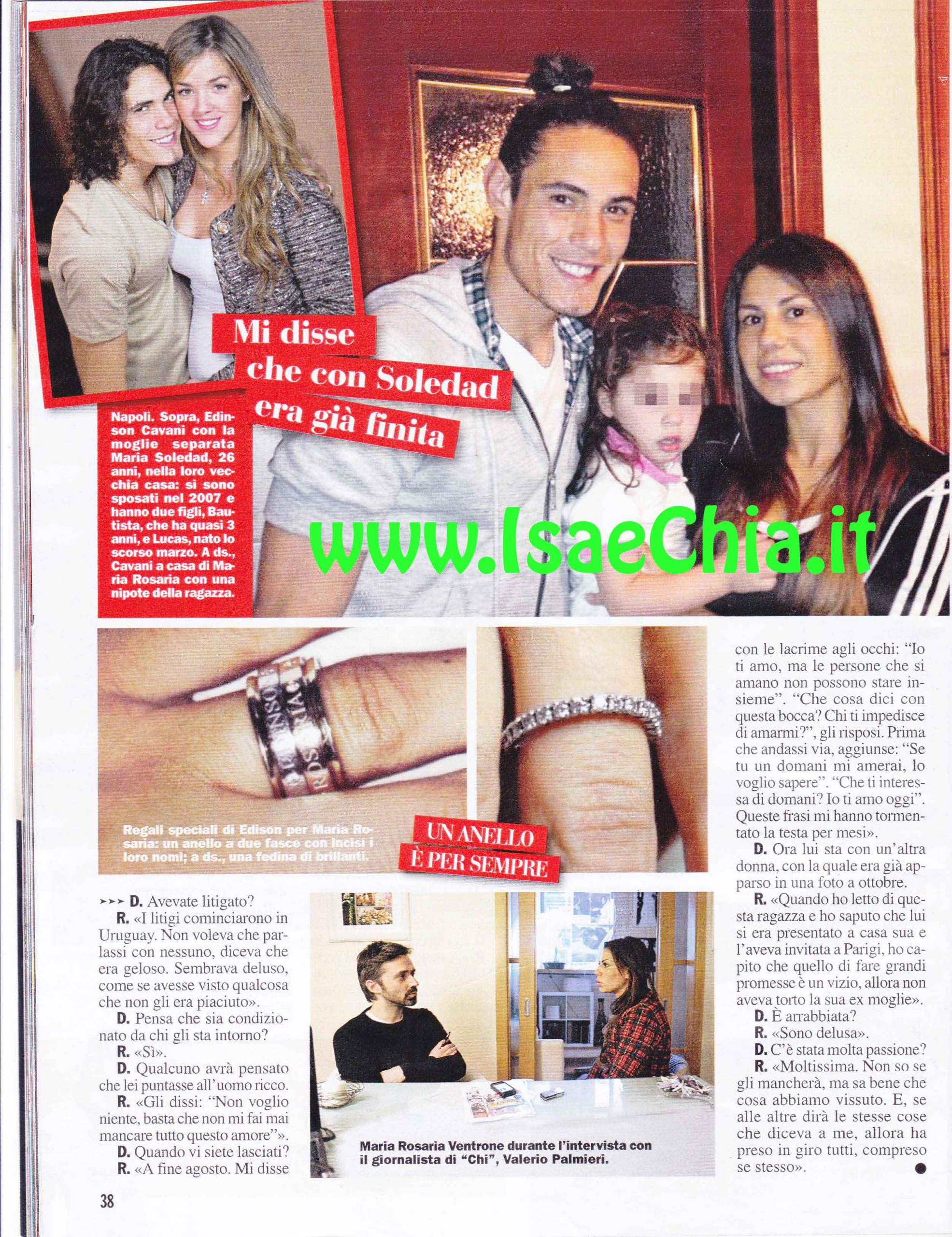 Per mesi Maria Rosaria Ventrone è stata la donna misteriosa che aveva conquistato il calciatore Edinson Cavani. Poi, appena lui è stato venduto al Paris-Saint Germain, l’amore è finito e lui si è consolato con la modella e ballerina Jocelyne Burgardt. Adesso la Ventrone dichiara: “Se come calciatore non vincerà il pallone d’oro, come attore potrebbe vincere l’Oscar. Tutto è iniziato due anni fa, andai a vedere l’allenamento con delle amiche. Scattammo una foto e poi gli chiesi la maglia. Lui me la diede dicendomi “Dentro c’è una cosa per te, ma non aprirla subito. Era il suo numero di telefono. Gli scrissi per ringraziarlo e iniziammo a sentirci. Un giorno mi disse che sua mogie era in Uruguay e voleva vedermi. Io gli risposi: “Guarda che non sono una di strada, da una notte e via. Tieniti quello che hai, io sono troppo per te”. Mi chiese scusa e disse che non l’aveva mai pensato. Qualche mese dopo tornai agli allenamenti e lui ricominciò a cercarmi. Mi disse che gli avevo fatto venire “un buco nello stomaco”. Sapevo che non andava d’accordo con la moglie e che era partita di nuovo. Girammo senza paura che ci vedessero e si aprì con me. Io gli dissi di tornare con lei, perché i bambini avevano bisogno dei genitori, ma lui disse che non aveva mai amato nessuna come me. Era la fine del 2012 e Cavani aspettava un figlio. A Natale partì per l’Uruguay, ma tornò con la mamma, e senza la moglie. Mi invitò a casa sua e invitò i miei genitori a cena per conoscerli, dicendo che mi amava. Da quel momento ha vissuto a casa nostra: avevamo un piccolo appartamento tutto per noi. A maggio mi ha chiesto di raggiungerlo in Uruguay, prese una casa solo per noi e ho conosciuto i suoi parenti. Quando ha lasciato il Napoli per andare a Parigi, ha detto che ci saremmo stabiliti lì, ma lui era cambiato, era geloso. Sembrava condizionato da qualcuno. Non volevo i suoi soldi, gli ho detto “Non voglio niente, voglio che non mi fai mancare l’amore”. Ma a fine agosto mi ha lasciata, con le lacrime agli occhi, dicendo: “Ti amo, ma le persone che si amano non possono stare insieme”. Io gli risposi: “Chi ti impedisce di amarmi?” e lui disse: “Se tu un domani mi amerai, lo voglio sapere” e io “Che ti interessa di domani? Io ti amo oggi”. Quando ho letto che stava con un’altra donna, ho capito che quello di fare promesse era un suo vizio: non aveva torto la sua ex moglie. Sono delusa, c’è stata moltissima passione e se alle altre dirà le stesse cose che ha detto a me, allora ha preso in giro tutti, compreso se stesso”.