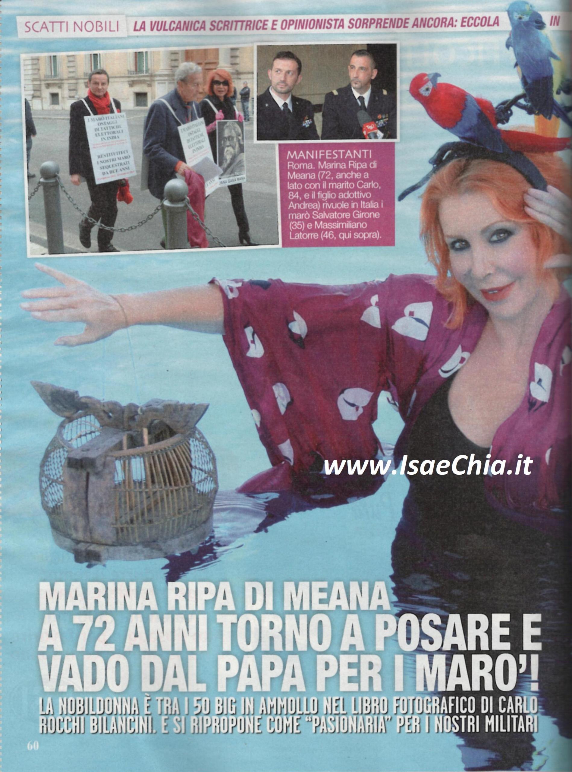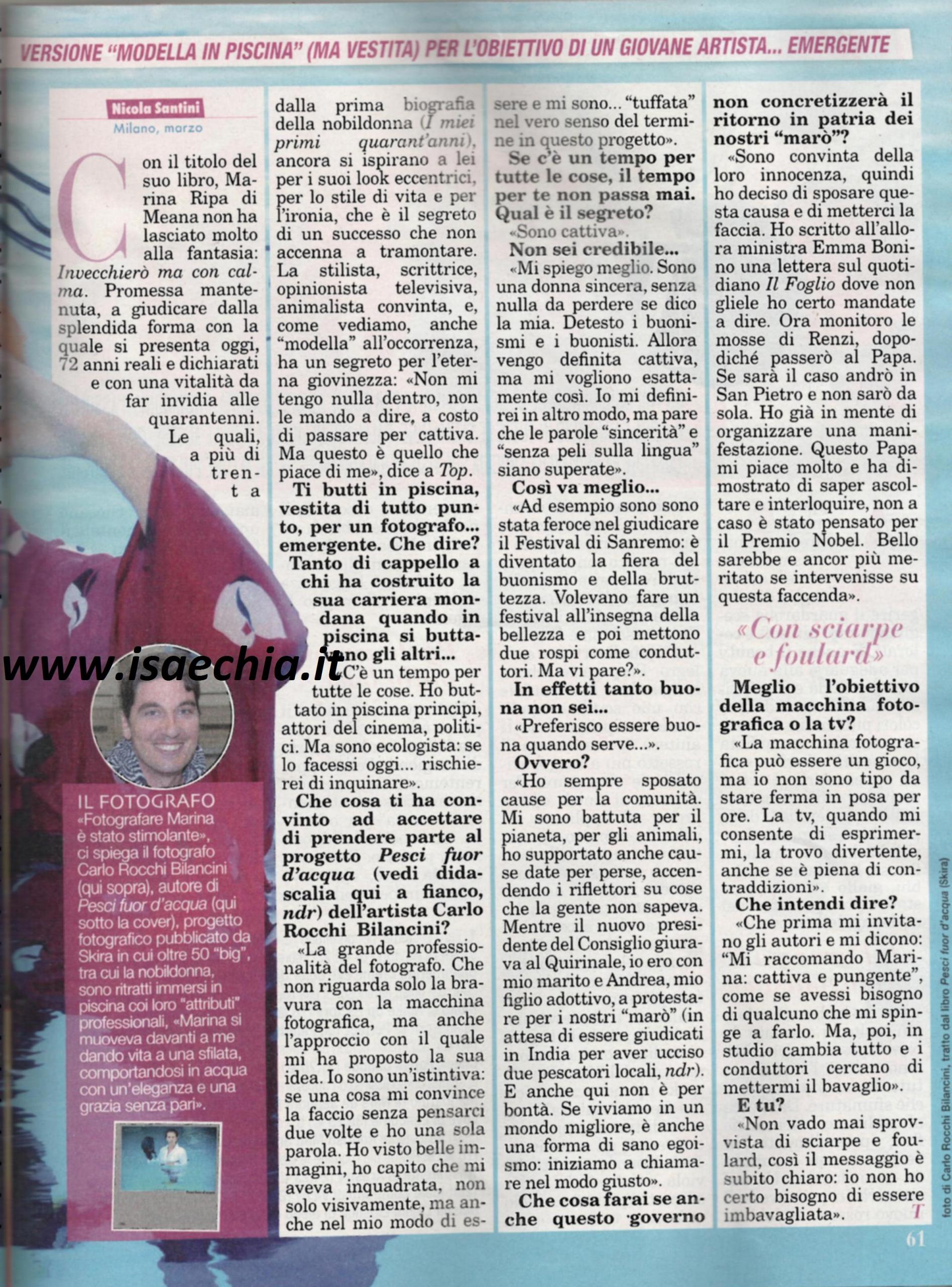 Invecchierò ma con calma: il titolo del nuovo libro di Marina Ripa di Meana la dice lunga. Ecco, infatti, l’eccentrica nobildonna mentre posa in piscina, ma vestita per un fotografo emergente: “C’è un tempo per tutte le cose. Ho buttato in piscina principi, attori e politici. Ho preso parte al progetto Pesci fuor d’acqua (in cui 50 big sono immortalati in piscina) perché mi ha colpito la grande professionalità del fotografo, che si vede anche nell’approccio con cui mi ha proposto l’idea. Io sono un’istintiva e se una cosa mi piace, la faccio senza pensarci due volte. Ho visto le immagini e ho notato che mi aveva inquadrata nel mio vero modo d’essere”. Quando le si chiede qual è il suo segreto di bellezza, risponde: “Sono cattiva. Mi spiego: sono sincera, dico la mia e detesto i buonismi. Io non mi definirei così, ma pare che le parole “sincerità” e “senza peli sulla lingua” siano fuori moda. In tv, prima di andare in onda mi dicono: “Mi raccomando, sii pungente. Ma poi cercano di mettermi il bavaglio! Mantengo la bontà per quando serve: ad esempio, mi sono battuta per il pianeta, per gli animali…Mentre il nuovo Presidente del Consiglio giurava al Quirinale, io e mio marito Andrea protestavamo per i nostri “Marò“, in attesa di essere giudicati in India per aver ucciso due pescatori locali: sono convinta della loro innocenza e scrissi anche all’allora ministro Emma Bonino. Ora monitoro le mosse di Matteo Renzi, dopodiché passo a Papa Francesco I: mi piace molto e ha dimostrato di saper interloquire e ascoltare, non a caso è stato pensato per il Premio Nobel, che sarebbe ancora più meritato se intervenisse in questa causa”.