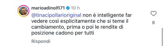 Adinolfi ha poi proseguito pubblicando un post sul suo profilo Instagram proprio con il commento di Tina: