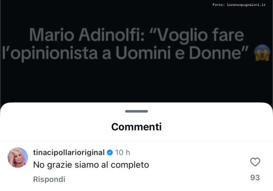 Le sue parole hanno subito avuto una grande eco sul web e sono state riprese anche da diverse pagine social. Proprio ad una di queste ha risposto Tina Cipollari, la quale ha espresso la sua contrarietà in merito alla possibilità di vedere Adinolfi all’interno dello show: “No grazie siamo al completo”, è stata la caustica risposta della Cipollari, che come sempre non ha usato giri di parole nell’esprimere il proprio pensiero.