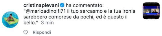 A sostegno di Mario è arrivata però la vincitrice de L’Isola dei Famosi, Cristina Plevani, che così commentato il posto del giornalista: “Il tuo sarcasmo e la tua ironia sarebbero comprese da pochi, ed è questo il bello”.