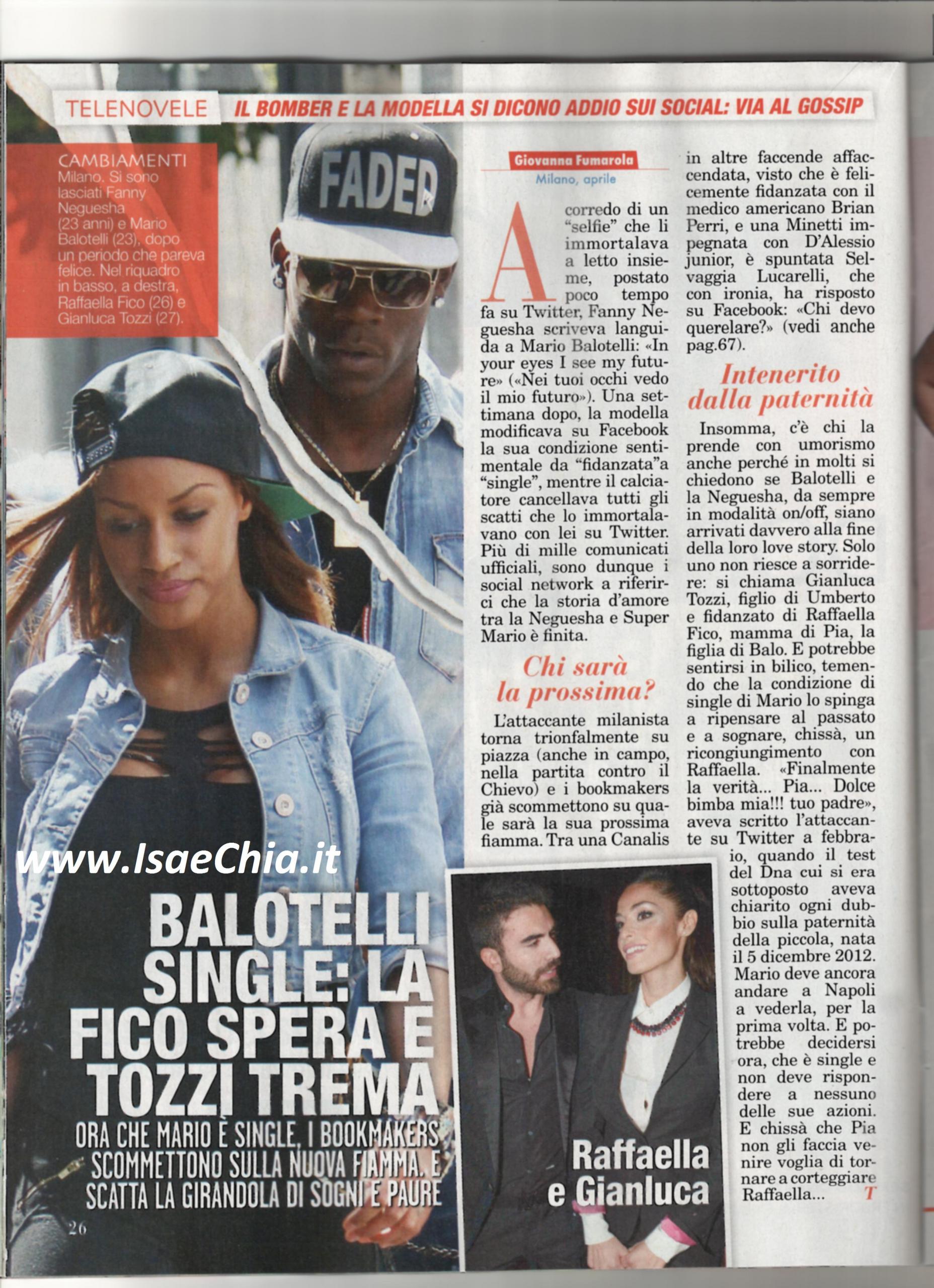 Una selfie di loro due a letto insieme e la frase: “In your eyes I see my future” (Nei tuoi occhi vedo il mio futuro). Questo è ciò che ha pubblicato Fanny Neguesha una settimana prima della fine della storia con il calciatore Mario Balotelli. La modella belga, infatti, ha modificato il suo stato Facebook da “Fidanzata” a “Single”, mentre lui cancellava tutte le foto insieme a lei. Più di mille comunicati ufficiali, sono dunque i social network, che annunciano che Balotelli e la Neguesha si sono definitivamente lasciati, dopo una storia fatta di lascia e prendi. E le previsioni per chi sarà la prossima fiamma di Super Mario sono già scattate. Balo ha recentemente riconosciuto la figlia Pia, avuta dalla gieffina Raffaella Fico, postando su Twitter la foto della piccola e facendole una dedica. La bella napoletana, dal suo canto, si è dichiarata disposta ad aprirgli le porte di casa per fargli vedere la piccola. E molti scommettono che ci sarà il ritorno di fiamma! Perciò l’unico a tremare è Gianluca Tozzi, figlio del cantante Umberto, che è fidanzato con Raffaella da qualche tempo…