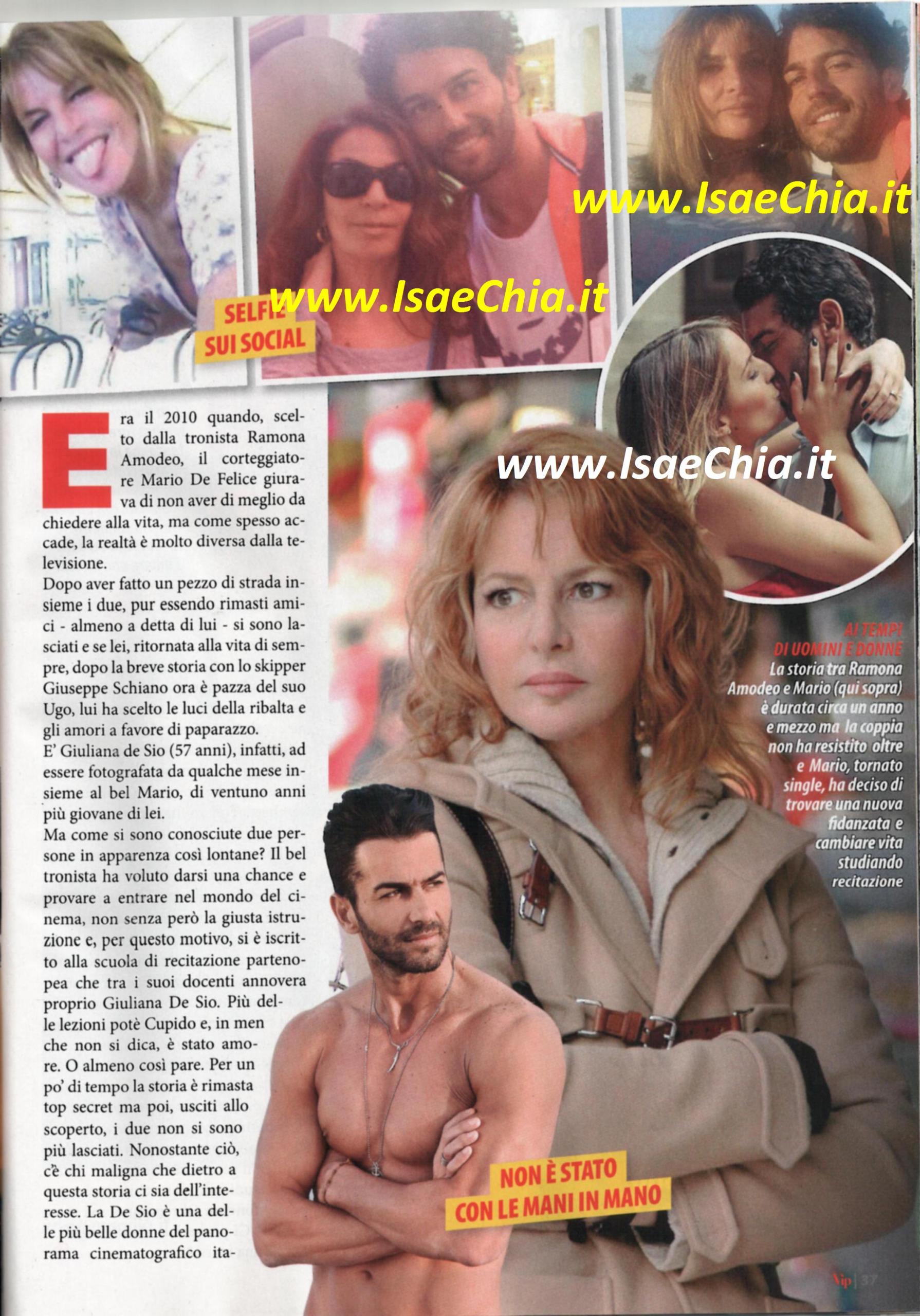Era il 2010 quando la tronista Ramona Amodeo sceglieva Mario De Felice, ma la storia nata a Uomini e donne è finita qualche tempo dopo. Adesso, lei è innamoratissima del suo Ugo, mentre Mario è stato visto sempre più spesso in compagnia dell’attrice Giuliana De Sio, 57 anni, quindi 21 più di lui. Come si saranno conosciuti i due, che, a giudicare alle foto scattate insieme, hanno una certa confidenza? Mario aveva provato a darsi una chance nel mondo del cinema, e perciò si era iscritto ad una scuola di recitazione di Napoli, dove una delle insegnanti è proprio l’attrice di origine partenopea. Per i primi tempi, la frequentazione tra i due è rimasta top secret, ma poi i due non si sono più lasciati. Come ogni gossip che si rispetti, c’è chi maligna che in realtà, dietro la loro “unione” ci sia solo dell’interesse. “Giuliana trova che dovrei applicarmi di più nello studio della cinematografia italiana. L’altra sera, per esempio, sono andato a trovarla e abbiamo guardato insieme Bellissima di Luchino Visconti, con Anna Magnani. E’ emozionante condividere con Giuliana questo mestiere, lei è questo mestiere per eccellenza!” ha detto Mario, che pare voglia abbandonare la carriera di promotore finanziario: al momento si sta facendo le ossa con lo spettacolo teatrale Vacanze turche, ma ha lasciato intendere progetti per il grande schermo: “Mi piacerebbe andare a Hollywood e prendere parte a un film thriller, il genere che preferisco. Sto studiando parecchio per poter andare Oltreoceano, ma è dura” ha detto lui. Sì, è vero, ma chissà che con l’aiuto di Giuliana non possa riuscirci!