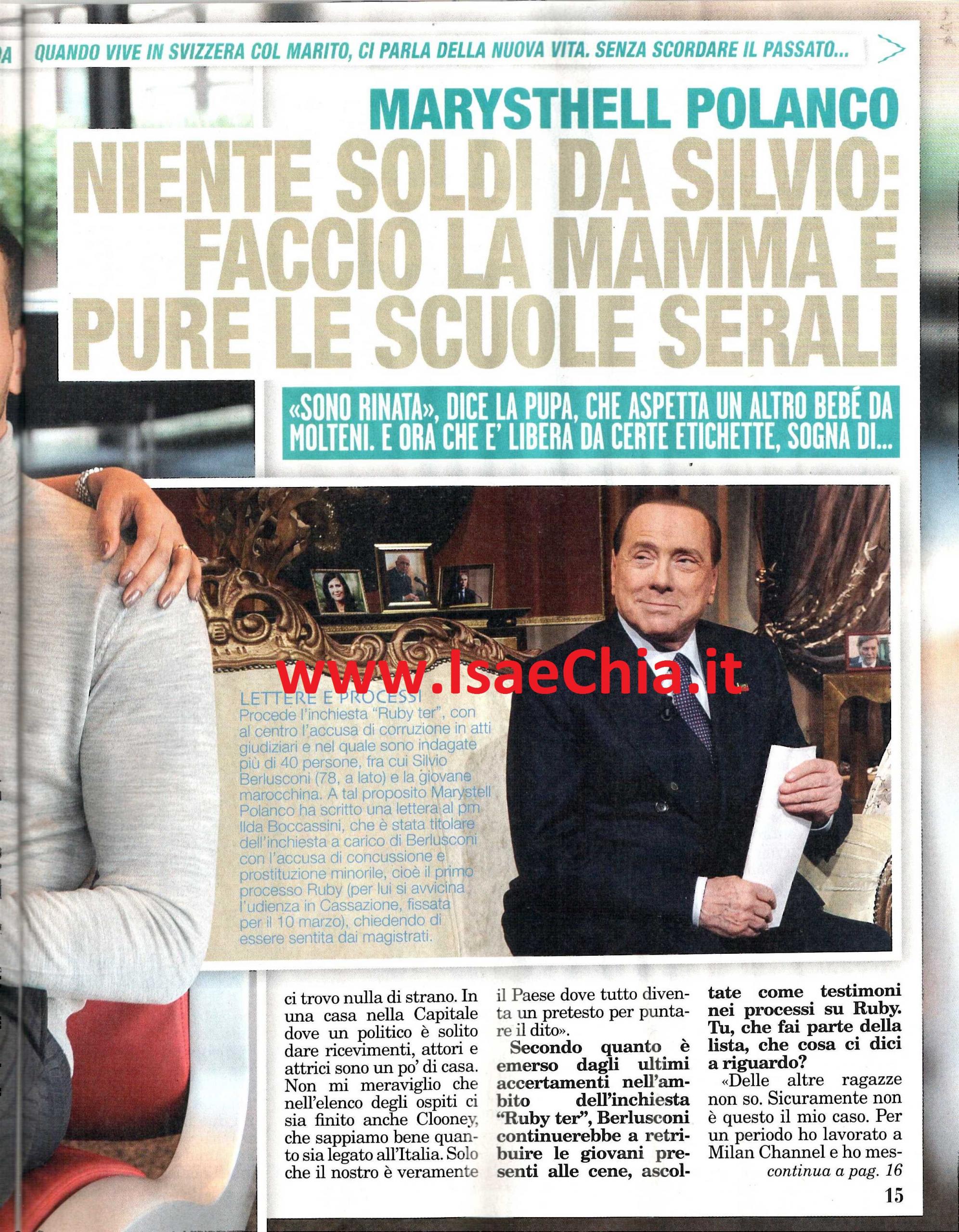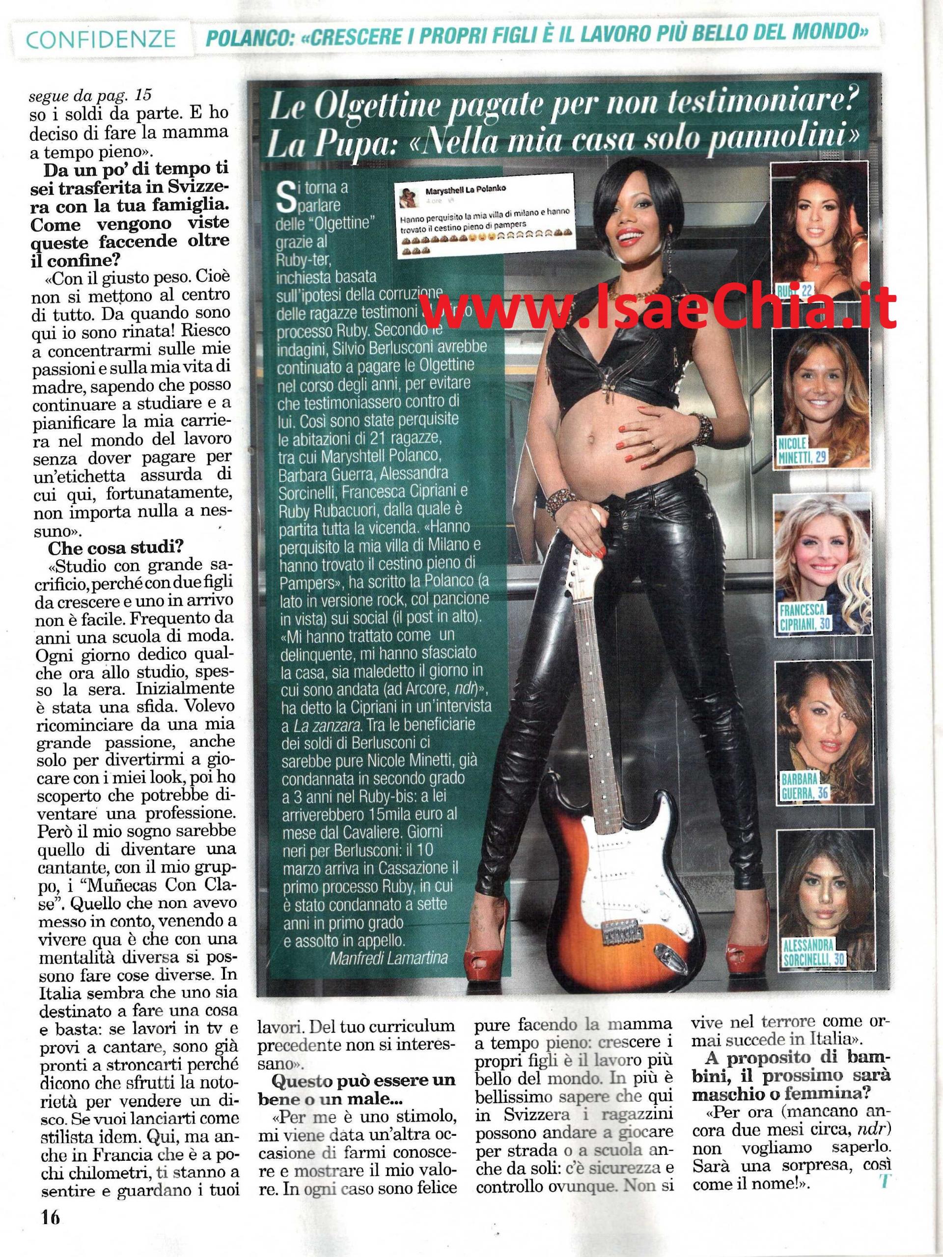 Mentre i giudici sono ancora a lavoro sul caso Ruby ter, che la vede coinvolta nelle “cene eleganti” di Silvio Berlusconi, l’ex Pupa Marysthell Polanco ha messo su famiglia: il giocatore di basket svizzero Westher Molteni l’ha resa mamma di O’Neal nel 2011, un’altra bimba è in arrivo e un’altra era già nata da una precedente relazione di Marysthell. Oggi, l’ex valletta di Colorado racconta la sua verità su quelle cene, che, secondo alcuni, hanno coinvolto anche l’attore George Clooney: “Ho conosciuto Clooney, è un uomo di grande charme ed eleganza, chiunque cadrebbe ai suoi piedi. Ma non l’ho conosciuto a Palazzo Grazioli, come dicono i giornali, bensì quando ha inaugurato la sua casa sul Lago di Como, Villa Oleandra. Ci mandò lì Fabrizio Corona come ragazze immagine, con altre colleghe. A Roma non l’ho mai visto, ma so che c’è stato e non c’è nulla di male: in una casa dove un politico è solito dare ricevimento, gli attori sono un po’ di casa. In Italia ogni cosa diventa un pretesto per puntare il dito“. Quando le si fa notare che dalle inchieste sembra che Berlusconi continui a pagare le giovani presenti alle cene, lei risponde: “Non so delle altre, ma questo non è sicuramente il mio caso. Per un periodo ho lavorato a Milan Channel e ho messo soldi da parte. E ho deciso di fare la mamma a tempo pieno. Da quando sono qui in Svizzera sono rinata: queste cose vengono viste col giusto peso. Riesco a concentrarmi sulle mie passioni e sulla mia vita da madre, sapendo che posso studiare e pianificare la mia carriera senza dover pagare per un’assurda etichetta. Studio con grande sacrificio, perché con due figli da crescere e uno in arrivo non è facile. Ogni giorno dedico qualche ora allo studio, spesso la sera. Era nata come una sfida, volevo ricominciare da una mia grande passione anche solo per divertirmi e giocare coi miei look; poi ho scoperto che potrebbe diventare una professione. Però il mio sogno sarebbe quello di diventare cantante, con il mio gruppo, i Munecas con Classe. Non avevo messo in conto che venendo qui, con una mentalità diversa, si possono fare cose diverse. In Italia sembra si sia destinati a fare una cosa e basta: se lavori in tv e provi a cantare, ti stroncano perché dicono che hai sfruttato la notorietà per vendere un disco, idem se fai lo stilista. Qui, ma anche in Francia, ti stanno a sentire e guardano i tuoi lavori, del tuo curriculum precedente non si interessano. Questo per me è uno stimolo a farmi conoscere, a dimostrare il mio valore. In ogni caso, sono felice pure facendo la mamma a tempo pieno: crescere i propri figli è il lavoro più bello del mondo. Qui in Svizzera c’è sicurezza e controllo dei bambini ovunque, non si vive nel terrore come in Italia“. E, così, a proposito di bambini, quando le si chiede se arriverà un maschietto o una femminuccia, Marysthell conclude: “Mancano due mesi, ma per ora non vogliamo saperlo. Sarà una sorpresa, così come il nome!“.