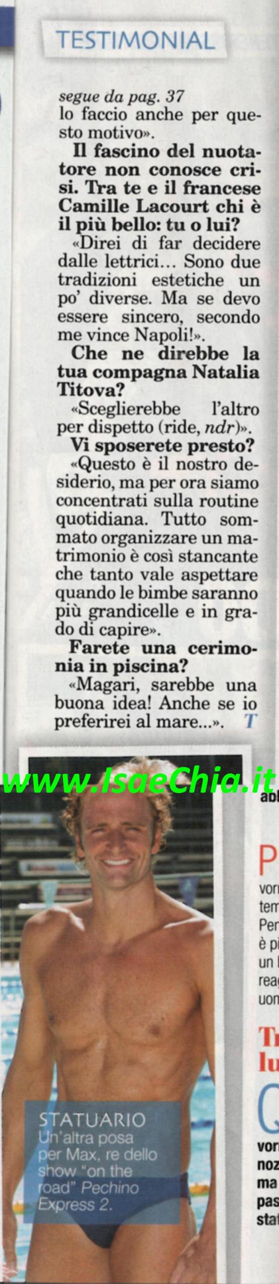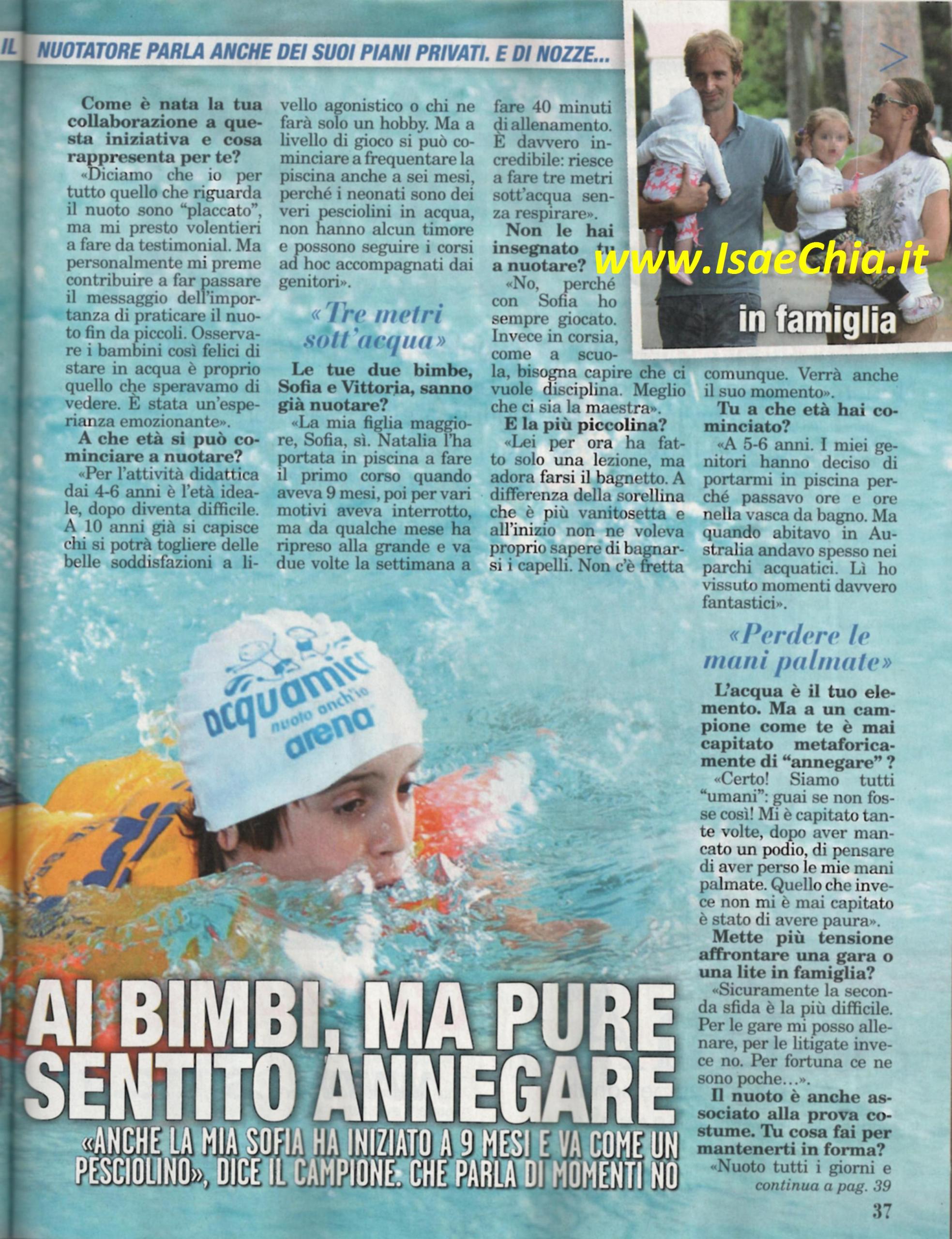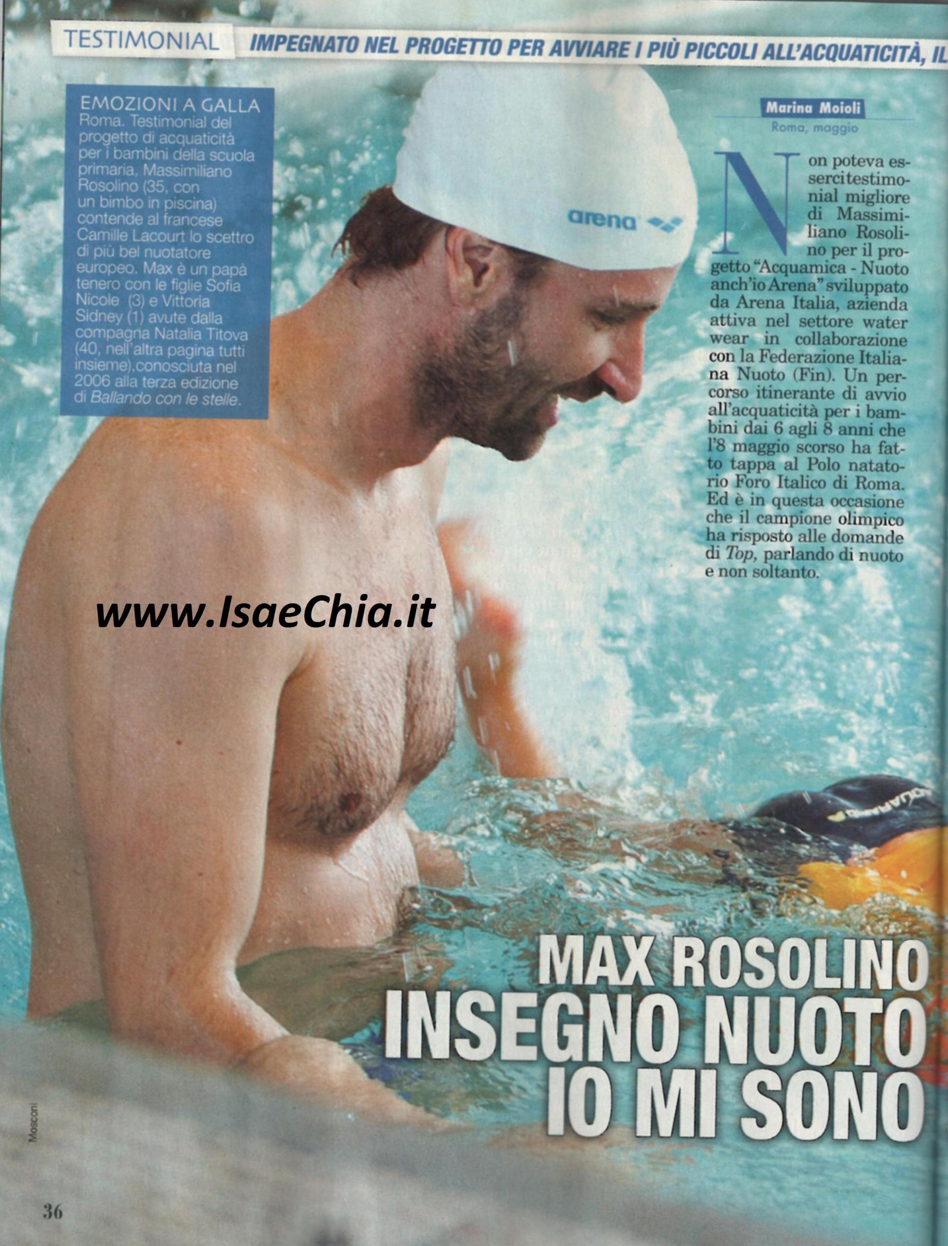 Il nuotatore olimpico e vincitore della seconda edizione di Pechino Express Massimiliano Rosolino è testimonial per il progetto Acquamica, un percorso itinerante che introduce i bambini all’acquaticità. “Per tutto ciò che riguarda il nuoto, vengo “placcato”, ma mi presto volentieri a fare il testimonial. Mi preme mandare il messaggio che è importante praticare il nuoto fin da piccoli. Vedere i bambini felici in acqua era ciò che speravo ed è stata un’esperienza emozionante. Per l’età didattica 4-6 anni è l’ideale, a 10 anni si può già capire chi potrà dare delle soddisfazioni; a livello di gioco, si possono portare i bambini in piscina già a pochi mesi. La mia figlia maggiore Sofia sa già nuotare: la mia compagna, la ballerina Natalia Titova, l’ha portata in piscina sin da piccola e ora è incredibile: sa fare 3 metri sott’acqua senza respirare. Io ho cominciato a 5-6 anni: i miei hanno deciso di portarmi in piscina perché passavo ore nella vasca da bagno! Quando vivevo in Australia, ero spesso nei parchi acquatici. Eppure anche a me capita di “affogare” metaforicamente: tante volte, quando non sono riuscito ad arrivare al podio, ho pensato di avere le mani palmate! Le liti in famiglia, poi, sono una sfida più difficile: lì non ci si può allenare”. Quando gli si chiede quando sposerà la Titova, risponde: “E’ un nostro desiderio, ma ora siamo concentrati sulla routine quotidiana. Organizzare un matrimonio è così stancante che tanto vale aspettare che le bimbe saranno più grandicelle e in grado di capire”.