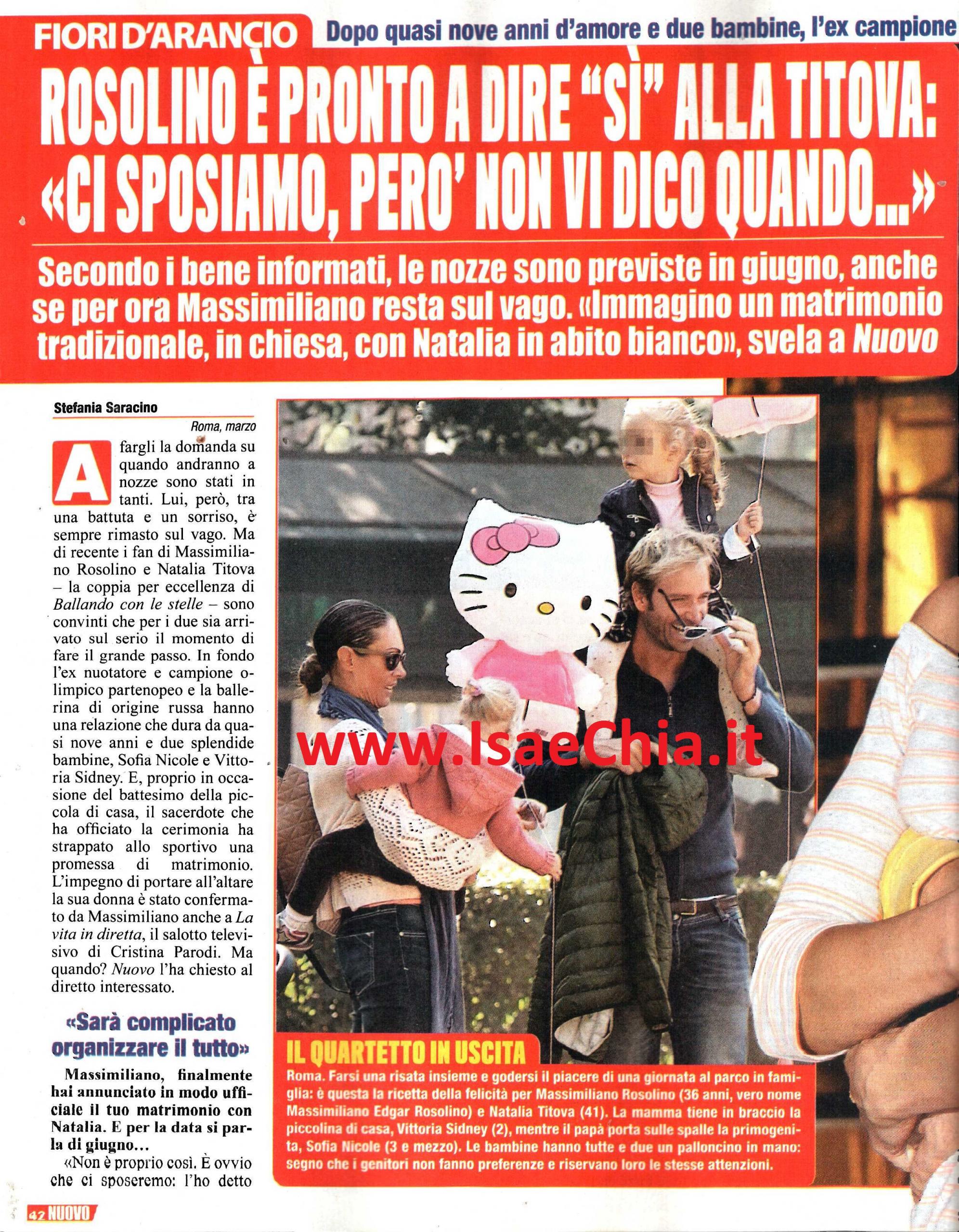 Massimiliano Rosolino e Natalia Titova si sono conosciuti nove anni fa a Ballando con le stelle e da allora non si sono più lasciati. Anzi, hanno coronato il loro amore con la nascita di due figlie. Eppure, nonostante se ne parli da un po’, le nozze non si sono ancora celebrate. Adesso però, pare che il nuotatore, anche vincitore di Pechino Express 2 si sia deciso e si parla di una cerimonia a giugno: “Non è proprio così. E’ ovvio che ci sposeremo, l’ho detto anche quando me l’hanno chiesto a bruciapelo. Però non sappiamo quando. In estate è difficile, se non impossibile. Tutti quelli che conoscono le organizzano un anno prima, come riusciremmo noi ad essere pronti per giugno? La nostra attività lavorativa termina proprio in quel periodo. Per organizzare una festa per i bambini ci vuole un mese, figuriamoci per un matrimonio! A momenti non riusciamo neanche ad organizzare un’uscita di coppia! Noi dobbiamo riunire ben tre famiglie: la mia, che viene da Napoli, quella di Natalia, dalla Russia e la mia famiglia romana, cioè gli amici che vivono nella nostra stessa città” racconta lui. Quando gli si fa notare che sembra non ci stia pensando veramente, lo sportivo risponde: “Forse è vero, del resto stiamo benissimo anche così. Però mi dispiace se le mie figlie, una volta cresciute, non avessero dei genitori sposati, anche perché siamo molto credenti. Se fosse per me, trasformerei le nostre nozze in una festa per una ventina di persone. Probabilmente è anche un po’ la pigrizia che ci condiziona. Se si pensa ai battesimi delle nostre figlie, anche quelli li abbiamo celebrati in ritardo: a 18 mesi la prima, a 22 la seconda. Nel caso di Vittoria Sydney lo abbiamo deciso il giovedì per la domenica, sapendo che mia suocera sarebbe venuta a trovarci dalla Russia! Le nozze a sorpresa? Potrebbe essere un’idea! Ma non credo che nel giorno del matrimonio, Natalia non vorrà coinvolgere sua mamma, la zia e il papà, che non è mai venuto in Italia, perché è andata lei da sola in Russia con le bambine. Prima delle nozze mi pare giusto conoscerlo! Spero di celebrare il matrimonio d’estate e che le mie figlie possano essere protagoniste e ricordarlo. Affinché ciò accada, bisogna che la più piccola abbia almeno 3 anni, quindi ci vuole ancora tempo!“. Infine, quando gli si chiede se stanno pensando anche di allargare la famiglia, magari con un maschietto, Massimiliano risponde: “Non si può avere tutto! Sono vincolato dai peluche delle mie figlie, ma ogni tanto vorrei qualche giorno da maschio! Al momento, comunque, direi di no. Le famiglie numerose sono belle, ma ci vuole organizzazione. Già così siamo molto presi. Un paio di giorni alla settimana siamo a Napoli, dove siamo direttori tecnici per il nuoto e per la danza di un grande centro sportivo, e seguiamo alcuni progetti anche a Roma!“.