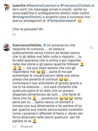 Così, dopo le ennesime Instagram Stories dell’ex fidanzato di Ilaria Teolis, che ha un po’ sbeffeggiato Francesco per la sua partecipazione al Festival del Cinema di Venezia, Chiofalo non ha esitato a contattarlo privatamente in direct e a riempirlo di insulti decisamente pesanti: “Ci hai provato con Temptation Island ma non ci sei riuscito, sei rimasto il fallito che eri. Prova a spararti in faccia in una Story e magari a 10k di visualizzazioni in 24 ore ci arrivi col tuo profilo verificato”.
