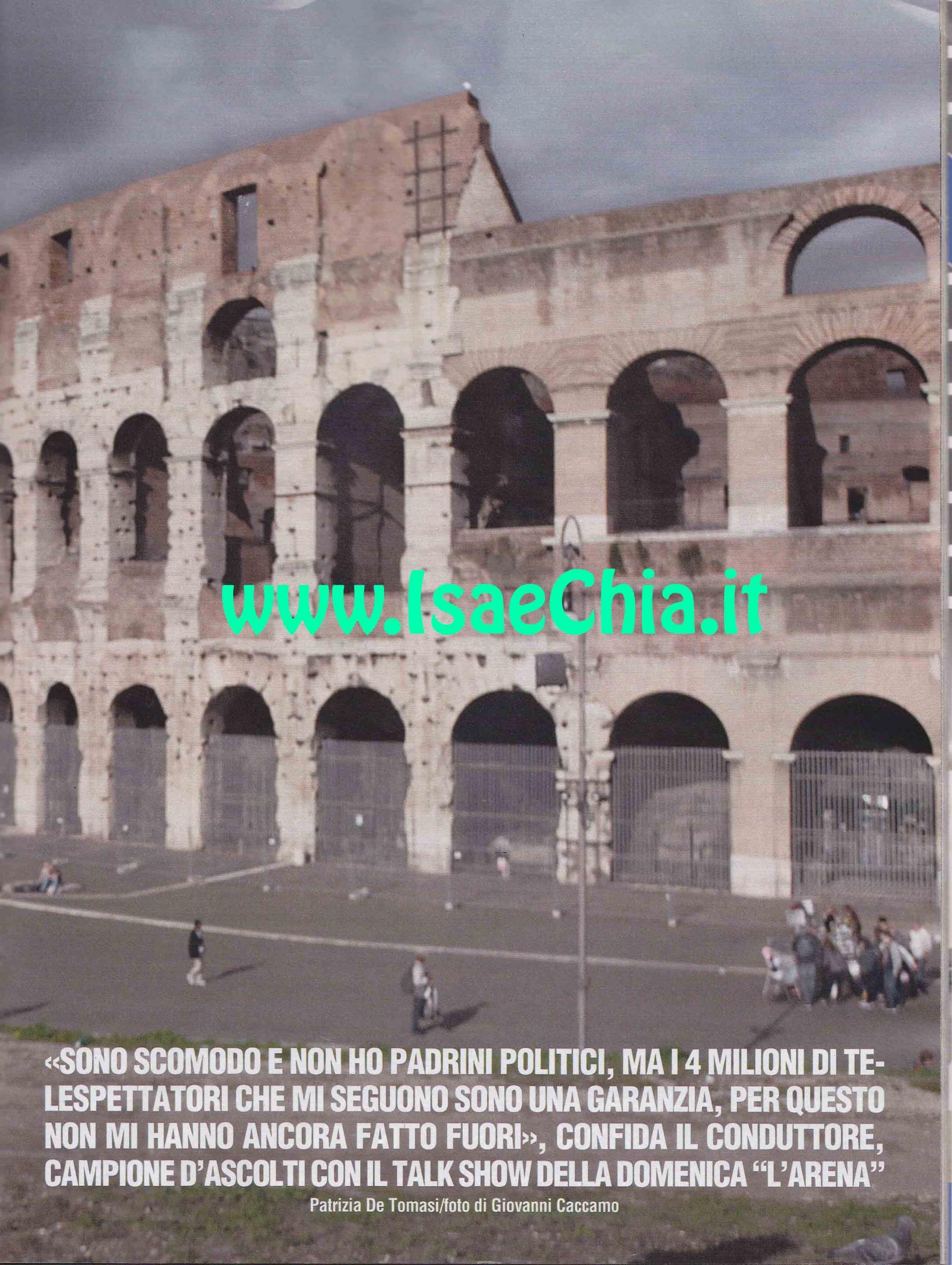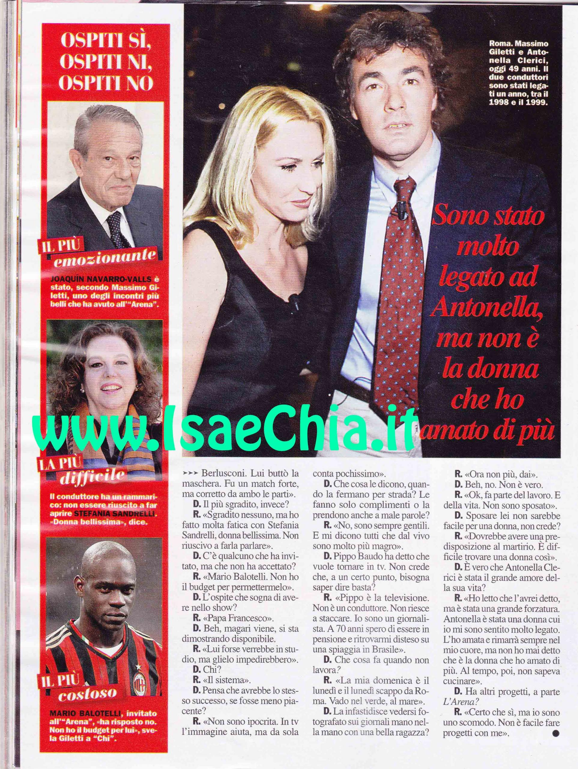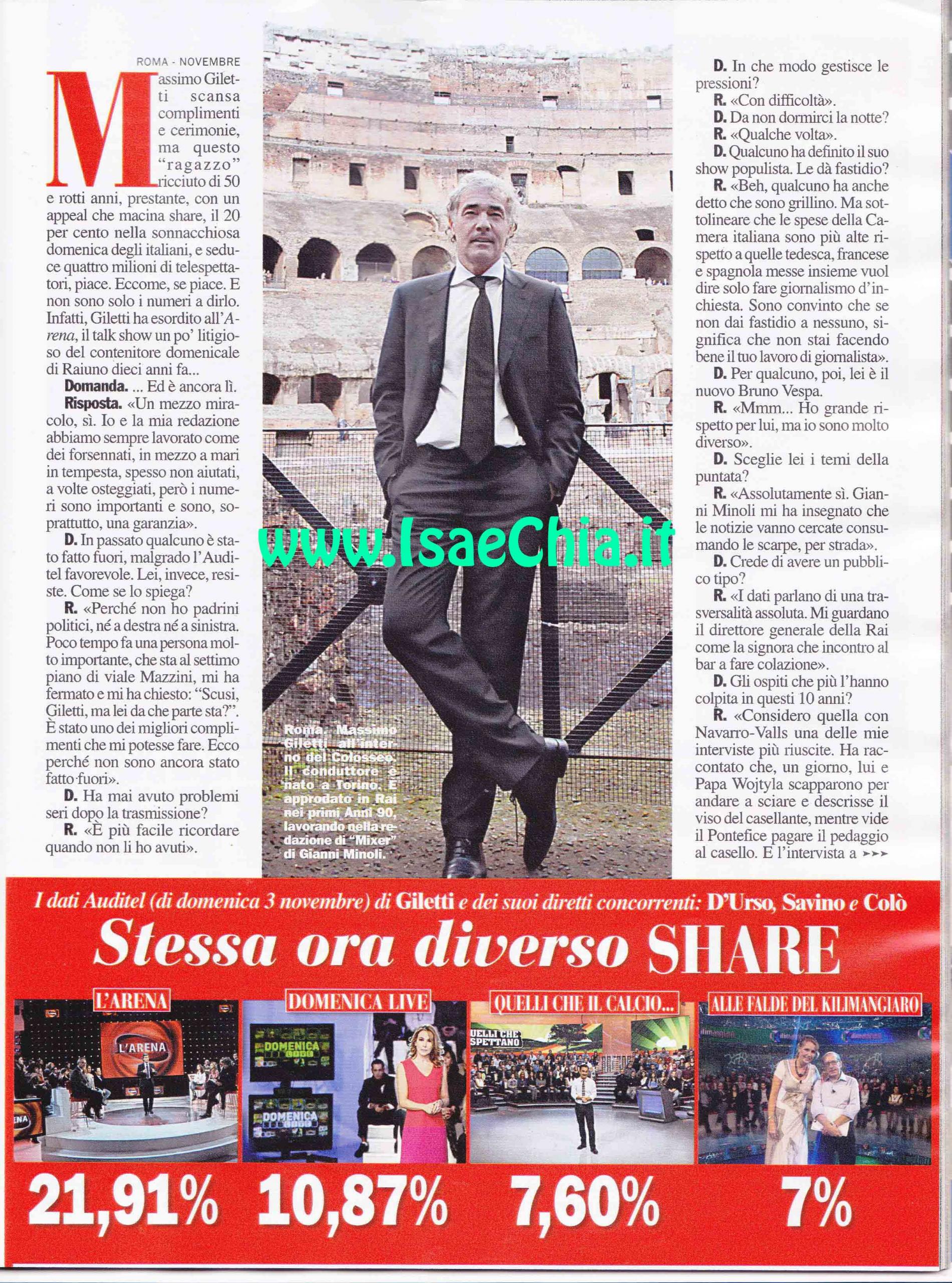 Nei dati Auditel di domenica 3 novembre, L’Arena di Massimo Giletti ha battuto Domenica Live di Barbara D’Urso e Quelli che il calcio di Nicola Savino, raggiungendo quasi il 22% di share, contro l’11 e l’8 (scarsi) degli altri due. “Il mio show è partito dieci anni fa…e siamo ancora là: è un mezzo miracolo. Io e la mia redazione siamo sempre al lavoro e i numeri sono importanti, una garanzia. Restiamo in tv perché non ho padrini politici, né di destra né di sinistra. E’ più facile chiedermi quand’è che non ho avuto problemi dopo il programma, piuttosto che quando ne ho avuti: gestisco le pressioni con difficoltà. Mi hanno detto di essere populista, e anche di essere un grillino, ma sottolineare che le spese della Camera italiane sono più alte di quelle all’estero vuol dire solo fare giornalismo d’inchiesta. Scelgo io i temi delle puntate: Gianni Minoli mi ha insegnato che le notizie vanno cercate consumando le scarpe, per strada. Considero quella con Navarro-Valls una delle mie interviste più riuscite, perché ha raccontato un Papa Wojtyla inedito, e quella di Silvio Berlusconi, che si tolse la maschera. Ho fatto molta fatica a far parlare Stefania Sandrelli. Ho invitato Mario Balotelli ma non ha accettato: non ho il budget per permettermelo. La gente per strada è sempre gentile, e di solito mi dice che sono più magro! Pippo Baudo è la tv, non è un conduttore. Io, invece, a 70 anni, spero di andare in pensione e su una spiaggia del Brasile. Non mi dà più fastidio vedermi fotografato mano nella mano con una ragazza: è lavoro. Non sono sposato: una donna, per farlo, dovrebbe avere una predisposizione al martirio. Antonella Clerici è stata una donna alla quale sono stato molto legato, l’ho amata, ma non ho mai detto che è la donna che ho amato di più”.