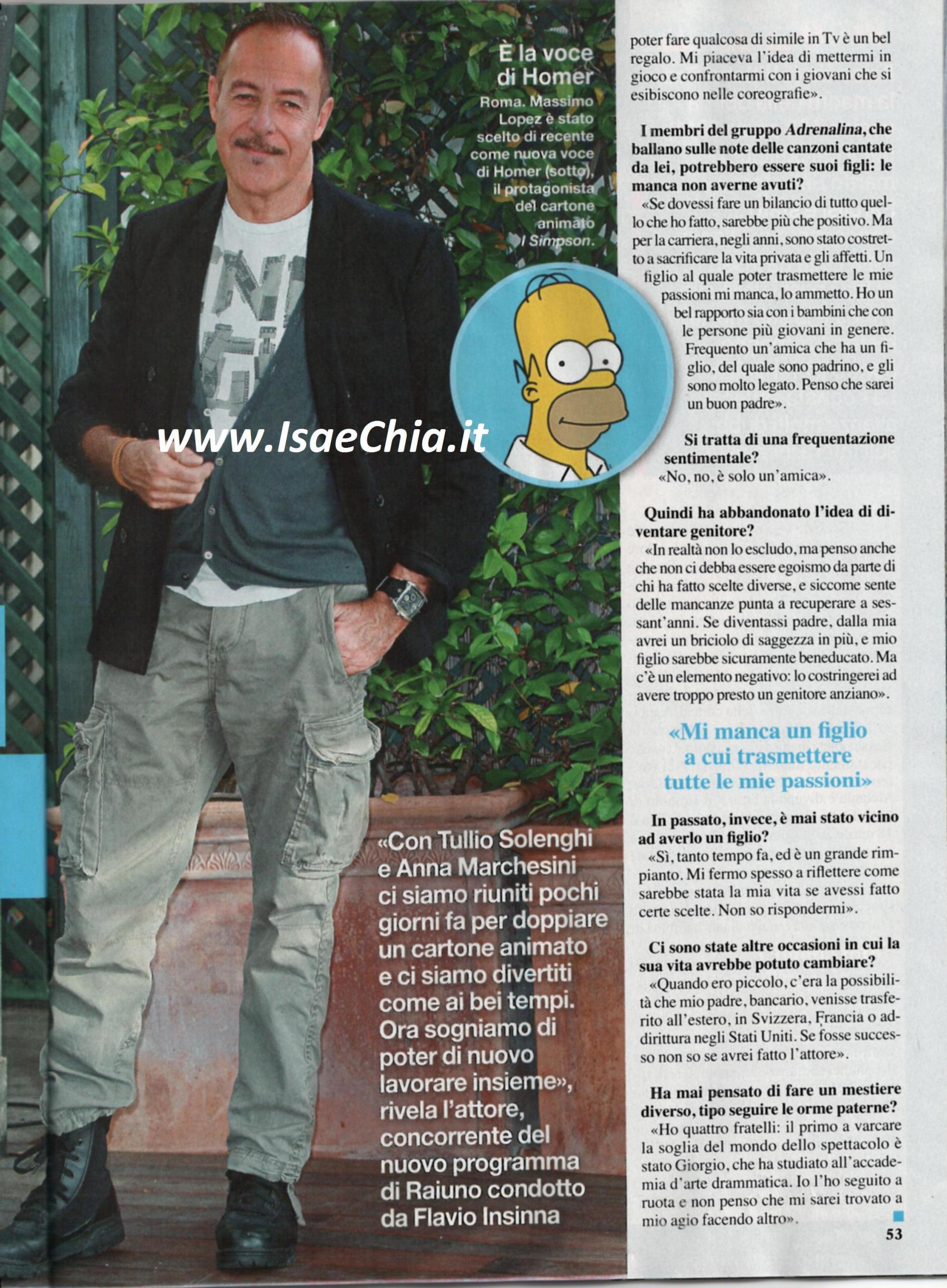 Lo showman Massimo Lopez racconta: “Sono tornato a lavorare con Anna Marchesini e Tullio Solenghi. Ci è sembrato di esser tornati negli anni ’80! Non abbiamo mai smesso di frequentarci e sentirci e quando mio fratello Giorgio, direttore di doppiaggio, ci ha proposto di lavorare insieme, abbiamo accettato con entusiasmo. Insieme abbiamo doppiato un cartone animato, che si chiama Otto Rino. Le circostanze ci hanno portato a prendere strade diverse, ma tutte le volte che sarà possibile collaboreremo di nuovo. La malattia di Anna, l’artrite reumatoide, non ha modificato il nostro rapporto, né il nostro modo di relazionarci: in sala doppiaggio ridevamo con le lacrime. Non ci siamo limitati a ricordare i tempi passati, ci sentivamo come se avessimo 16 anni”. Massimo al momento è uno dei coach nel programma La pista: “Ho accettato subito perché Flavio Insinna è una garanzia. La pista mi permette di esibirmi come cantante e da qualche tempo sto girando con spettacoli con una buona dose di musica. Poter fare qualcosa di simile in tv è un regalo”. Quando gli si fa notare che i membri del gruppo Adrenalina, che si esibisce sulle sue canzoni, potrebbero essere suoi figli, risponde: “Per la carriera ho sacrificato la vita privata e gli affetti e un figlio a cui poter trasmettere le mie passioni mi manca, lo ammetto. Ho un buon rapporto sia con i bambini che con le persone più giovani in genere. Sono padrino del figlio di un’amica e a lui sono molto legato. Penso che sarei un buon padre. Non ho abbandonato l’idea di diventare genitore, ma credo anche che non ci debba essere egoismo da parte di chi ha fatto scelte diverse, e siccome ne sente la mancanza, vuole recuperare a 60 anni. Mio figlio sarebbe sicuramente ben educato, ma lo costringerei ad avere un padre anziano. Tanto tempo fa sono stato vicino ad avere un figlio e ho un grande rimpianto. Spesso rifletto su come sarebbe stata la mia vita se avessi fatto altre scelte e non so rispondermi”.