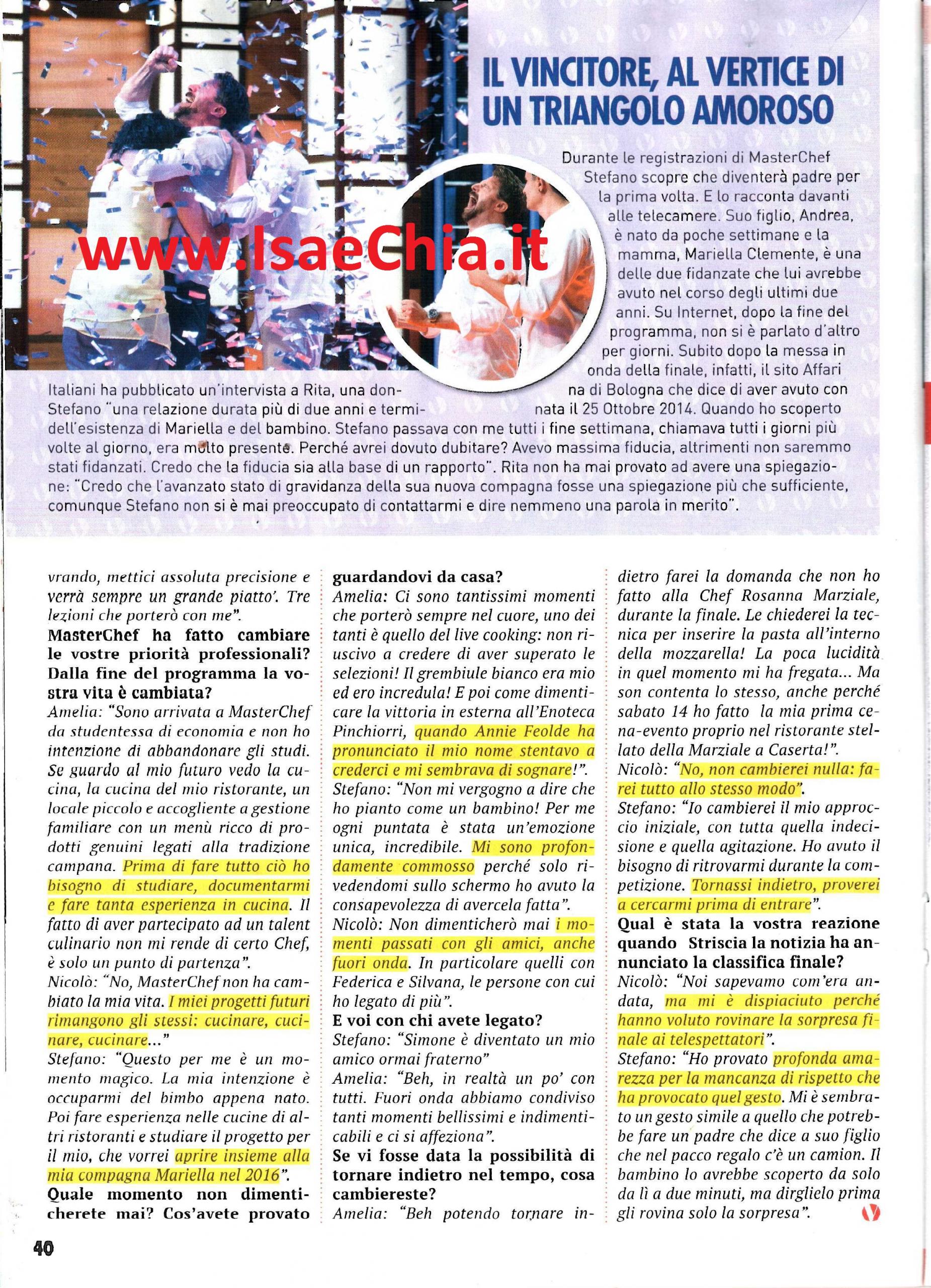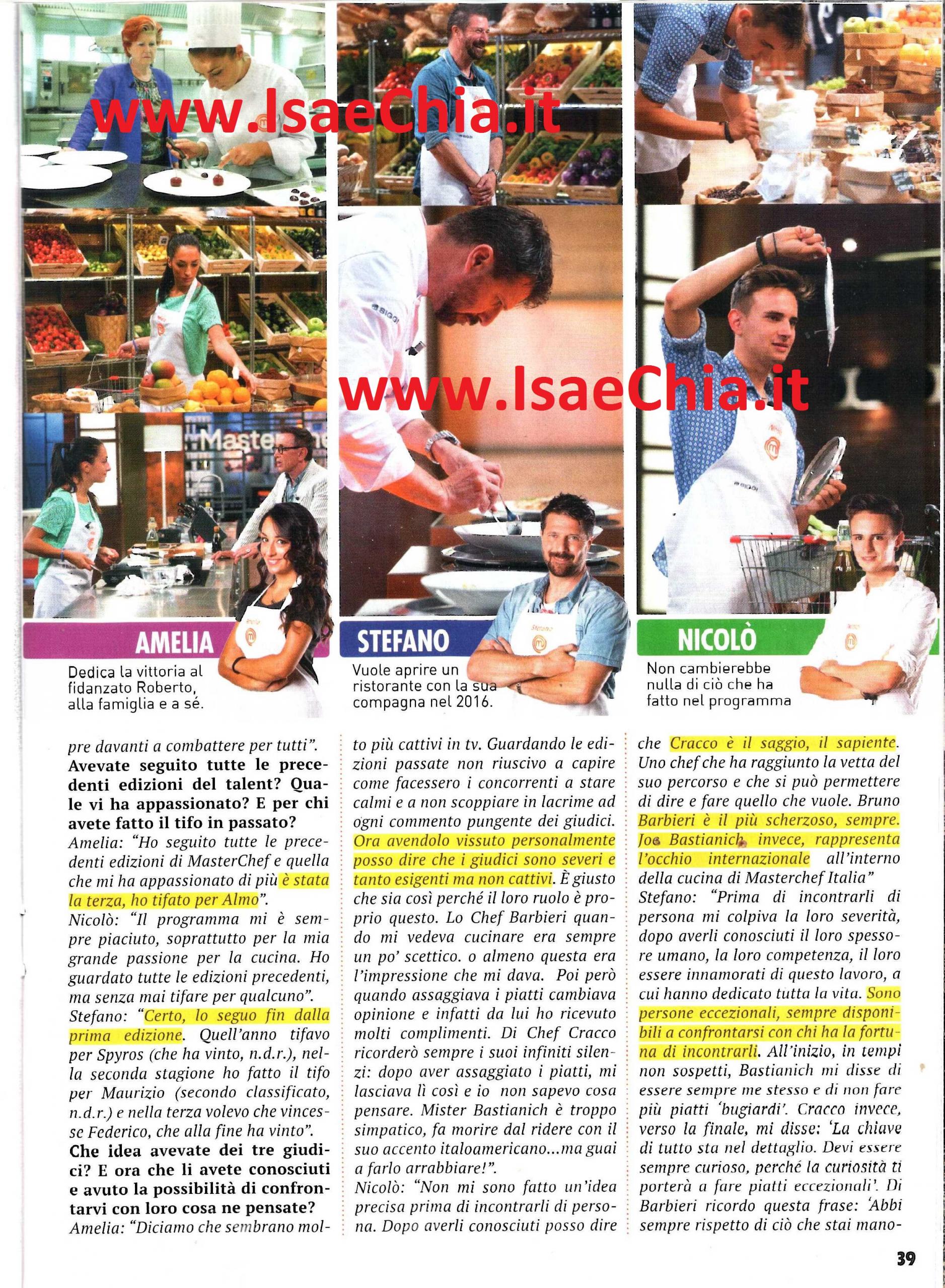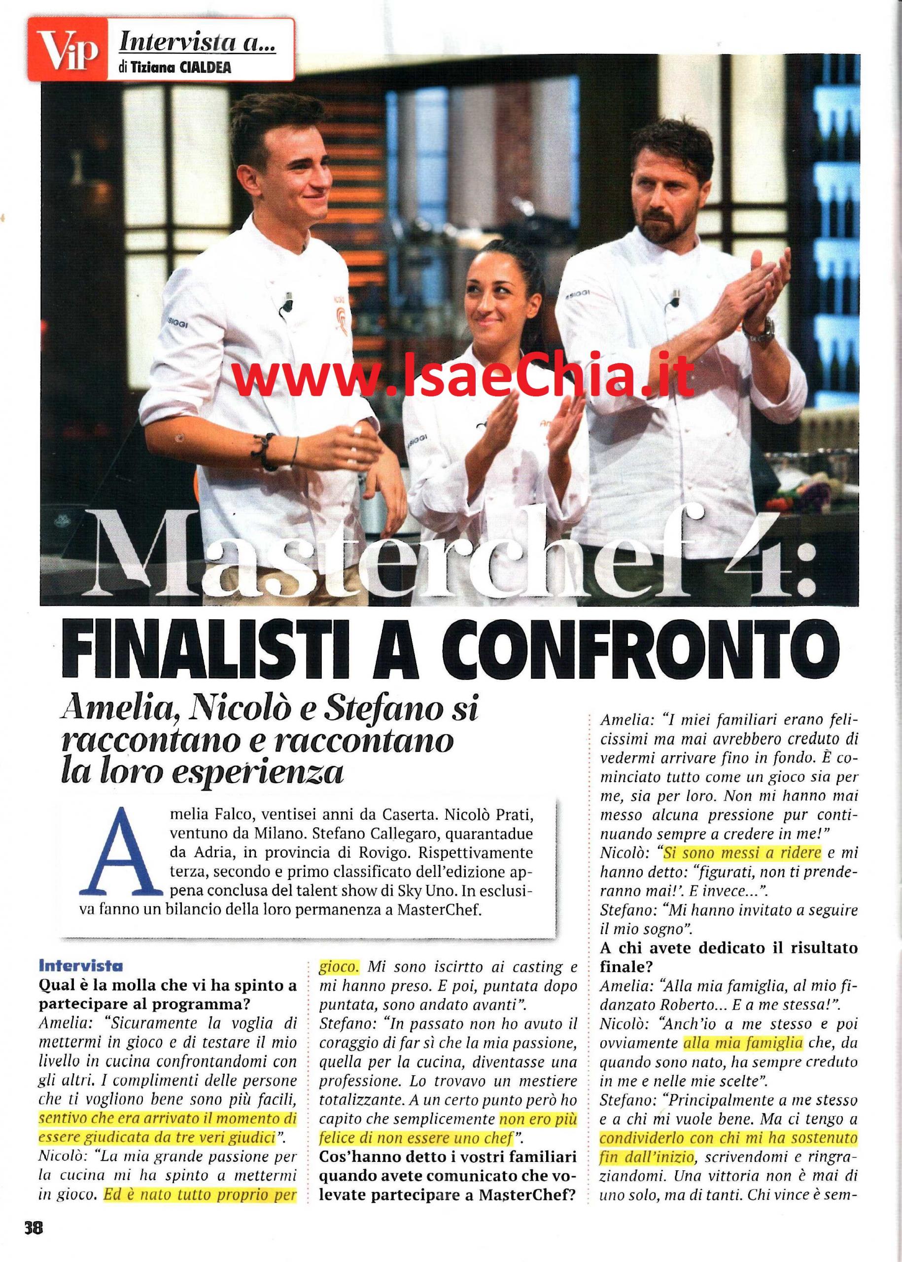 MasterChef è senza dubbio uno dei programmi di punta di Sky: la sfida tra cuochi amatoriali inchioda agli schermi molti telespettatori ed è giunto ad una quarta edizione, conclusa poco fa con la vittoria di Stefano Callegaro. Con lui in finale, la 26enne casertana Amelia Falco e il 21enne milanese Nicolò Prati. “E’ stata la voglia di mettermi in gioco e testare il mio livello in cucina confrontandomi con gli altri a farmi partecipare. I complimenti delle persone che ti vogliono bene sono più facili, sentivo che era arrivato il momento di essere giudicata da tre veri giudici!” dice Amelia. “La mia passione per la cucina ha fatto tutto; ho fatto i casting per gioco e puntata dopo puntata sono andato avanti” ha detto invece Nicolò. “In passato non ho avuto il coraggio di far sì che la mia passione diventasse una professione. Lo trovavo un lavoro totalizzante. Ad un certo punto, però, ho capito che non ero felice di non essere uno chef. I miei famigliari mi hanno incitato a seguire il mio sogno” rivela il vincitore. E la famiglia ha avuto un ruolo importante anche per gli altri: “I miei famigliari erano felicissimi, ma non mi hanno mai messo alcuna pressione e mai avrebbero creduto che sarei arrivata fino alla fine” ha detto l’unica donna del gruppo, mentre il più giovane ha rivelato: “Si sono messi a ridere, dicendo ‘Non ti prenderanno mai’!“. E infatti, tutti e tre dedicano la loro finale alla propria famiglia, oltre che a tutti coloro che li hanno sostenuti. Quando si chiede loro se avevano seguito le edizioni precedenti, Amelia risponde: “Le ho seguite tutte, ma quella che mi ha appassionato di più è stata la terza, e tifavo per Almo“. “Mi è sempre piaciuto, soprattutto per la mia passione per la cucina, ma senza mai tifare per qualcuno in particolare” dice il secondo. “L’ho seguito sempre, fin dalla prima edizione, in cui tifavo per Spyros, che poi ha vint0; nella seconda tifavo per Maurizio, che poi si è classificato secondo; nella terza per Federico, che poi ha vinto” racconta il primo classificato. E per quanto riguarda i giudici? Cosa ne pensano ora che li conoscono da vicino? “In tv sembrano più cattivi, non riuscivo a capire come i concorrenti potessero ascoltare i loro giudizi senza piangere; ora, avendolo vissuto in prima persona posso dire che sono severi e tanto esigenti, ma non cattivi. Quando mi guardava cucinare, lo chef Bruno Barbieri era sempre un po’ scettico. Di Carlo Cracco ricorderò sempre i lunghissimi silenzi: dopo aver assaggiato i miei piatti, mi lasciava lì e io non sapevo cosa pensare. Joe Bastianich è troppo simpatico col suo accento italo-americano, ma guai a farlo arrabbiare!” dice Amelia. “Cracco è il saggio, il sapiente, uno chef che ha raggiunto il picco e può permettersi di dire ciò che vuole; Barbieri è il più scherzoso, sempre, mentre Bastianich rappresenta l’occhio internazionale nella cucina di Masterchef Italia” osserva Nicolò. Infine, Stefano: “Sono eccezionali, sempre disponibili a confrontarsi con chi ha la fortuna di incontrarli. Cracco mi ha suggerito: ‘La chiave di tutto sta nel dettaglio. Devi essere sempre curioso, perché la curiosità ti porterà a fare piatti eccezionali’. Barbieri mi ha detto di metterci sempre precisione, Bastianich di essere me stesso e non fare piatti ‘bugiardi’“. Quanto ai progetti futuri, i tre concorrenti raccontano: “Sono entrata come studentessa di Economia e non ho intenzione di abbandonare gli studi. Se guardo al mio futuro, mi vedo nella cucina del mio ristorante a conduzione familiare, ma prima di tutto ciò ho bisogno di studiare e fare esperienza” dice Amelia. “I miei progetti rimangono gli stessi: cucinare, cucinare, cucinare” dice Nicolò. “Ora la mia intenzione è occuparmi di mio figlio appena nato” dice invece Stefano, “ma vorrei aprire un mio ristorante con la mia compagna entro il 2016“. Infine, i tre finalisti raccontano la loro reazione al servizio di Striscia la notizia che ha rivelato chi sarebbe stato il vincitore: “Noi sapevamo com’era andata, ma mi è dispiaciuto perché hanno rovinato la sorpresa ai telespettatori” dice Nicolò, mentre Stefano commenta: “Ho provato profonda amarezza per la mancanza di rispetto di quel gesto. Mi è sembrato il gesto di un padre che dice al figlio che nel pacco regalo c’è un camion: il bambino lo avrebbe scoperto dopo due minuti, ma dirlo prima gli ha solo rovinato la sorpresa!”.