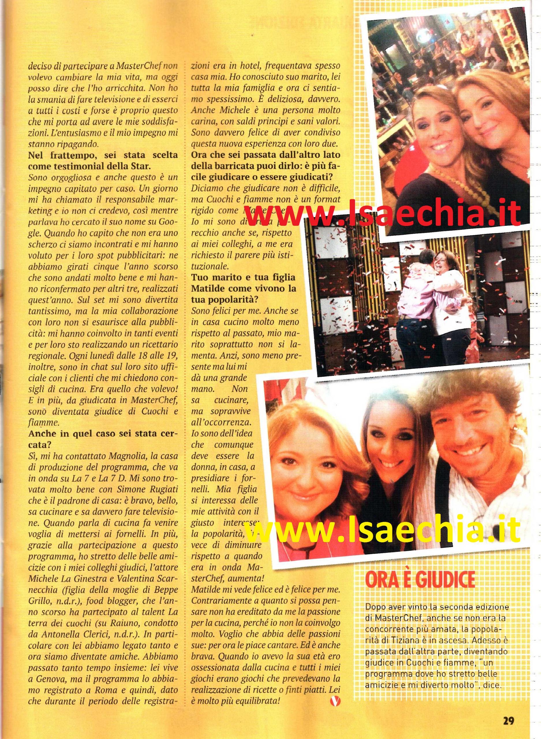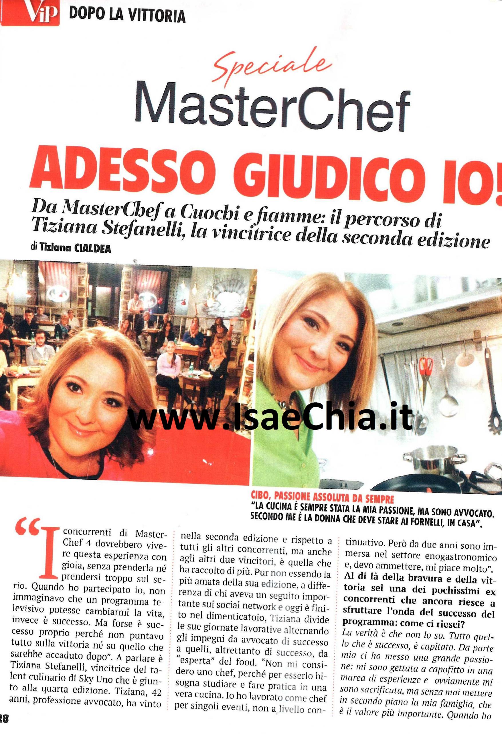 Due anni fa, MasterChef Italia è stato vinto da Tiziana Stefanelli, avvocato 42enne che, pur non essendo la più amata, è riuscita a convincere di più i terribili giurati: gli chef Bruno Barbieri e Carlo Cracco e l’imprenditore della cucina italiana negli Stati Uniti Joe Bastianich. Adesso, MasterChef è giunto alla quarta edizione e Tiziana commenta: “I nuovi concorrenti dovrebbero vivere quest’esperienza con gioia, senza prendersi troppo sul serio. Quando ho partecipato io, non immaginavo che il programma potesse cambiarmi la vita, invece è successo. Da parte mia ci ho messo tanta passione, tutto quello che è successo, è capitato. Mi sono sacrificata, ma senza mettere mai la famiglia al secondo posto. Quando ho deciso di partecipare, non volevo cambiare la mia vita, ma oggi posso dire che l’ho arricchita. Non ho la smania di essere in tv a tutti i costi e forse è questo che mi porta ad avere tante soddisfazioni. Sono stata chiamata come testimonial della Star e anche questo è accaduto per caso: sono stata contattata dal responsabile marketing e non ci credevo, così mentre parlava, ho digitato il suo nome su Google. Abbiamo girato cinque spot lo scorso anno e sono andati bene, così abbiamo firmato per altri tre. Inoltre, mi hanno coinvolto in tanti eventi e per loro sto realizzando un ricettario regionale. Ogni lunedì dalle 18 alle 19 sono in chat sul loro sito per dare consigli agli utenti. In più, sono diventata giudice di Cuochi e fiamme. In questo caso, mi ha contattata Magnolia. Mi sono trovata molto bene con Simone Rugiati: è bravo e bello e sa fare televisione. Grazie al programma ho stretto amicizia con gli altri giudici, Michele La Ginestra e Valentina Scarnecchia, figlia della moglie di Beppe Grillo e food blogger. Con lei siamo diventate amiche: lei vive a Genova, ma durante le registrazioni del programma era a Roma, frequentava casa mia, ho conosciuto la sua famiglia e ci sentiamo spessissimo. Giudicare non è stato difficile, ma diciamo anche che Cuochi e fiamme non è un format rigido come MasterChef. Mi sono divertita parecchio anche se, rispetto ai miei colleghi, avevo un ruolo più istituzionale“.