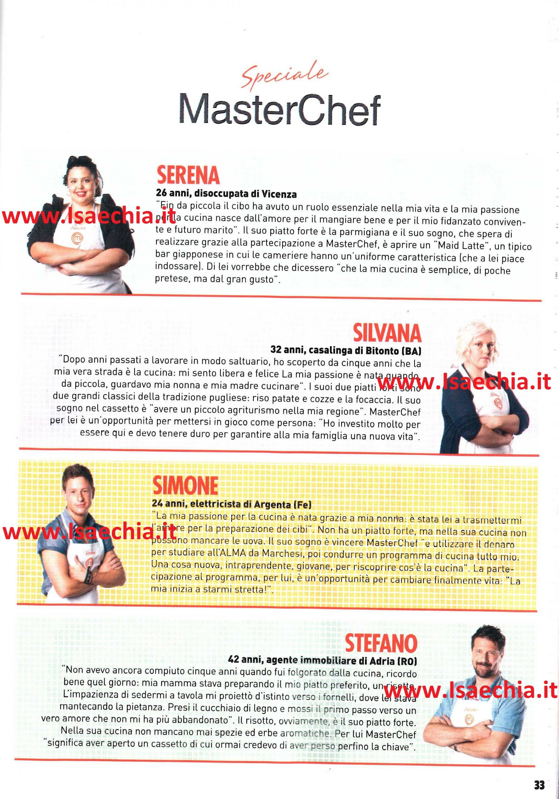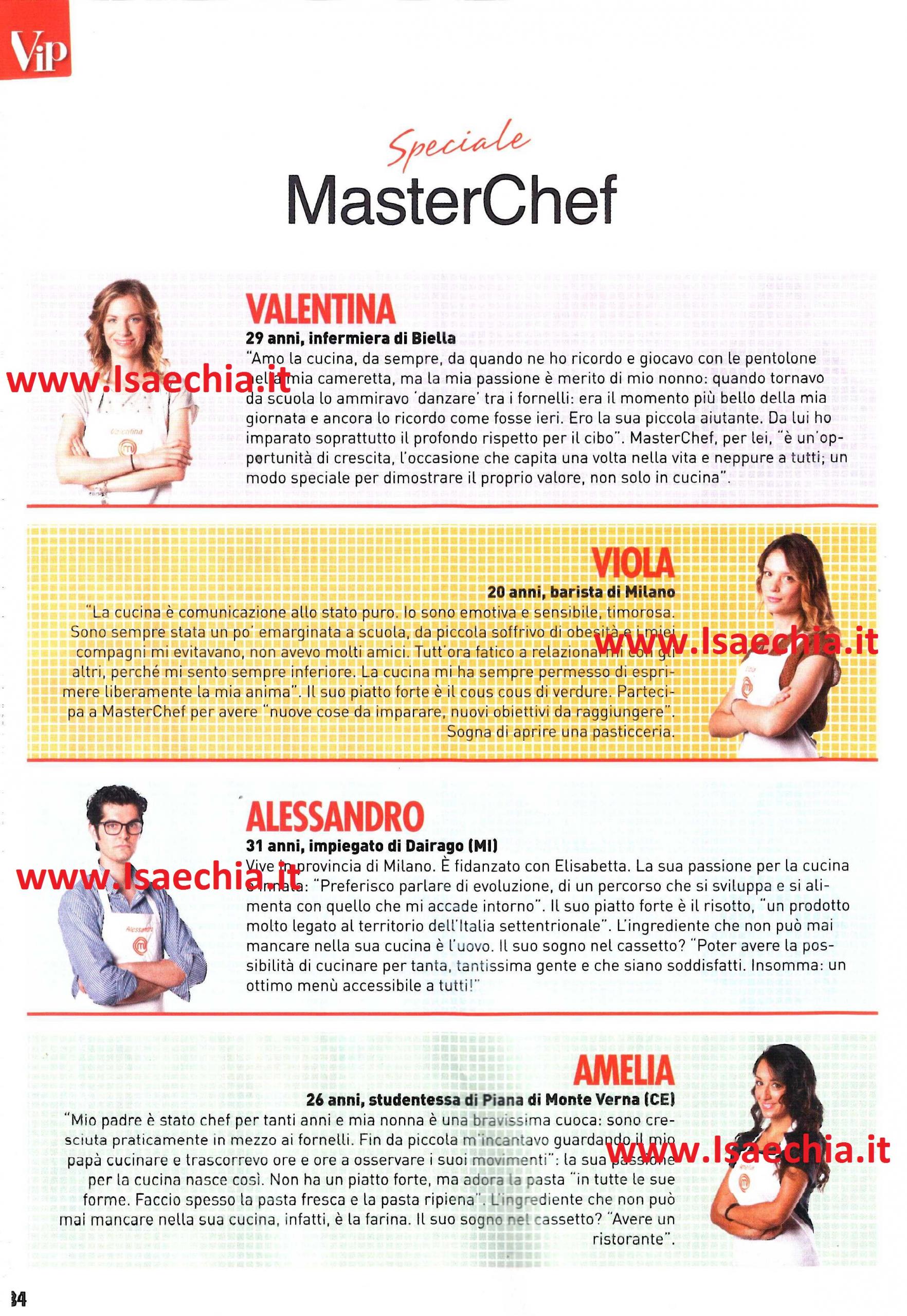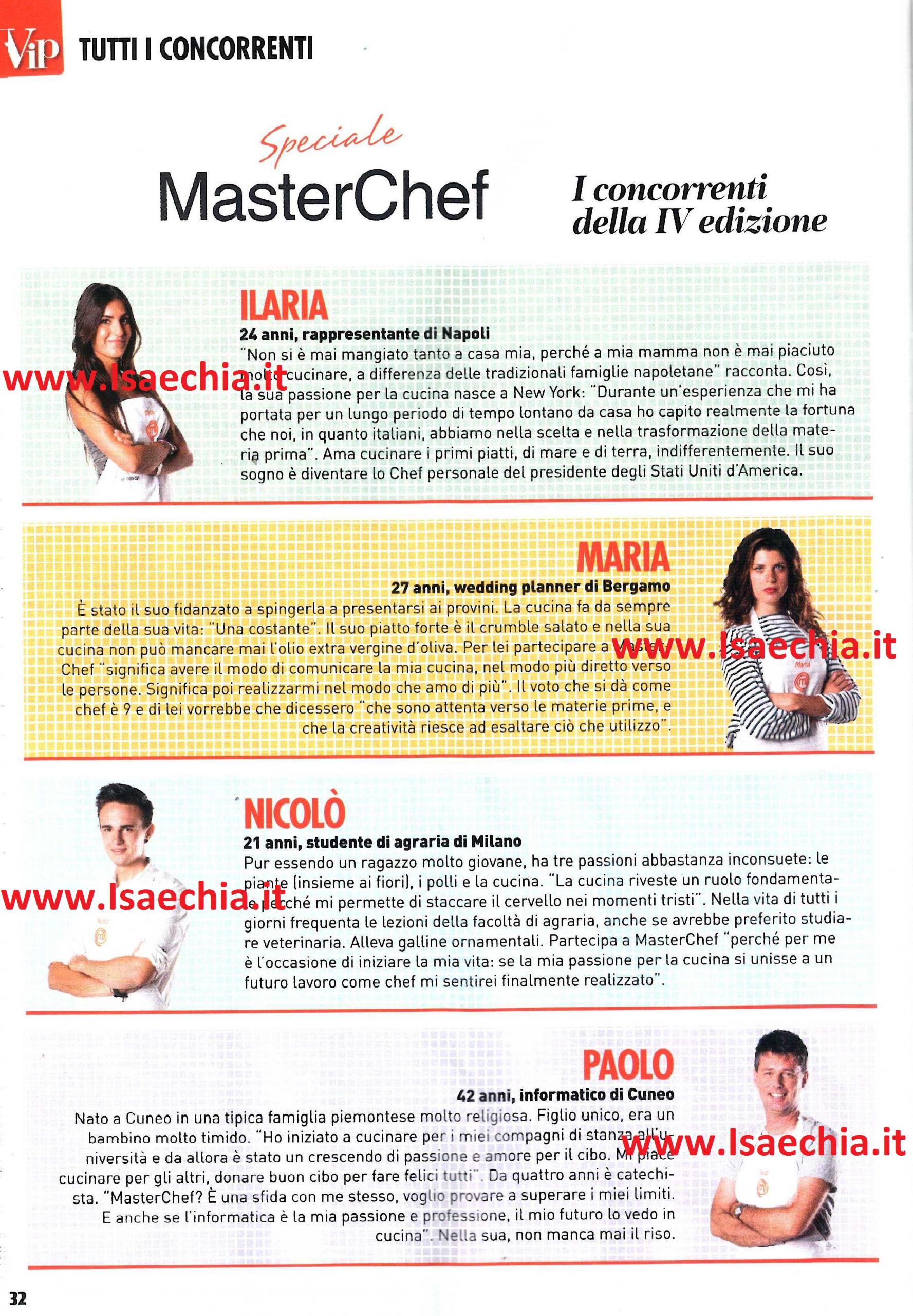 Dopo l’intervista, il settimanale Vip presenta in anteprima tutti i 20 concorrenti della quarta edizione: la rappresentante napoletana Ilaria; la wedding planner bergamasca Maria; Nicolò, lo studente 21enne con la passione per polli, galline e fiori; l’informatico e catechista piemontese Paolo; Serena, 26enne vicentina che sogna di aprire il tipico bar giapponese detto Maid Latte; la casalinga barese Silvana; l’elettricista Simone, che sogna di vincere per condurre un programma tutto suo; l’agente immobiliare Stefano, l’infermiera biellese Valentina; la barista milanese Viola, che da piccola soffriva di obesità; l’impiegato milanese Alessandro; la studentessa casertana Amelia; la bancaria di Roma Arianna; o ancora Carmine, nato in Calabria e ora camionista in Veneto; Chiara, che ha vissuto in Arabia, Grecia, Spagna ed Egitto; l’artigiano veneto Fabiano; Federica, laureata in Giurisprudenza, che fa la casalinga a Danzica, in Polonia, dove vive con compagno e figli; Filippo, inventore del “coniglio pescatore”; Gabriele, che prende la sua passione per la cucina dall’esigenza di un’alimentazione particolare per problemi di salute, e Giuseppe, cinquantenne funzionario pubblico di Roma.