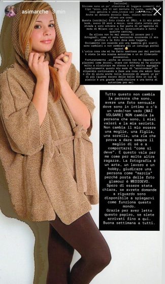 Non cambia il mio essere una moglie, una figlia, una sorella, una zia che prova a dare sempre il meglio di sé e a comportarsi “come si deve”. E questo vale per me come per molte altre ragazze. La fotografia è un arte, un lavoro e un hobby, giudicare una persona come “marcia” perché posta delle foto glamour è MEDIOEVO.