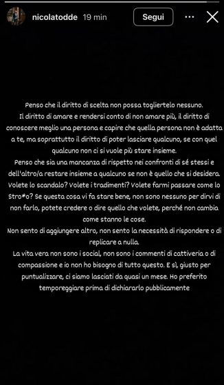 Non sento di aggiungere altro, non sento la necessità di rispondere o di replicare a nulla. La vita vera non sono i social, non sono i commenti di cattiveria o di compassione e io non ho bisogno di tutto questo. E sì, giusto per puntualizzare, ci siamo lasciati da quasi un mese. Ho preferito temporeggiare prima di dichiararlo pubblicamente.