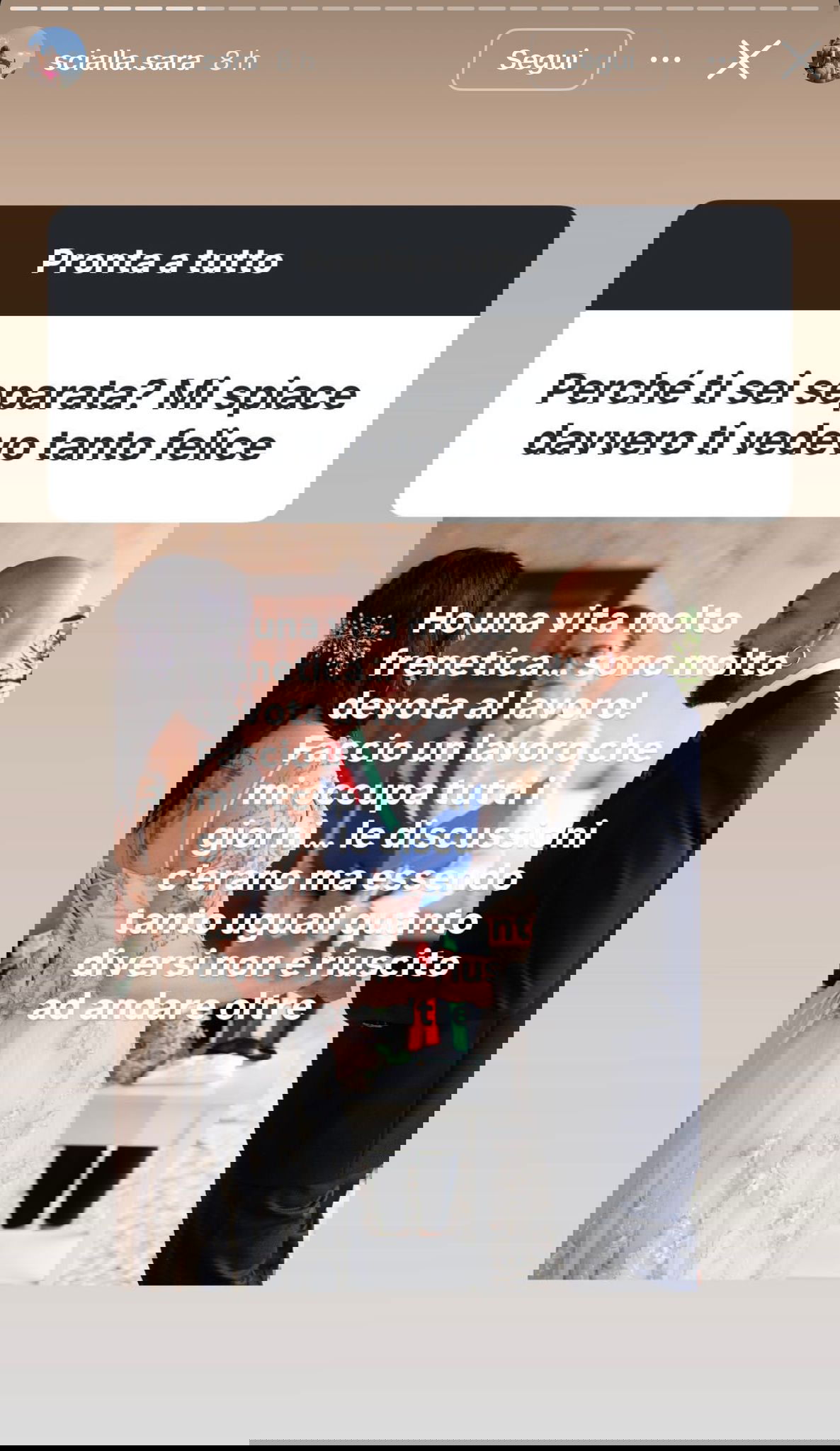 Ho una vita molto frenetica. Sono molto devota al lavoro, faccio un lavoro che mi occupa tutti i giorni. Le discussioni c’erano, ma essendo tanto uguali quanto diversi non è riuscito ad andare oltre.
