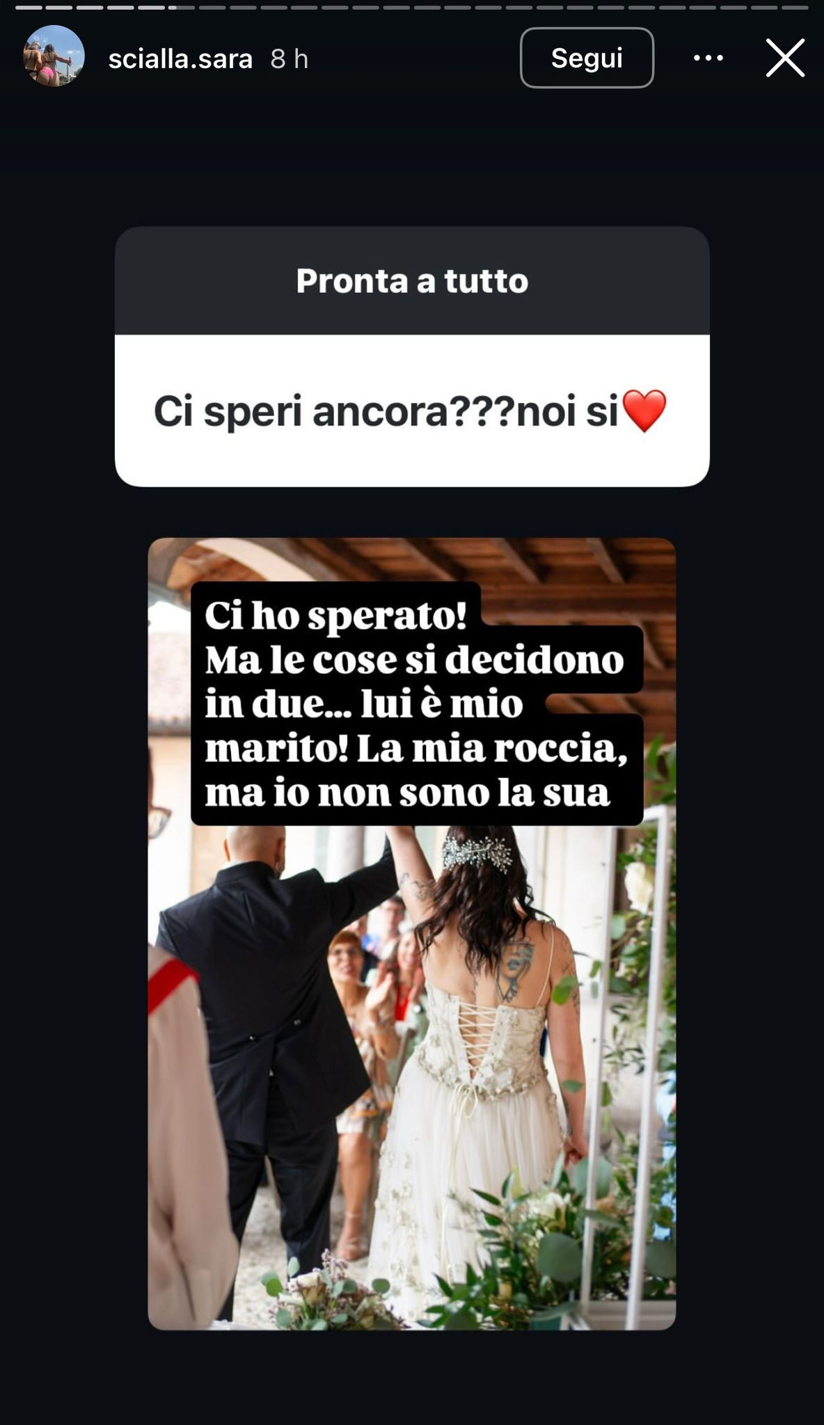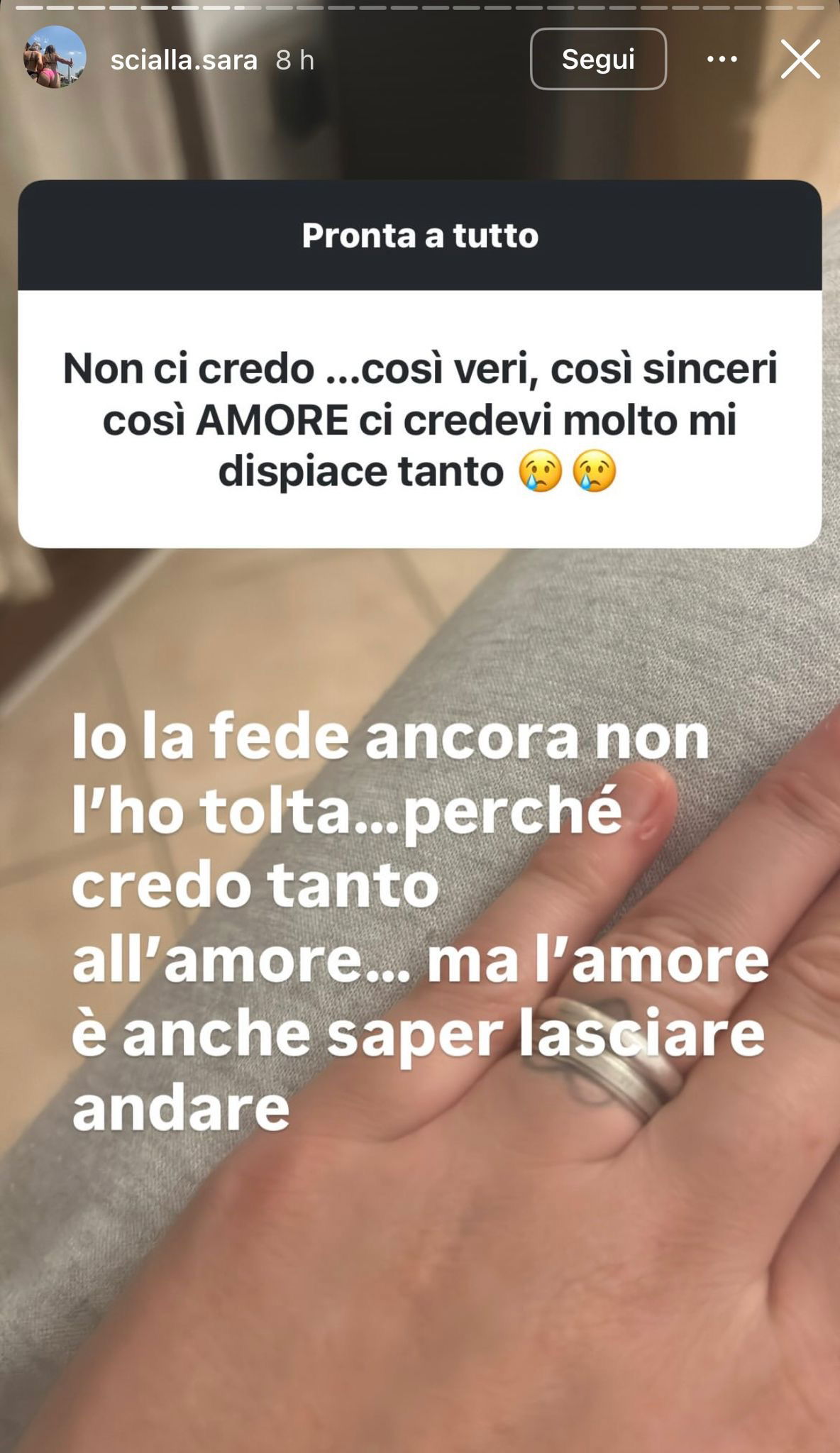 Ci ho sperato, le cose si decidono in due. Lui è mio marito, la mia roccia, ma io non sono la sua. Io la fede ancora non l’ho tolta, perché credo tanto all’amore, ma l’amore è anche saper lasciare andare.