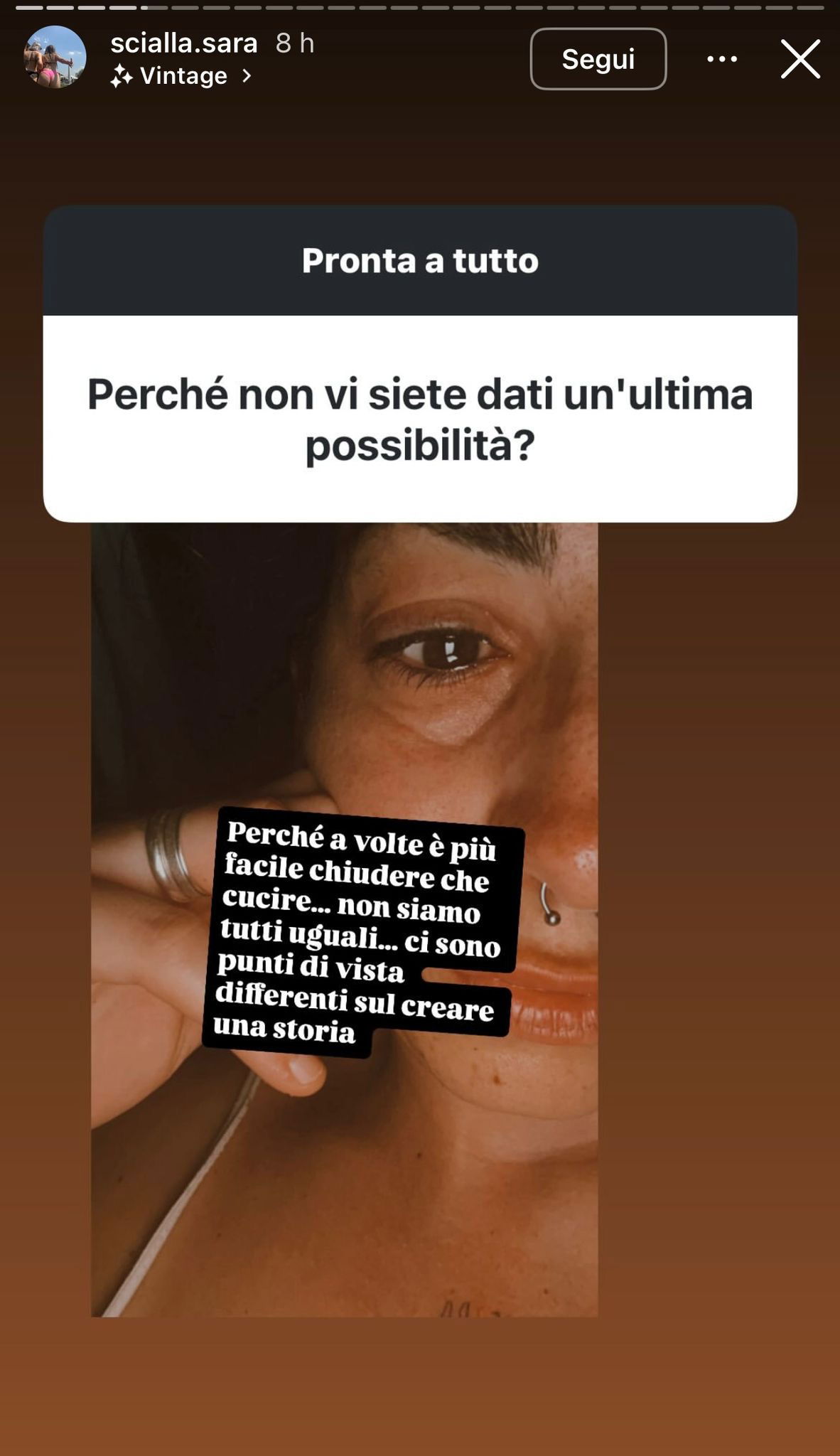 Perché a volte è più facile chiudere che cucire. Non siamo tutti uguali, ci sono punti di vista differenti sul creare una storia. Abbiamo valori molto simili soltanto che abbiamo due caratteri che io sono stra energica, sono molto esplosiva, faccio caos, anche Nicola in mezzo alla gente dà il meglio di sé. Avrei tanto voluto una famiglia con lui. Io la volevo.
