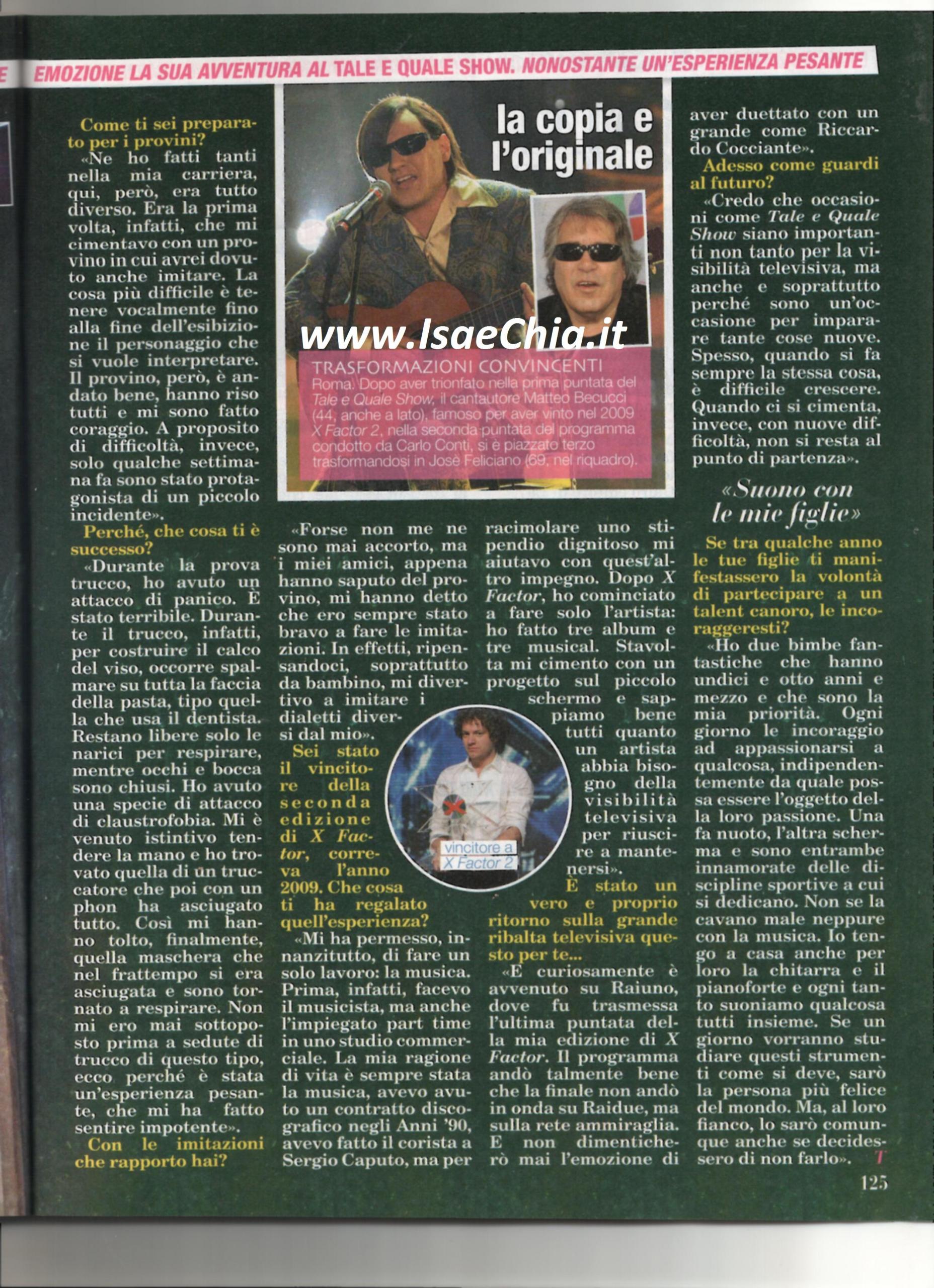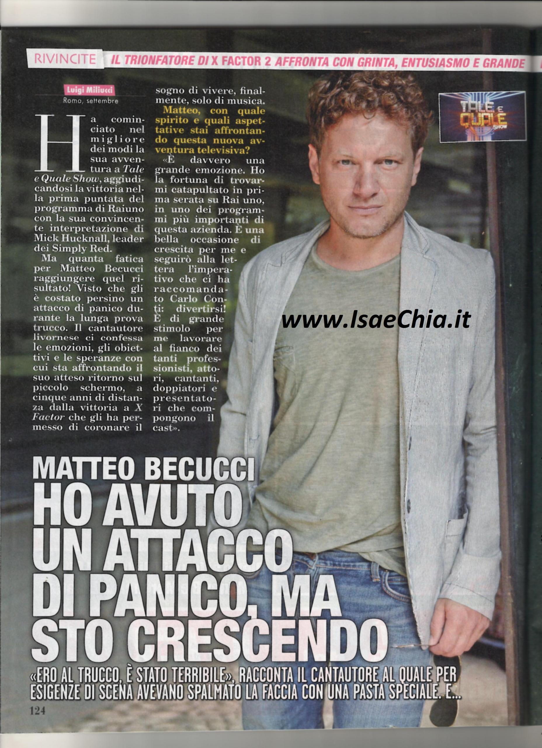 Matteo Becucci ha esordito benissimo al Tale e quale show, vincendo la prima puntata con l’imitazione di Mick Hucknall, leader dei Simply Red: “E’ davvero una grande emozione. Ho la fortuna di trovarmi catapultato in prima serata su Raiuno, in uno dei programmi più importanti di quest’azienda. E’ una bella occasione di crescita e seguirò l’imperativo di Carlo Conti, quello di divertirsi! E’ un grande stimolo lavorare vicino ai grandi attori, cantanti e presentatori che compongono il cast. Di provini ne ho fatti tanti, ma questo era diverso: era la prima volta che avrei dovuto anche imitare e la cosa più difficile è farlo fino alla fine della canzone”. Lo show, però, non ha solo lati positivi: il cantante, infatti, ha avuto un piccolo incidente: “Dopo la prova trucco, sono stato preso da un attacco di panico. Durante il trucco, per costruire il calco, occorre spalmare tutta la faccia di una pasta simile a quella del dentista. Restano libere solo le narici, mentre occhi e bocca sono coperti, così ho avuto una specie di attacco di claustrofobia. Mi è venuto istintivo tendere la mano e ho trovato quella di un truccatore, che ha asciugato tutto con il phon e così mi hanno finalmente tolto la maschera. E’ stata un’esperienza pesante, che mi ha fatto sentire impotente. Con le imitazioni, invece, va meglio: i miei amici mi hanno detto che sono sempre stato bravo ad amare”. Ricordando invece i tempi di X Factor, di cui Matteo è stato vincitore battendo anche Noemi, il cantante racconta: “X Factor mi ha permesso, innanzitutto, di fare ciò che amo: la musica. La mia ragione di vita è sempre stata quella: avevo avuto un contratto discografico a fine anni ’90, ho fatto il corista con Sergio Caputo, ma per racimolare uno stipendio dignitoso facevo l’impiegato part-time in uno studio commerciale. Dopo X Factor ho pubblicato tre album e partecipato a musical. Curiosamente il mio ritorno è stato su Raiuno, dove è stata trasmessa l’ultima puntata di X Factor: il programma andò così bene che la finale andò in onda sulla rete ammiraglia anziché su Raidue. Credo che Tale e quale show non sia importante solo per la visibilità televisiva, ma anche per imparare cose nuove”. Infine, quando le si chiede cosa farebbe se le sue figlie esprimessero la volontà di seguire la sua strada, Matteo risponde: “Ho due figlie fantastiche, di 11 e 8 anni, che sono la mia priorità. Ogni giorno le incoraggio ad interessarsi a qualcosa, a prescindere da cosa sia. Una fa nuoto e l’altra scherma e non se la cavano male con la musica. Se un giorno decidessero di suonare uno strumento seriamente, ne sarei contento, ma sarò al loro fianco anche se decideranno di non farlo”.