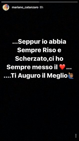 I suoi pretendenti, inevitabilmente, sono stati accolti dalla delusione per le parole spese dalla brasiliana e il più amareggiato sembrava essere Mattia Marciano, che ha immediatamente lasciato lo studio senza rivolgere neppure un ultimo saluto alla tronista. Una volta in camerino, il campano ha esternato il suo stato d’animo anche su Instagram: