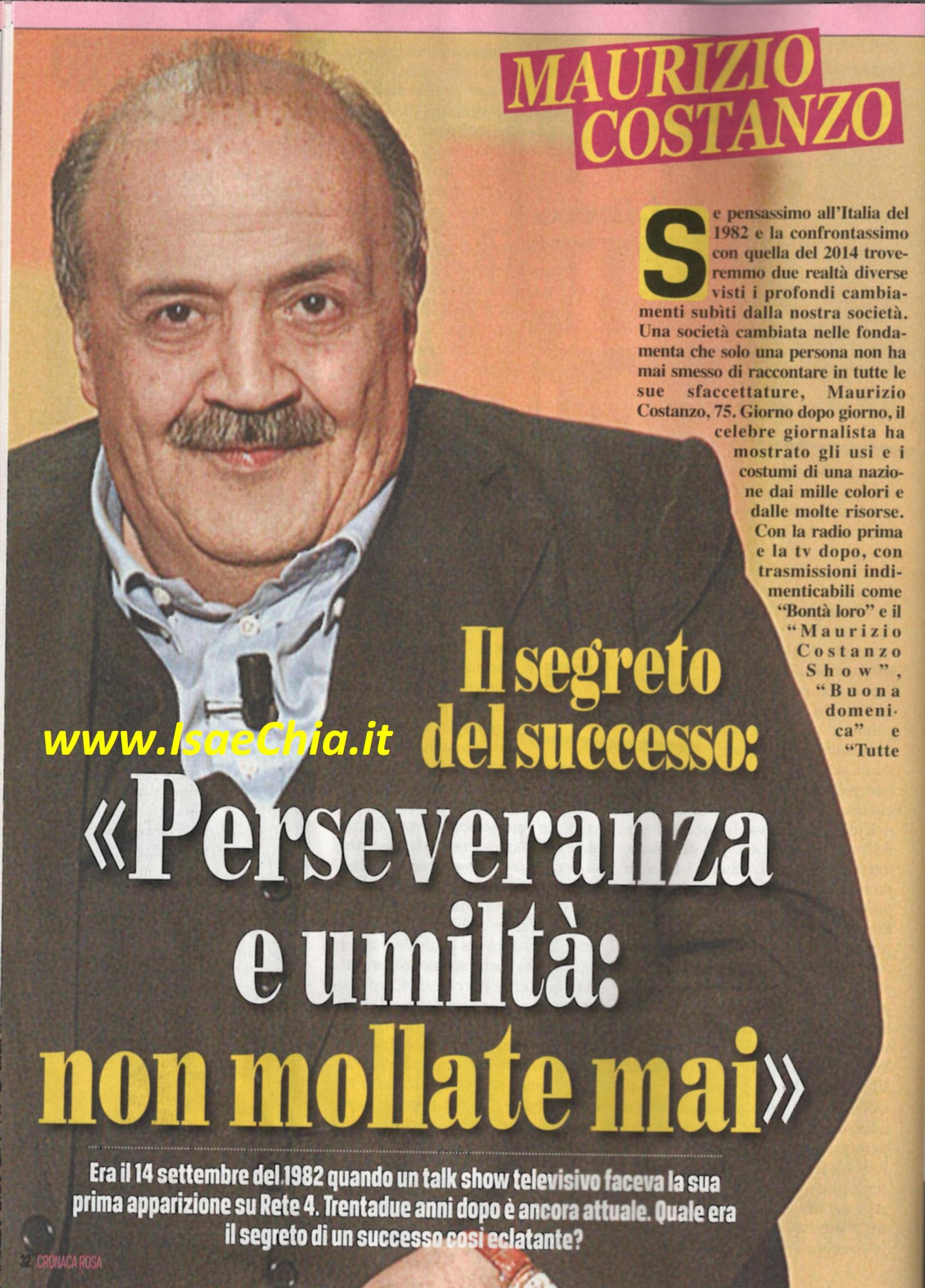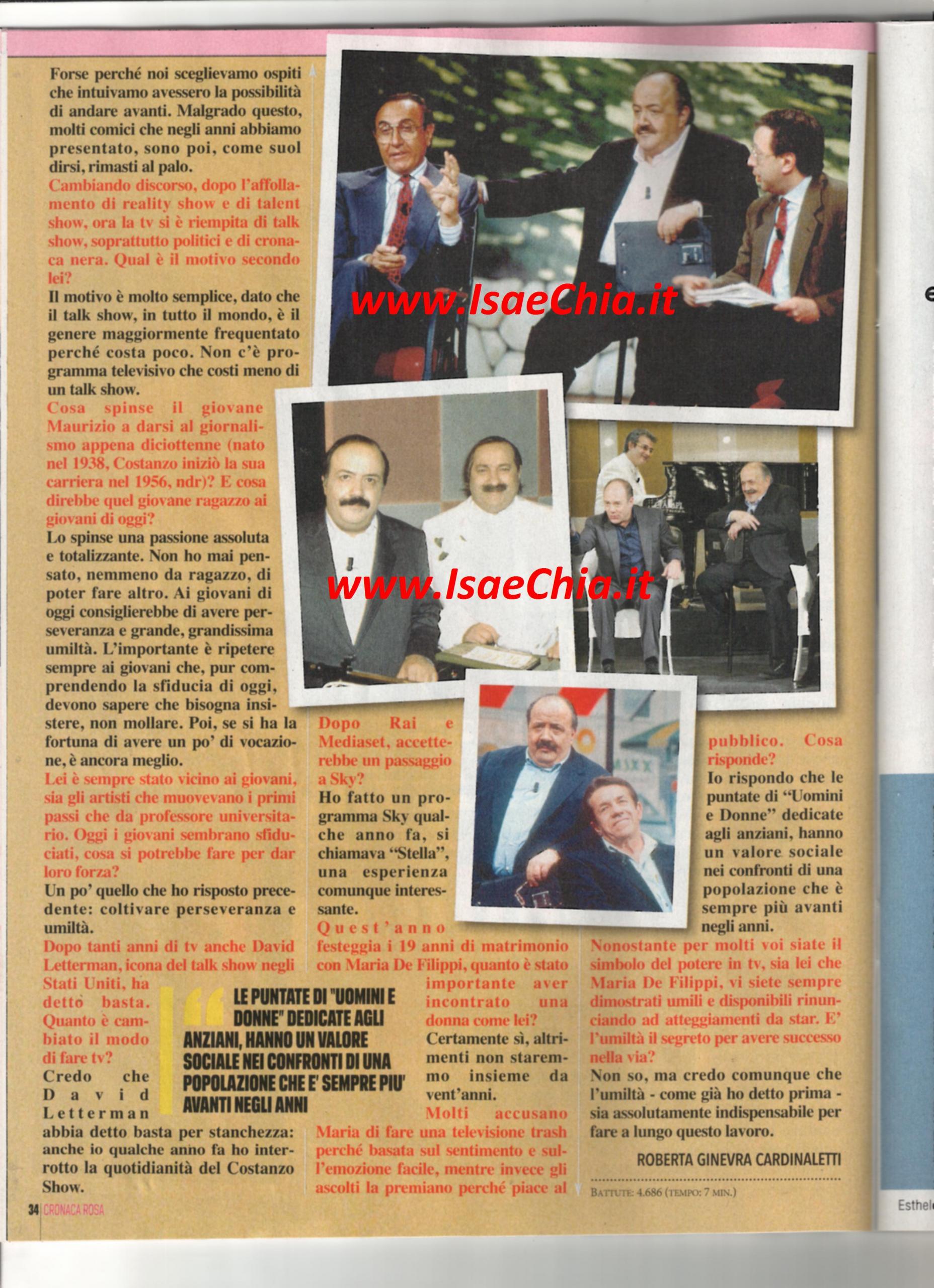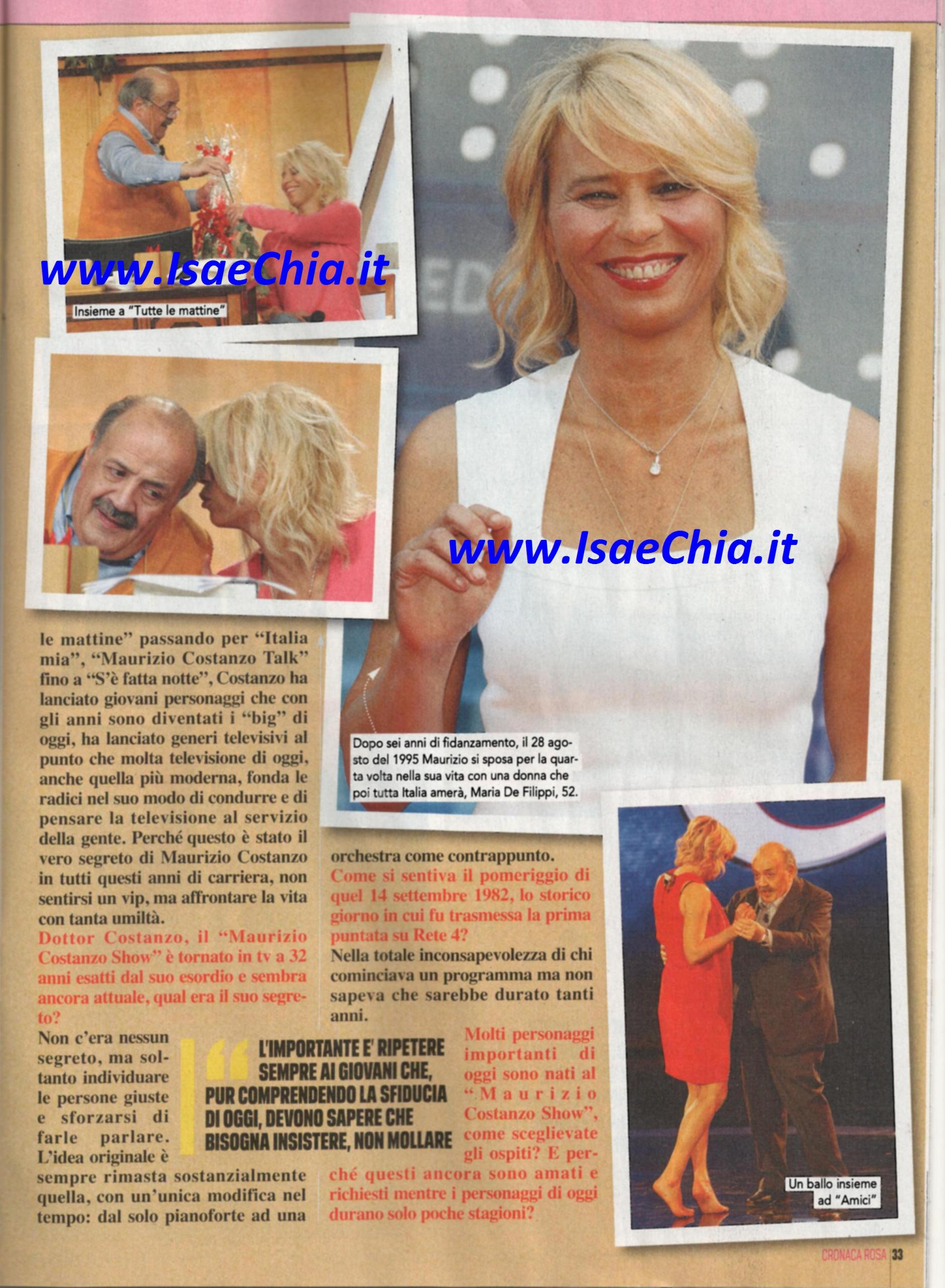 Il Maurizio Costanzo Show è tornato in tv a 32 anni esatti dal suo esordio. In oltre tre decenni in cui il conduttore ha scoperto grandi talenti e ha trattato gli argomenti più disparati, arrivando ad essere uno dei fondatori della tv moderna, Maurizio Costanzo svela che…”Non c’era nessun segreto, se non individuare le persone giuste e farle parlare. L’idea originale è stata sempre quella, con una sola modifica: l’introduzione di un’orchestra in aggiunta al pianoforte. Sceglievamo ospiti che intuivamo avessero la possibilità di andare avanti. Malgrado questo, molti comici che ho presentato poi sono “rimasti al palo”. Oggi la tv si è riempita di talk show perché costano poco: non c’è programma televisivo che costi meno”. Ripercorrendo la sua carriera, poi, spiega: “A 18 anni mi spinse verso il giornalismo una passione assoluta e totalizzante: non ho mai pensato di poter fare altro. Ai giovani di oggi consiglio grande perseveranza ed umiltà. Come ha fatto David Letterman, icona del talk show degli USA, anch’io ho deciso di interrompere la quotidianità del mio show”. Infine, parla del rapporto con sua moglie, Maria De Filippi, regina di Canale 5: “E’ stato importante incontrare una donna come lei, altrimenti non saremmo stati insieme per 19 anni. A chi la accusa di fare tv facile perché basata sul sentimento e sull’emozione facile, rispondo che le puntate di Uomini e donne dedicate agli anziani hanno un valore sociale nei confronti di una popolazione che è sempre più avanti negli anni”.