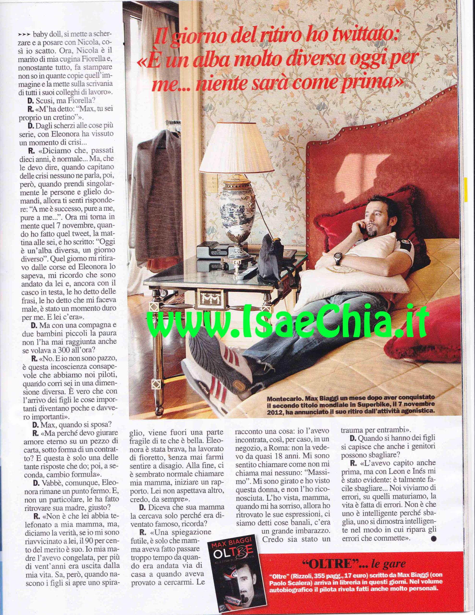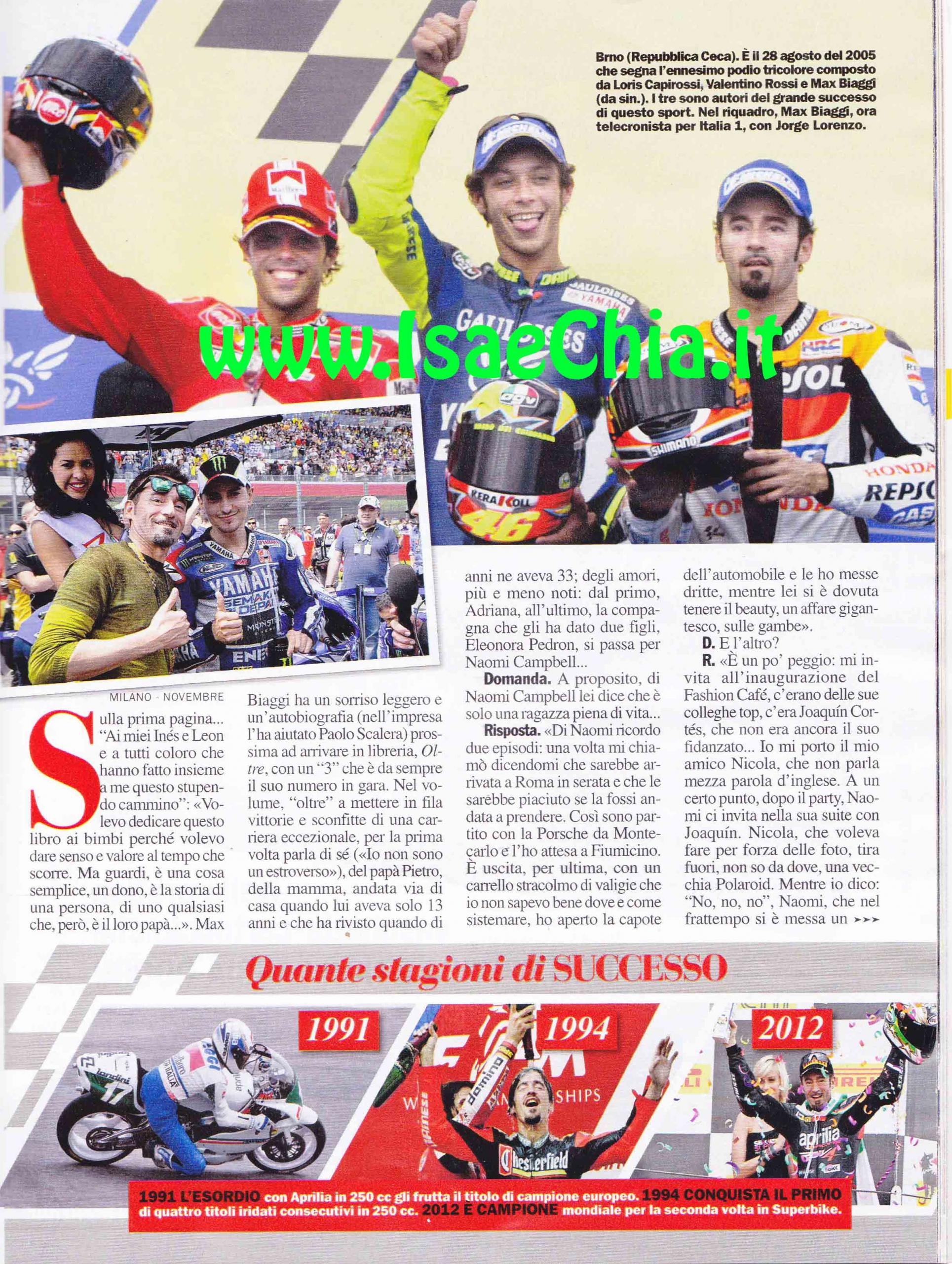 Tra poco arriverà in libreria Oltre, la biografia del motociclista Max Biaggi, in cui racconta della sua famiglia e dei suoi amori. In particolare, l’ultimo, quello con l’ex Miss Italia Eleonora Pedron, che gli ha dato due figli ai quali il libro è dedicato: “Della mia ex Naomi Campbell dico che è una ragazza piena di vita. Di lei ricordo due episodi: una volta mi chiamò e disse che sarebbe arrivata a Roma la sera e che le sarebbe piaciuto se fossi andata a prenderla. Aveva così tante valigie che non sapevo come sistemarle nella Porsche. E l’altro, è un po’ peggio: eravamo all’inaugurazione del Fashion Cafè Naomi ci invita nella suite con Joaquin Cortes. Il mio amico Nicola tira fuori una vecchia Polaroid e mi chiede di scattargli delle foto con lei, che nel frattempo aveva messo il babydoll”. Parlando invece della Pedron e della recente crisi, racconta: “Dopo dieci anni è normale. Delle crisi nessuno parla, ma poi quando sono presi singolarmente tutti dicono: “Ah a me è capitato”. Ricordo quel 7 novembre in cui ho scritto un tweet all’alba “Oggi è un giorno diverso”: ero andato da lei, dopo le corse, ancora col casco in testa e le avevo detto che mi faceva male. E’ stato un momento duro per me, e lei c’era”. Quando gli si chiede se ora che ha due figli ha avuto paura quando correva a 300 all’ora, risponde: “No, e io non sono un pazzo. E’ questa incoscienza consapevole che abbiamo noi piloti. Quando corri sei in una dimensione diversa. Grazie ad Eleonora ho ritrovato mia madre: io l’avevo congelata ed esclusa dalla mia vita da più di vent’anni. Ma quando nascono i tuoi figli, viene fuori una parte fragile di te. Eleonora ha lavorato di fioretto, senza farmi sentire a disagio, e alla fine mi è sembrato naturale chiamare mia madre. Mia mamma aveva fatto passare troppo tempo da quando sono andato via di casa a quando mi ha ricercato. Una volta ci siamo trovati in un negozio e lei mi ha chiamato come solo lei fa: “Massimo” e non l’avevo riconosciuta. Avevo già capito che i genitori possono sbagliare, ma con Leon e Ines è stato evidente. Noi viviamo di errori, la vita è fatta di errori. Ci si dimostra intelligenti per il modo in cui si rimedia agli errori fatti”.