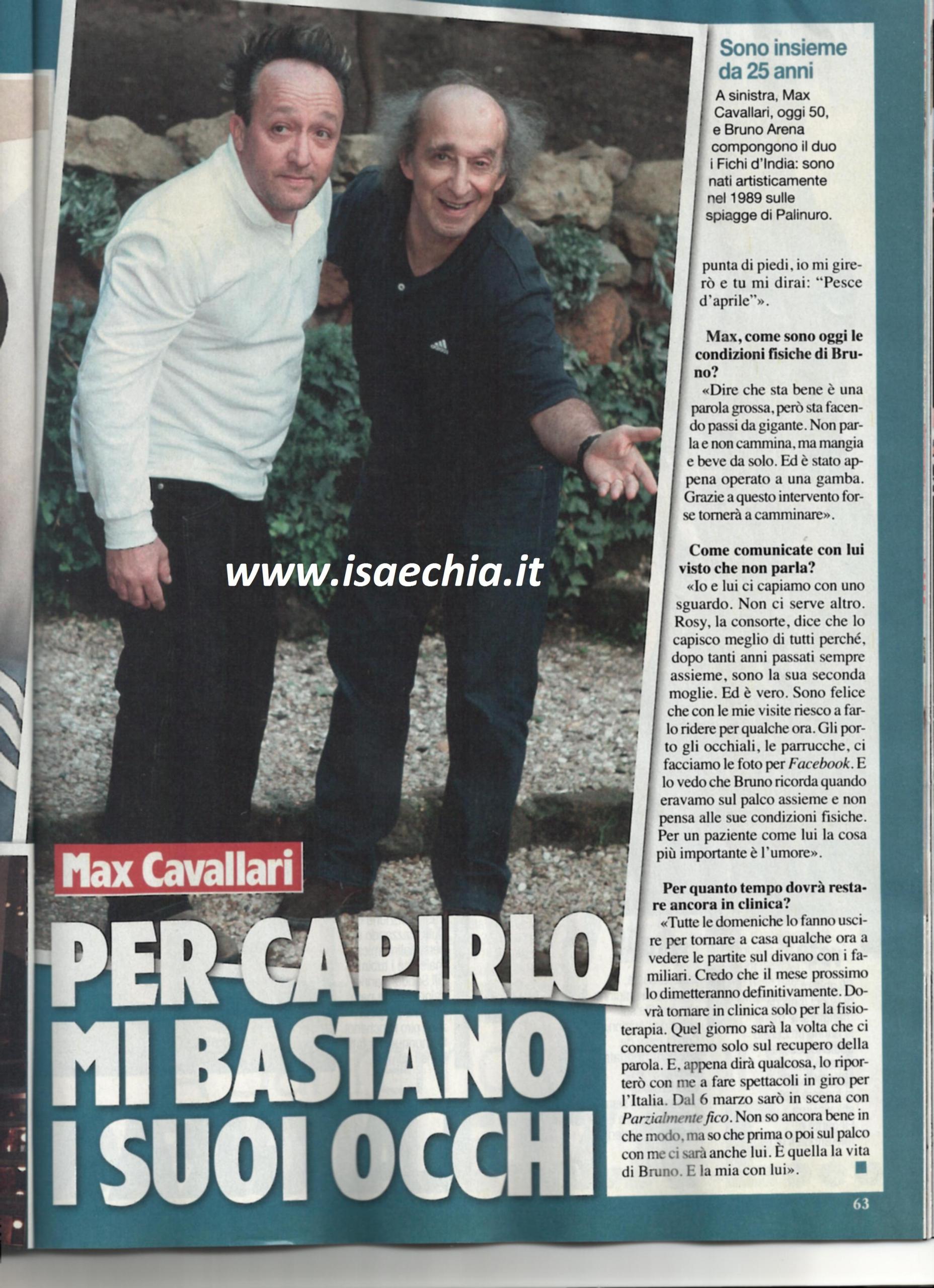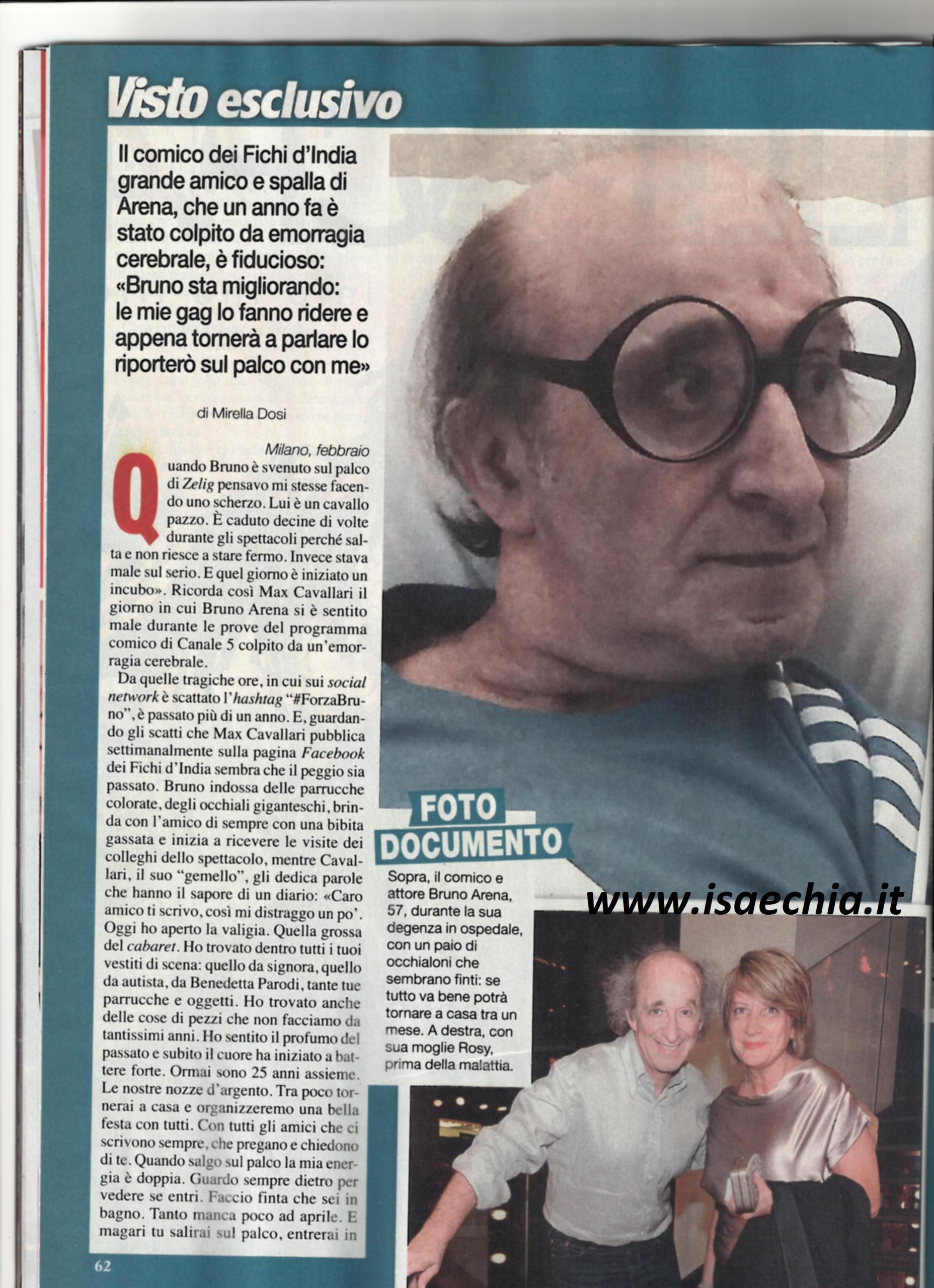 Max Cavallari dei Fichi d’India ricorda il momento in cui per il suo compagno Bruno Arena è iniziato un lungo calvario: “Quando è svenuto sul palco di Zelig, credevo stesse scherzando: sarà caduto decine di volte perché salta e non riesce a stare fermo. Invece stava male sul serio”. Da quel giorno tragico canale è passato un anno e, guardando le foto che Max pubblica ogni giorno sulla pagina Facebook dei Fichi d’India, le cose vanno molto meglio: “Caro amico ti scrivo, così mi distraggo un po’. Oggi ho aperto la nostra valigia, quella del cabaret e ho trovato tutti gli abiti da scena e i pezzi che non facciamo da anni. Ormai sono 25 anni insieme, le nostre nozze d’argento. Tra poco tornerai a casa e organizzeremo una bella festa. Quando salgo sul palco guardo sempre dietro per vedere se entri, faccio finta che sei in bagno. Tanto manca poco ad aprile, magari salirai sul palco con me e dirai: Pesce d’aprile!” ha scritto lui. “Dire che sta bene è una cosa grossa, ma fa passi da gigante. Non parla e non cammina, però mangia e beve da solo. E’ stato appena operato ad una gamba e forse grazie a quest’operazione riuscirà a camminare. Io e lui ci capiamo con uno sguardo. Rosy, la sua consorte, dice che lo capisco meglio di tutti, perché passando tutti i giorni con lui, io ero la sua seconda moglie. Con le mie visite, lo faccio ridere per qualche ora: gli porto parrucche, occhiali e ci facciamo le foto. Tutte le domeniche lo fanno uscire per fargli guardare la partita a casa coi familiari. Credo che il mese prossimo lo dimetteranno definitivamente e tornerà in clinica solo per la fisioterapia. Ci concentreremo sul recupero della parola e appena dirà qualcosa, lo porterò con me: il palco è la sua vita”.