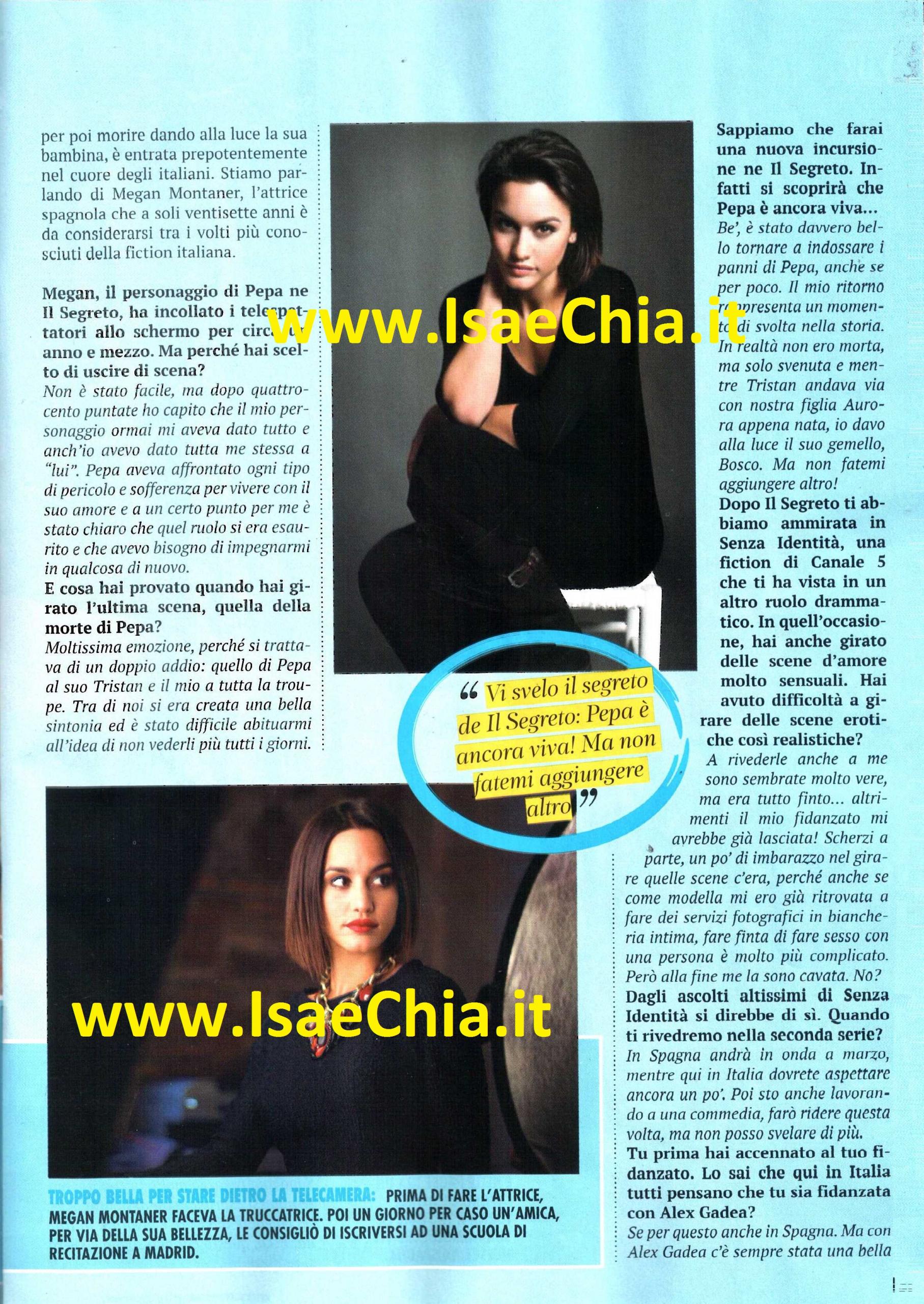 Il personaggio della levatrice Pepa nella fiction Il Segreto ha attirato tantissimi telespettatori ed è stato uno dei motivi del suo successo. Tuttavia, l’attrice Megan Montaner ha deciso di uscire di scena. Intervistata, la bella spagnola spiega: “Non è stato facile, ma dopo 400 puntate, ho capito che il mio personaggio aveva dato tutto e io avevo dato tutta me stessa a lui. Pepa aveva affrontato ogni tipo di pericolo e sofferenza per vivere con il suo amore Tristan e ad un certo punto è stato chiaro che per me quel ruolo si era esaurito e volevo impegnarmi in qualcosa di nuovo. Nel girare l’ultima scena, ho provato tanta emozione, perché si trattava di un doppio addio: quello di Pepa a Tristan e quello mio a tutta la troupe, abituarmi all’idea di non vederli più tutti i giorni. E’ stato davvero bello tornare a indossare i panni di Pepa, anche se per poco: il mio ritorno rappresenta un momento di svolta nella storia: in realtà non ero morta, ma svenuta, mentre Tristan portava via mia figlia Aurora e io davo alla luce un altro figlio, Bosco. Ma non fatemi aggiungere altro!“. Dopo Il Segreto, Megan ha preso parte ad un’altra fiction, Senza identità, andata in onda su Canale 5, nella quale ha girato anche delle scene d’amore molto sensuali: “A rivederle anche a me sembrano molto vere, ma era tutto finto! Altrimenti il mio fidanzato mi avrebbe già lasciata! Scherzi a parte, un po’ d’imbarazzo c’era, perché anche se come modella avevo posato in biancheria intima, fare finta di fare sesso con una persona è molto più complicato. La seconda stagione andrà in onda a marzo in Spagna, in Italia dovrete aspettare un po’. Poi sto lavorando a una commedia, stavolta vi farò ridere“. Ritornando però sul suo fidanzato, quando le si fa notare che in Italia tutti pensano che stia con Alex Gadea, l’attore di Tristan, anche nella vita reale, lei risponde: “Se è per questo, anche in Spagna! Ma tra noi c’è solo amicizia, per me lui è quasi un fratello. Il mio fratello si chiama Gorka Ortuzar, fa il biologo. Stiamo insieme da due anni e siamo molto innamorati. Sono una ragazza molto fortunata, ma se potessi esprimere un desiderio, vorrei chiedere di venire a lavorare in Italia. Ecco, questo è il mio sogno e spero si realizzi“.