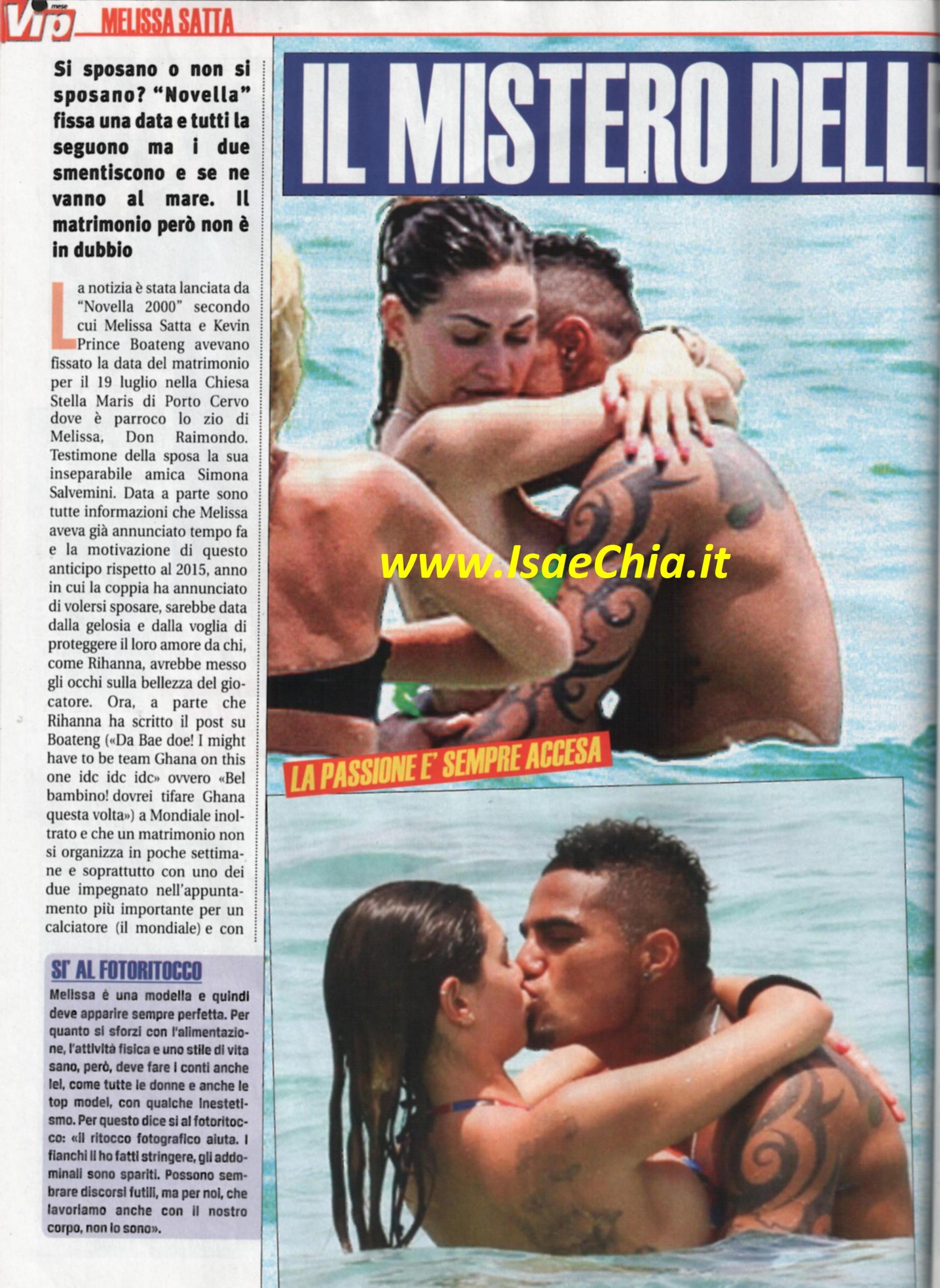 Secondo il giornale Novella 2000, Melissa Satta e Kevin Prince Boateng si sarebbero dovuti sposare il 19 luglio, presso la chiesa Stella Maris di Porto Cervo, il cui parroco, don Raimondo, è lo zio dell’ex Velina. La testimone della sposa sarebbe l’amica Simona Salvemini, concorrente del Grande fratello 6 (durante il quale si fidanzò con Filippo Bisciglia). Motivo dell’anticipazione del matrimonio, che inizialmente era previsto per il 2015, sarebbe stata la gelosia della Satta, scoppiata ancor di più quando la cantante Rihanna ha fatto degli apprezzamenti su Boa. Ma queste si sono rivelate solo voci: un matrimonio non si organizza nel giro di poche settimane e a causa di un tweet, e soprattutto mentre uno dei due è impegnato nei Mondiali di calcio! “Non ne so nulla” ha commentato ironica l’ex Velina, che infatti se n’è andata in vacanza: “Ho prenotato da mia mamma: passeremo le vacanze in Sardegna e dovrà sopportarci per un po’!”. Anche il matrimonio sarà in Sardegna, ma non sarà celebrato per ora: “Ora che Kevin ha avuto il divorzio, siamo entrambi liberi e ci sposeremo entro il 2015, in Sardegna. Magari Rihanna verrà a cantare al matrimonio! Sai che colpaccio! E dopo penseremo a un fratellino per Maddox. Ho ripreso a lavorare perché avevo degli accordi presi ben prima di restare incinta. Se potessi tornare indietro, aspetterei un po’! Ho preso 11 chili, i miei fianchi si sono allargati e ho preso due taglie di seno, per la gioia di Kevin e dell’azienda di intimo!” ha raccontato lei.
