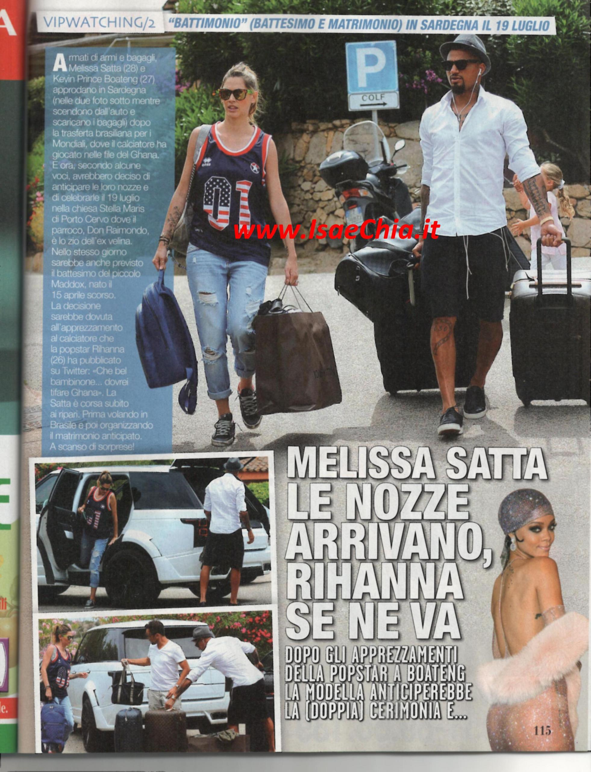 Dopo la trasferta in Brasile per i Mondiali di calcio, Kevin Prince Boateng e Melissa Satta sono rientrati in Sardegna, la terra di lei. E pare che avrebbero deciso di anticipare le loro nozze, al 19 luglio nella chiesa Stella Maris di Porto Cervo, il cui parroco, don Raimondo, è lo zio dell’ex Velina. Nello stesso giorno, inoltre, sarebbe previsto il battesimo del piccolo Maddox, nato lo scorso 15 aprile. Secondo alcuni, la decisione sarebbe dovuta all’apprezzamento che ha fatto la cantante di fama internazionale Rihanna su Boateng: “Che bel bambinone! Dovrei tifare Ghana” ha twittato lei…E la Satta è corsa subito ai ripari, così, per evitare sorprese!