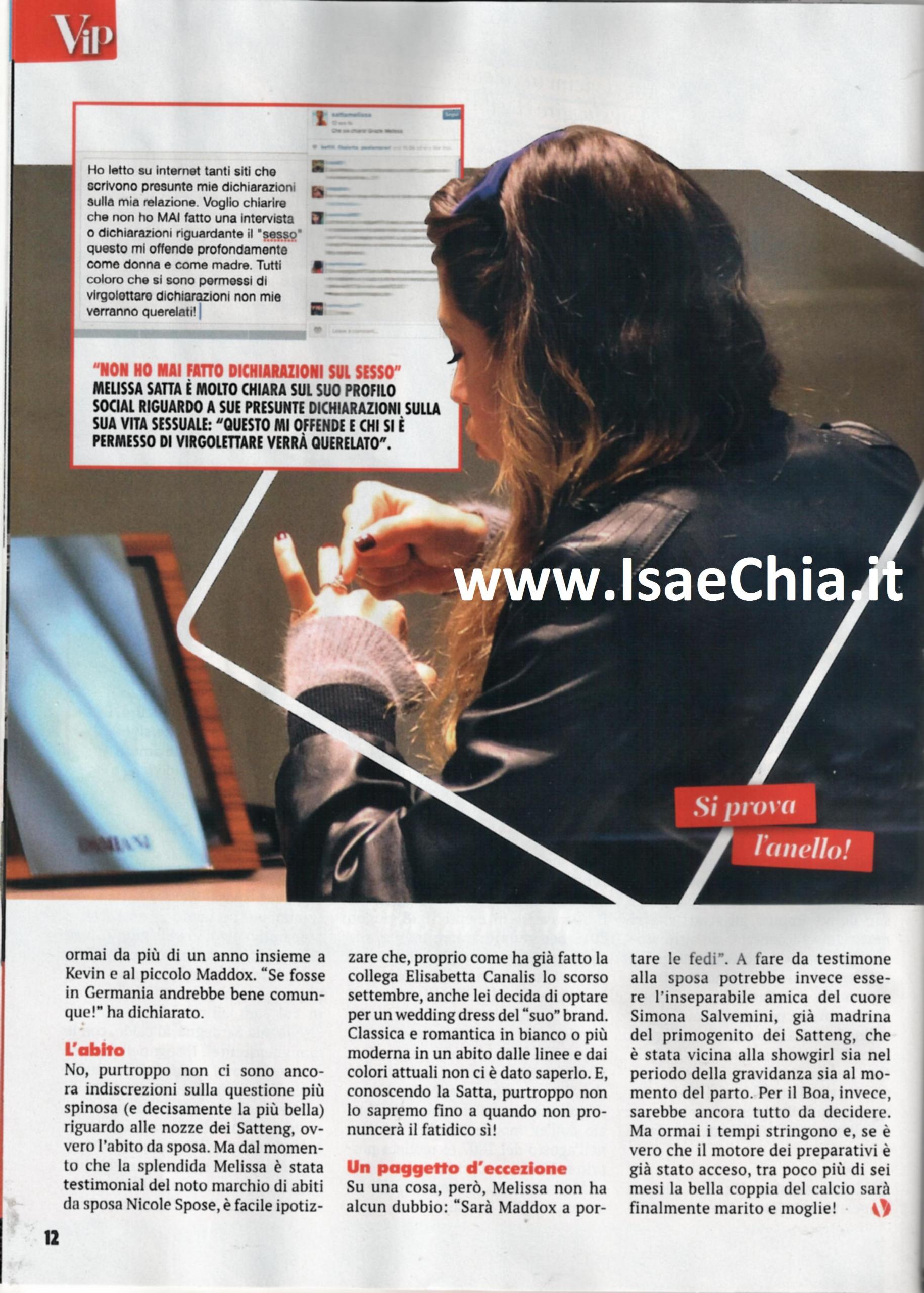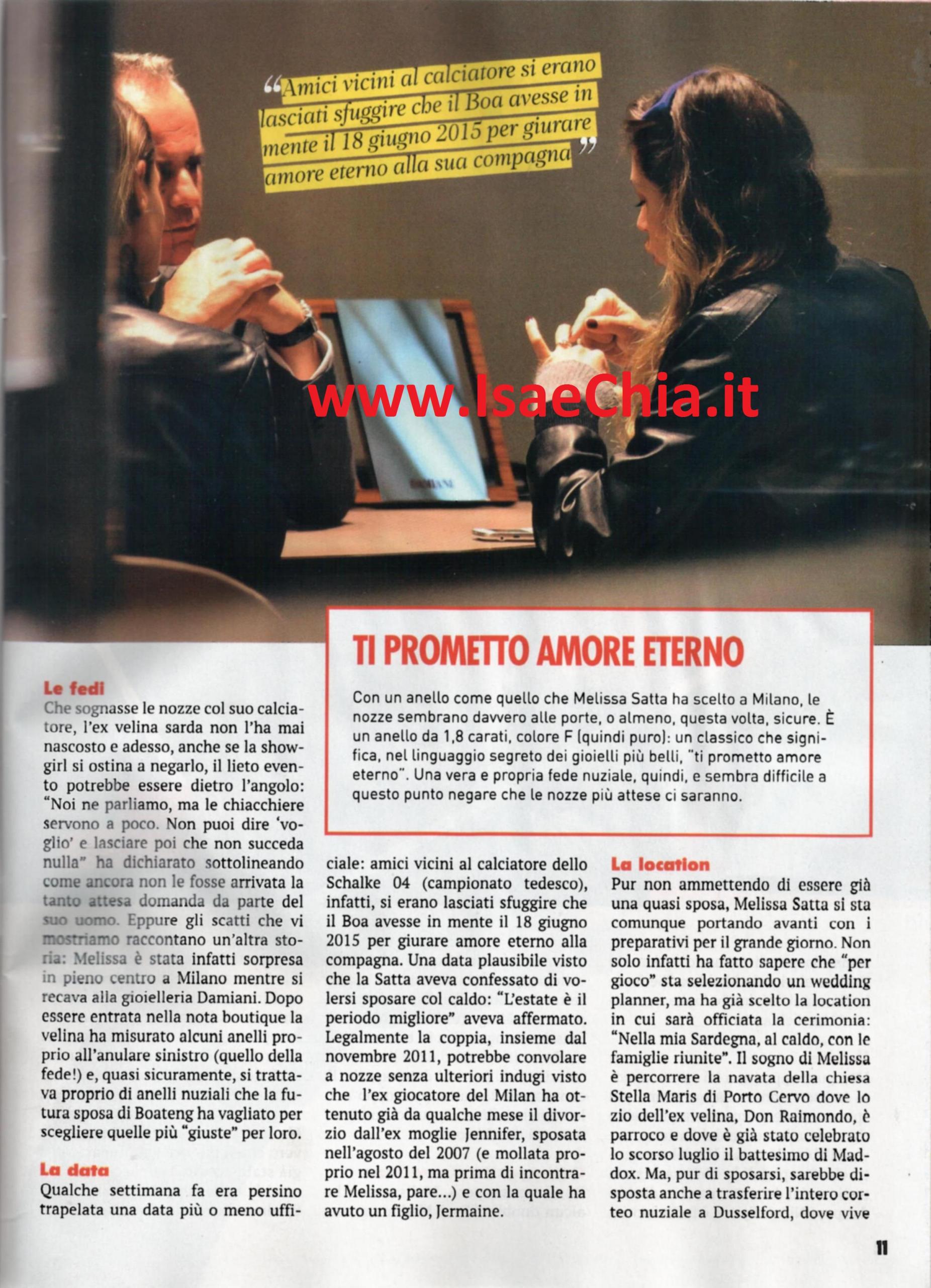 Secondo quanto pubblicato da una testata, l’ex Velina Melissa Satta e il suo compagno Kevin “Prince” Boateng farebbero scintille a letto e avrebbero una vita sessuale piuttosto movimentata: nonostante la nascita del loro piccolo Maddox Prince, infatti, la bella sarda riuscirebbe a far impazzire il suo uomo sotto le lenzuola anche più di prima. Ma su una mancanza di rispetto su temi così intimi, la Satta è pronta ad agire per vie legali. “Voglio chiarire che non ho mai un’intervista o dichiarazioni riguardanti il sesso. Questo mi offende profondamente come donna e come madre. Tutti coloro che si sono permessi di virgolettare dichiarazioni non mie verranno querelati” minaccia lei sui social. Per fortuna, al momento, ha cose più gradevoli a cui pensare, come i preparativi per il matrimonio. Pare, infatti, che sia finalmente arrivata la proposta ufficiale da parte del Boa. Le foto di Melissa che sceglie l’anello parlano chiaro! Nella gioielleria Salvini al centro di Milano, infatti, ha misurato alcuni anelli proprio all’anulare sinistro e pare che uno tra quelli sarà il prescelto come anello di nozze. Qualche settimana fa era perfino trapelata qualche data per la celebrazione delle loro nozze: un collega di Boateng si è fatto sfuggire che si tratta del 18 giugno 2015. Melissa, infatti, aveva dichiarato di volersi sposare “nella mia Sardegna, col caldo, e con le famiglie riunite”. Il suo sogno è percorrere la navata della chiesa Stella Maris di Porto Cervo, dove lo zio di Melissa è parroco e dove hanno battezzato il piccolo Maddox. Infine, l’abito. Non si sa ancora quale sarà il modello, ma Melissa è testimonial della marca di abiti nuziali Nicole spose ed è ipotizzabile che, proprio come la collega Elisabetta Canalis, sceglierà un abito del suo brand. L’unica certezza? Il paggetto: “Sarà Maddox a portare le fedi”.
