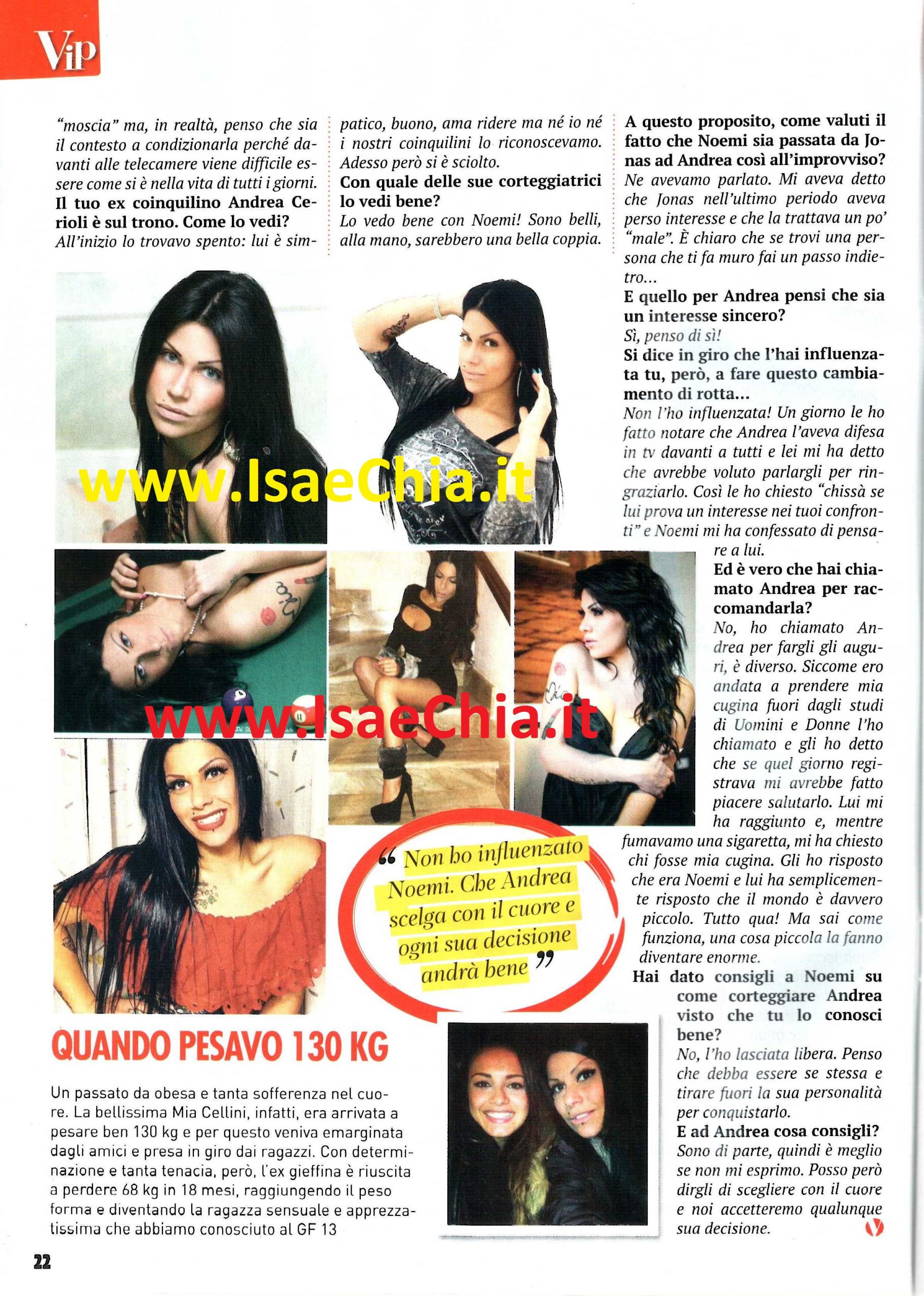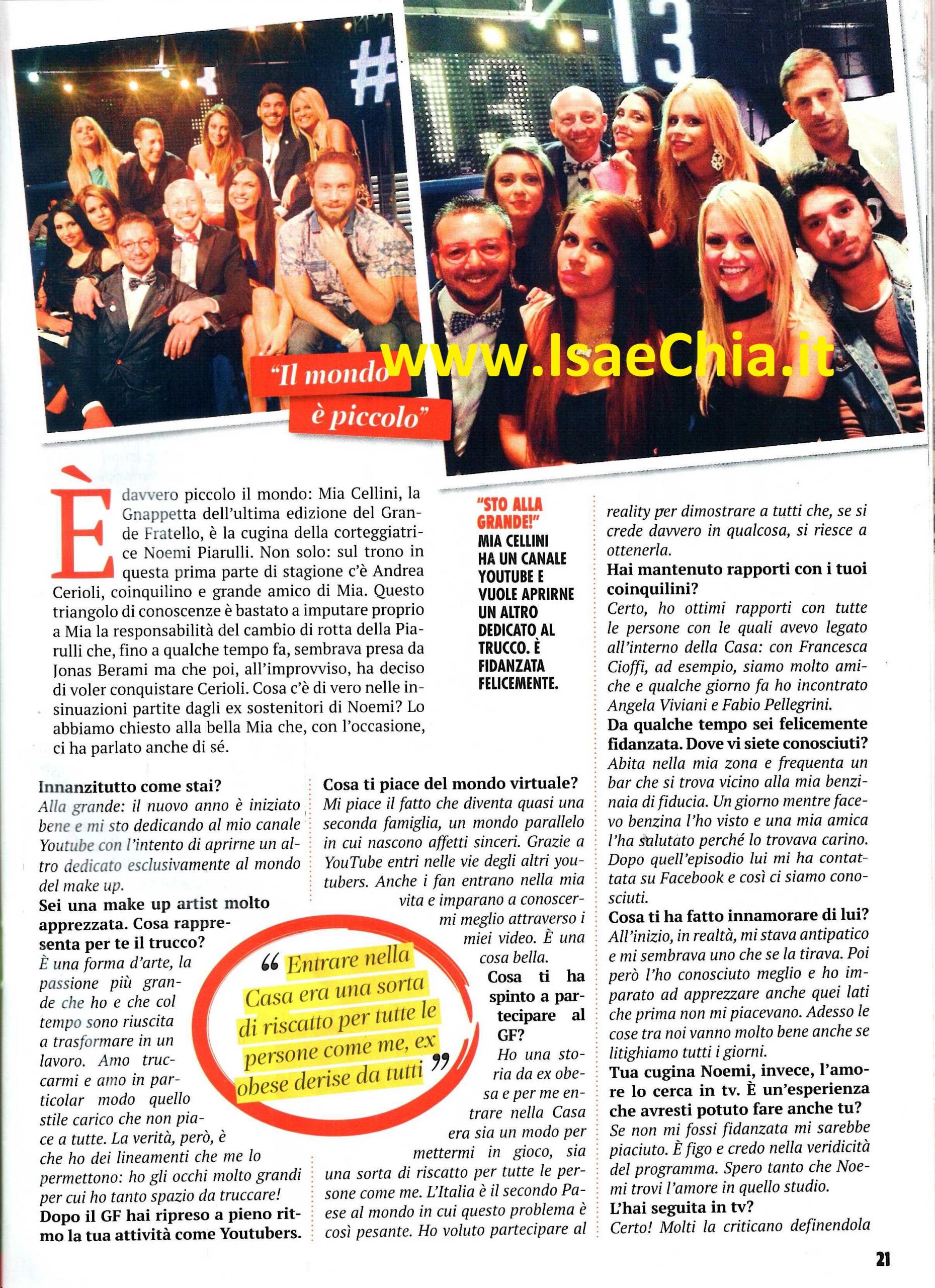 La concorrente del Grande fratello 13 Mia Cellini è recentemente tornata al centro del gossip per essersi rivelata la cugina della corteggiatrice Noemi Piarulli. Quest’ultima, dopo aver trascorso un primo periodo a Uomini e Donne nel quale ha conosciuto il tronista Jonás Berami, ha improvvisamente confessato di cominciare a provare interesse per Andrea Cerioli, che, fino a pochi mesi fa, era stato nella Casa più spiata d’Italia proprio con Mia. Adesso la truccatrice, protagonista di molti video tutorial su Youtube, alla quale è stata anche attribuita la responsabilità del “cambio di rotta” di Noemi, spiega tutto: “Io e mia cugina ne avevamo parlato. Mi aveva detto che Jonás nell’ultimo periodo aveva perso d’interesse e che la trattava male. E’ chiaro che se trovi una persona che ti fa un muro, fai un passo indietro. L’interesse per Andrea è sincero. Io non l’ho influenzata. Un giorno le ho fatto notare che Andrea l’aveva difesa davanti a tutti e lei mi ha detto che avrebbe voluto parlargli per ringraziarlo. Così le ho chiesto ‘Chissà se lui prova interesse nei tuoi confronti’ e Noemi mi ha confessato di pensare a lui. Non ho chiamato Andrea per raccomandarla, ma per fargli gli auguri. Siccome ero andata a prendere mia cugina fuori gli studi di Uomini e Donne, l’ho chiamato e gli ho detto che mi faceva piacere salutarlo. Lui mi ha raggiunto e, fumando una sigaretta, mi ha chiesto chi fosse mia cugina. Io gli ho detto che era Noemi e lui ha risposto che il mondo era davvero piccolo. Tutto qua! Non ho dato consigli a Noemi, l’ho lasciata libera perché credo che debba essere se stessa e tirar fuori la sua personalità per conquistarlo. E’ stata accusata di essere moscia, ma penso che siano il contesto e le telecamere a condizionarla. La vedo bene con Andrea, sono belli, alla mano, una bella coppia!“. Peccato, però, che nel tempo intercorso tra questa intervista e la successiva registrazione, Andrea abbia deciso di non tenere più Noemi tra le sue corteggiatrici, per concentrarsi solo su Valentina Rapisarda e Sharon Bergonzi! Per quanto riguarda la sua vita privata, Mia racconta i cambiamenti dell’ultimo periodo: “Il nuovo anno è iniziato alla grande, mi sto dedicando al mio canale Youtube, con l’intenzione di aprirne un altro, tutto dedicato al mondo del make-up. Grazie a Youtube entri nelle vite degli altri youtubers e anche i fan entrano nella mia. Ero entrata nella Casa per avere una sorta di rivincita sulla mia obesità del passato. Ora ho ancora ottimi rapporti con i miei ex coinquilini, come la mia amica Francesca Cioffi, o Angela Viviani e Fabio Pellegrini, che ho visto pochi giorni fa. Da qualche tempo sono anche felicemente fidanzata: abita nella mia zona e un giorno, mentre facevamo benzina, una mia amica l’ha salutato perché lo trovava carino. Dopo quell’episodio, lui mi ha contattata su Facebook e così ci siamo conosciuti. All’inizio mi stava antipatico, mi sembrava uno che se la tirava. Poi, ho imparato ad apprezzare anche i lati di lui che non mi piacevano e ora le cose tra noi vanno molto bene…Anche se litighiamo tutti i giorni!“