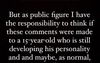 Alcune persone pensano che solo perché mi hanno visto in tutto il mondo con un film sappiano tutto di me. In realtà non sanno nulla. Perché insultare qualcuno che non ti ha mai fatto del male? Ho un carattere davvero forte. Sono un uomo che sa quello che vuole e non me ne frega niente. Ma come personaggio pubblico ho la responsabilità di pensare se questi commenti fossero stati fatti ad un quindicenne che sta ancora sviluppando la sua personalità. E magari, come è normale che sia, non è ancora mentalmente forte da fregarsene un ca*zo dei commenti cattivi. Cosa succederebbe?