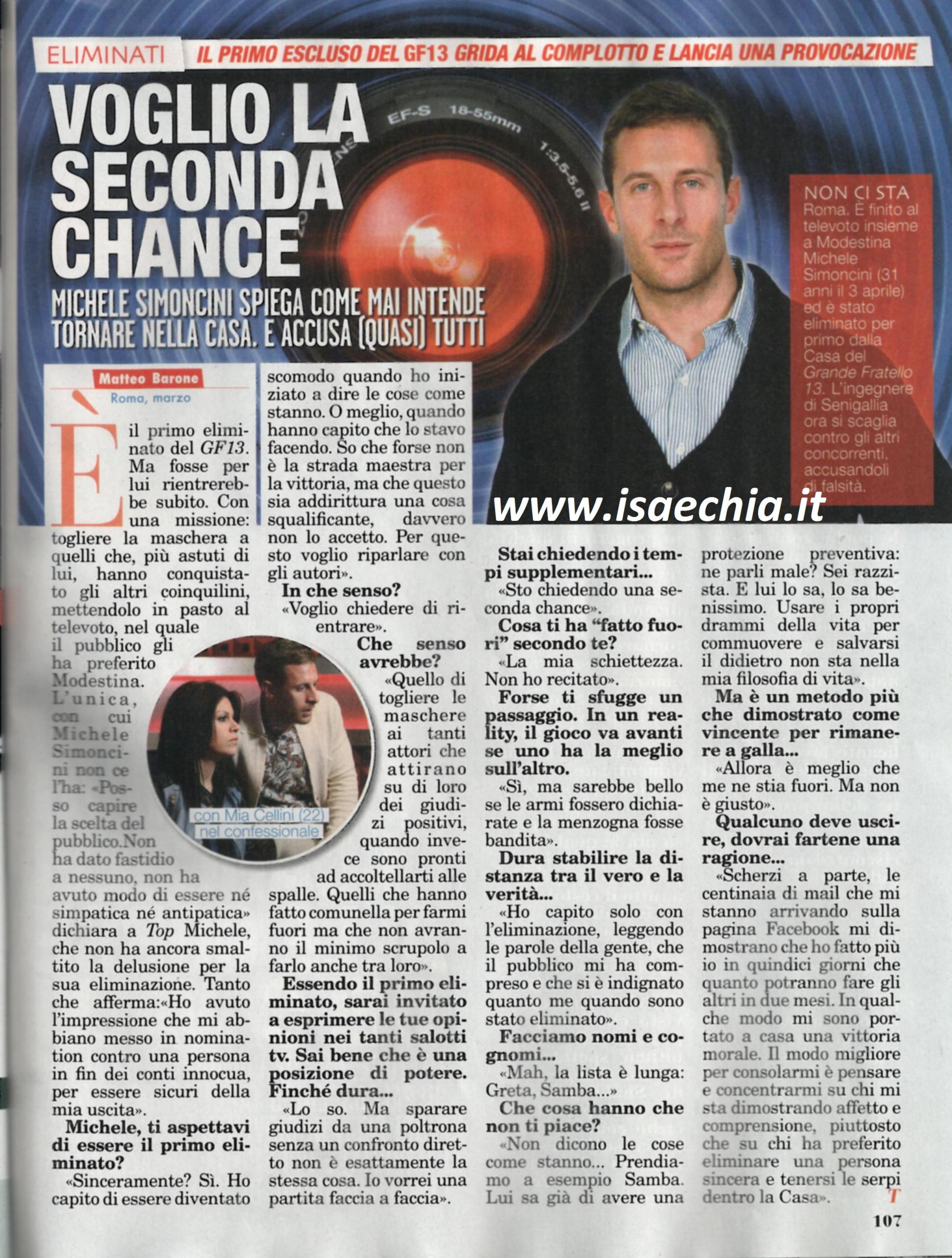 Michele Simoncini, primo eliminato del Grande fratello 13, non si arrende di fronte alla nomination dei coinquilini prima e all’eliminazione da parte del pubblico in secondo luogo: “Posso capire la scelta del pubblico di salvare Modestina Cicero: non ha dato fastidio a nessuno, non ha dato modo di essere né simpatica né antipatica. Io ho capito di esser diventato scomodo quando ho cominciato a dire le cose come stavano, o meglio, quando hanno capito che lo stavo facendo. So che questa non è la strada per la vittoria, ma che sia addirittura una cosa squalificante, non lo accetto! Per questo voglio parlare con gli autori e voglio chiedere di rientrare. Potrei togliere le maschere a tanti attori che attirano su di loro giudizi positivi, mentre sono stati pronti ad accoltellarti alle spalle. Quelli che hanno fatto comunella per farmi fuori lo faranno anche tra di loro”. Quando gli si fa notare che però, essendo il primo eliminato, sarà invitato più a lungo nei salotti tv, risponde: “Lo so, ma sparare giudizi da una poltrona e dirlo in faccia non è esattamente la stessa cosa. Sto chiedendo una seconda chance. Ho capito solo leggendolo una volta fuori, che il pubblico mi ha compreso e si è indignato della mia eliminazione. La mia lista è lunga: Greta Maisto, Samba Laobe Ndiaye...Quest’ultimo sa già di avere una protezione preventiva: ne parli male? Sei razzista. Usare i propri drammi per commuovere e salvarsi il didietro non sta nella mia filosofia di vita. Le e-mail che ho ricevuto su Facebook mi hanno dimostrato che ho dato più io in due settimane di quanto altri possano fare in due mesi. Il modo migliore per consolarmi è pensare a chi mi dimostra affetto e comprensione, e non a chi ha preferito eliminare una persona semplice e tenere le serpi!”