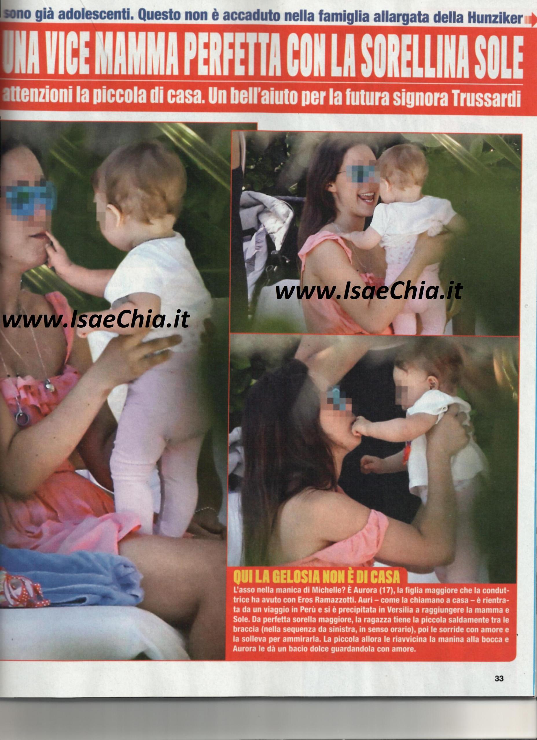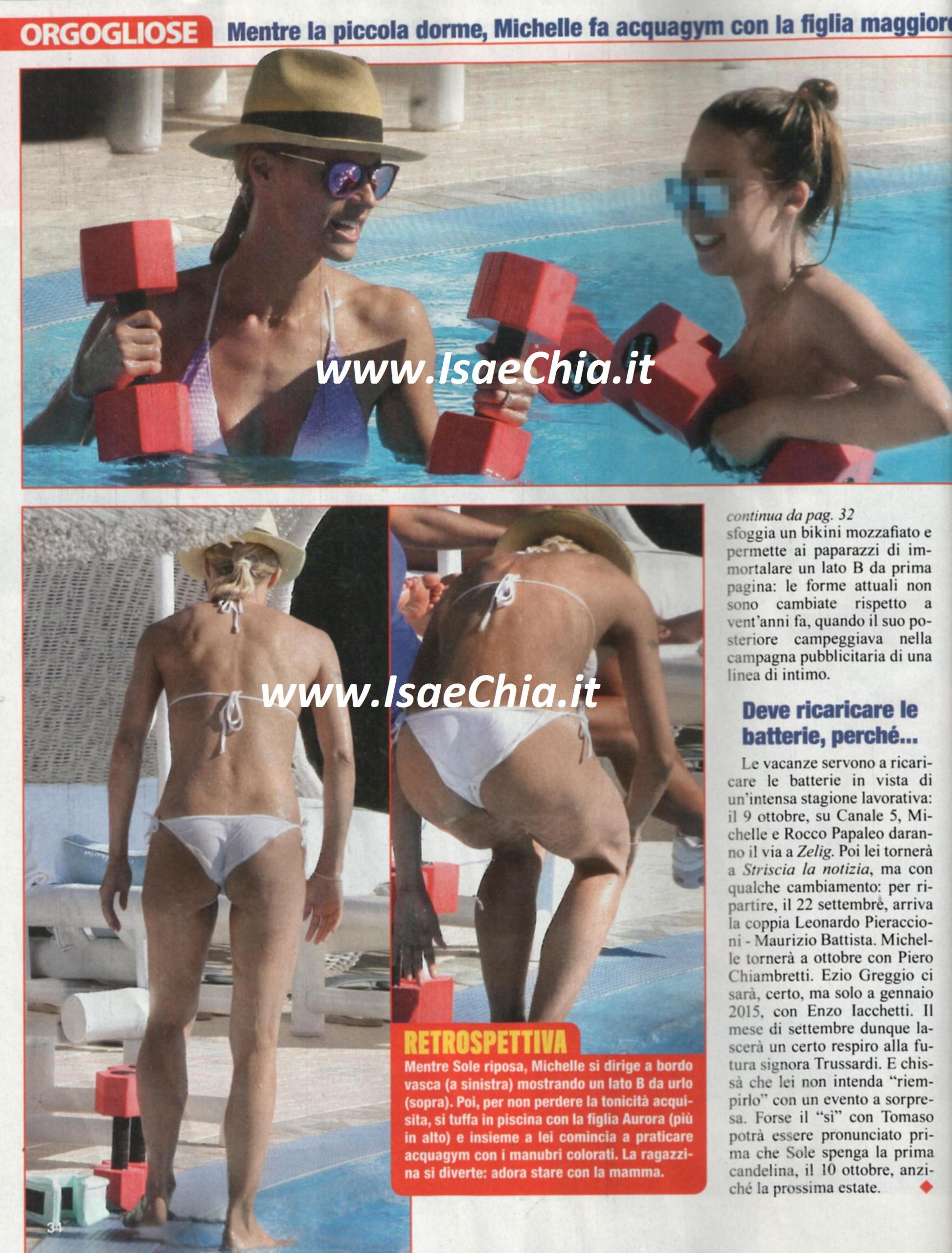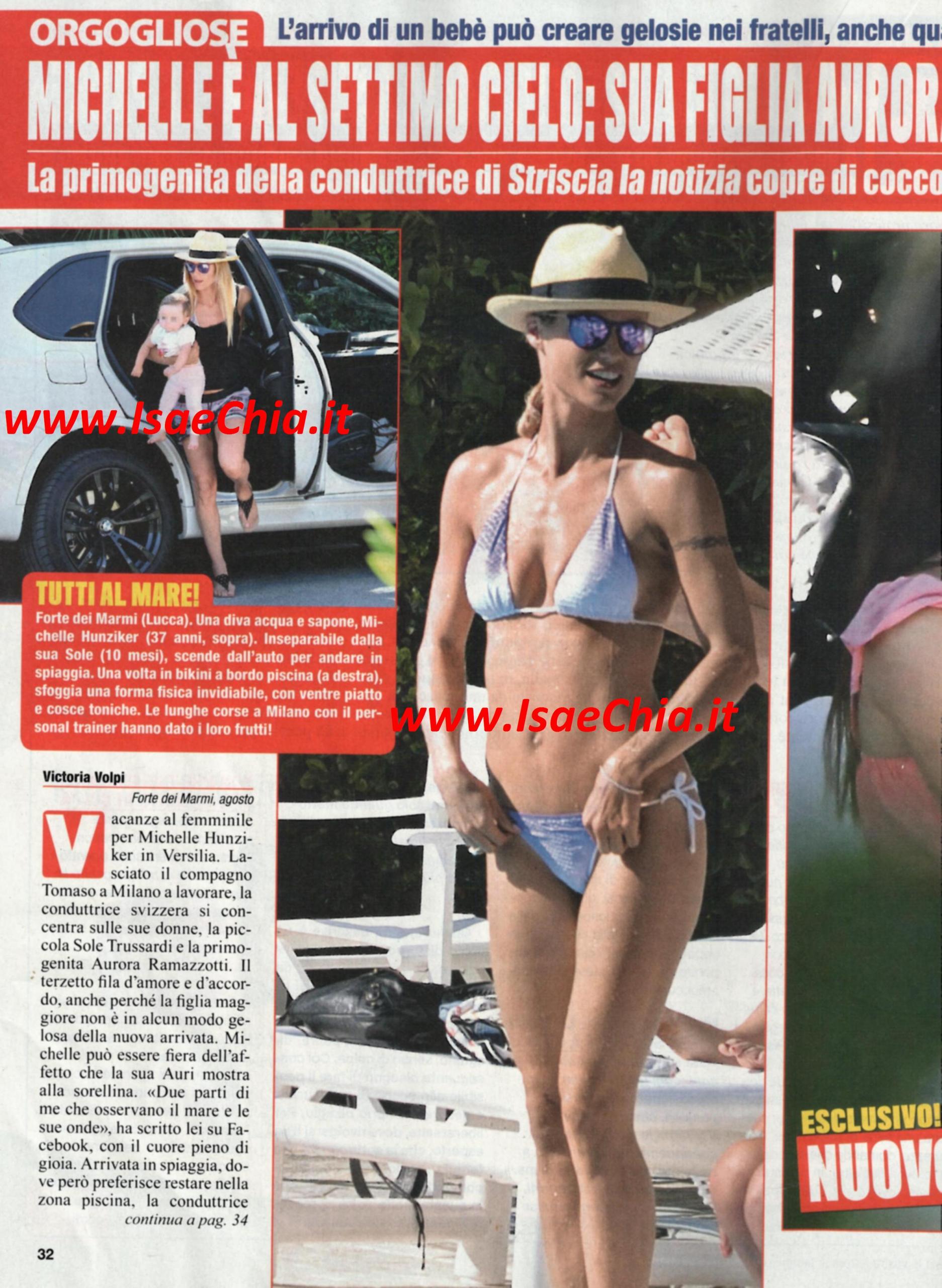 Vacanza in Versilia tutta al femminile per Michelle Hunziker: ecco la conduttrice trentasettenne a Forte dei Marmi in compagnia delle sue due figlie, Aurora, ormai quasi maggiorenne, e Sole, di pochi mesi. Il terzetto fila d’amore e d’accordo, dato che la maggiore non è in alcun modo gelosa della nuova arrivata: “Due parti di me che osservano il mare e le sue onde” è infatti la frase che la bionda svizzera ha condiviso su Facebook. Auri (come la chiamano a casa) è appena tornata da un viaggio in Perù e recupera il tempo perso con la sorellina: la tiene in braccio, la ammira, ci gioca. Le tre arrivano sulla spiaggia, anche se Michelle preferisce restare in piscina, e sfoggia un costume bianco che mette in evidenza le sue forme, rimaste invariate rispetto a vent’anni fa, quando il suo lato B era protagonista di uno spot di intimo. Il 9 ottobre sarà a Zelig in compagnia di Rocco Papaleo e poi darà il cambio, insieme a Piero Chiambretti, a Leonardo Pieraccioni e Maurizio Battista a Striscia. E poi? Poi forse avrà finalmente il tempo per organizzare l’atteso matrimonio con Tomaso Trussardi…