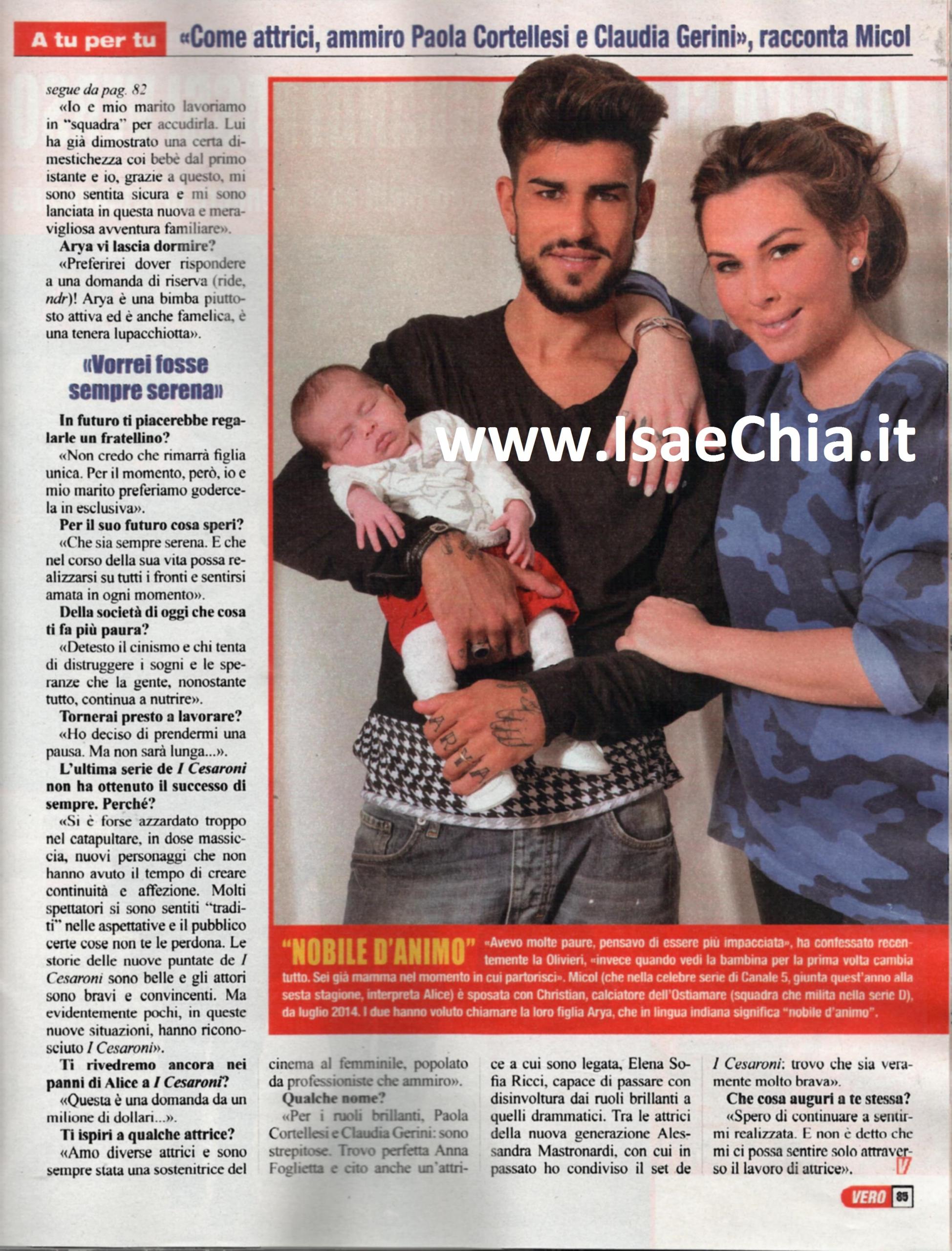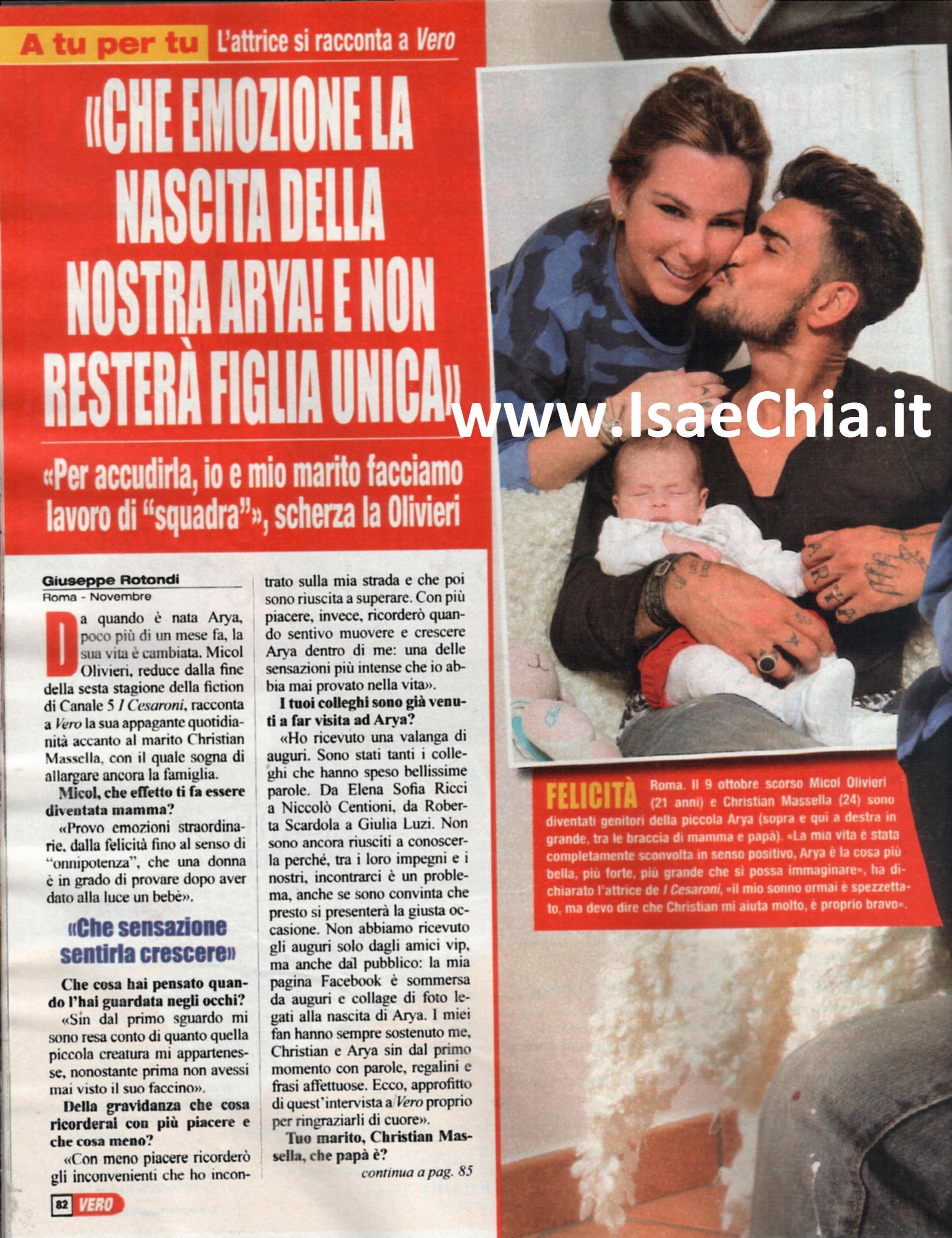 L’attrice Micol Olivieri, nota al grande pubblico soprattutto per il ruolo di Alice girato nella serie I Cesaroni, è appena diventata mamma della piccola Arya, che presenta in questi scatti con lei e il marito Christian Massella. “Provo emozioni straordinarie, dalla felicità al senso di onnipotenza che una donna ha quando è in grado di dare alla luce un bebé. Sin dal primo sguardo ho sentito che quella creatura mi apparteneva, nonostante non conoscessi quel faccino. Sentirla crescere dentro di me è una delle sensazioni più intense che abbia provato nella mia vita. Con meno piacere ricorderò, invece, gli inconvenienti che ho trovato sulla mia strada”. Quando le si chiede se i colleghi le hanno fatto gli auguri, risponde: “Ho ricevuto una valanga di auguri, da Elena Sofia Ricci a Nicolò Centioni, da Roberta Scardola a Giulia Luzi. Non sono ancora riusciti a conoscere Arya, perché tra i loro impegni e i nostri, incontrarci è un problema. Inoltre, abbiamo ricevuto gli auguri anche dai nostri ammiratori sulla pagina Facebook e approfitto di questa intervista per ringraziarli di cuore”. Quando le si chiede che tipo di padre è Christian, risponde: “Io e lui lavoriamo di squadra per accudirla: lui ha mostrato dimestichezza col bebè sin dal primo momento e io, grazie a questo, mi sono sentita sicura e mi sono lanciata in questa nuova vita familiare. E’ una bambina vivace e non dorme di notte, ma non rimarrà figlia unica. Per il momento, però, preferiamo godercela in esclusiva. Per il suo futuro, spero sia sempre serena, che possa realizzarsi e sentirsi sempre amata. Del mondo di oggi detesto il cinismo e il voler distruggere i sogni altrui. Tornare a lavorare? Per ora mi prendo un pausa, ma non sarà lunga”. E, a proposito, quando le si chiede se sarà ancora Alice ne I Cesaroni, risponde: “Questa è una domanda da un milione di dollari! Quest’anno la fiction non ha avuto lo stesso successo; credo sia dovuto al fatto che i nuovi personaggi siano stati “catapultati”, senza poter creare una continuità e un’affezione. Molti spettatori si sono sentiti “traditi” nelle aspettative e il pubblico non perdona. Evidentemente, in quelle situazioni, pochi hanno riconosciuto I Cesaroni”.